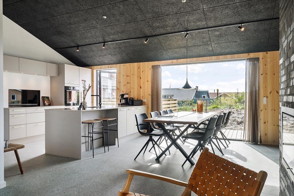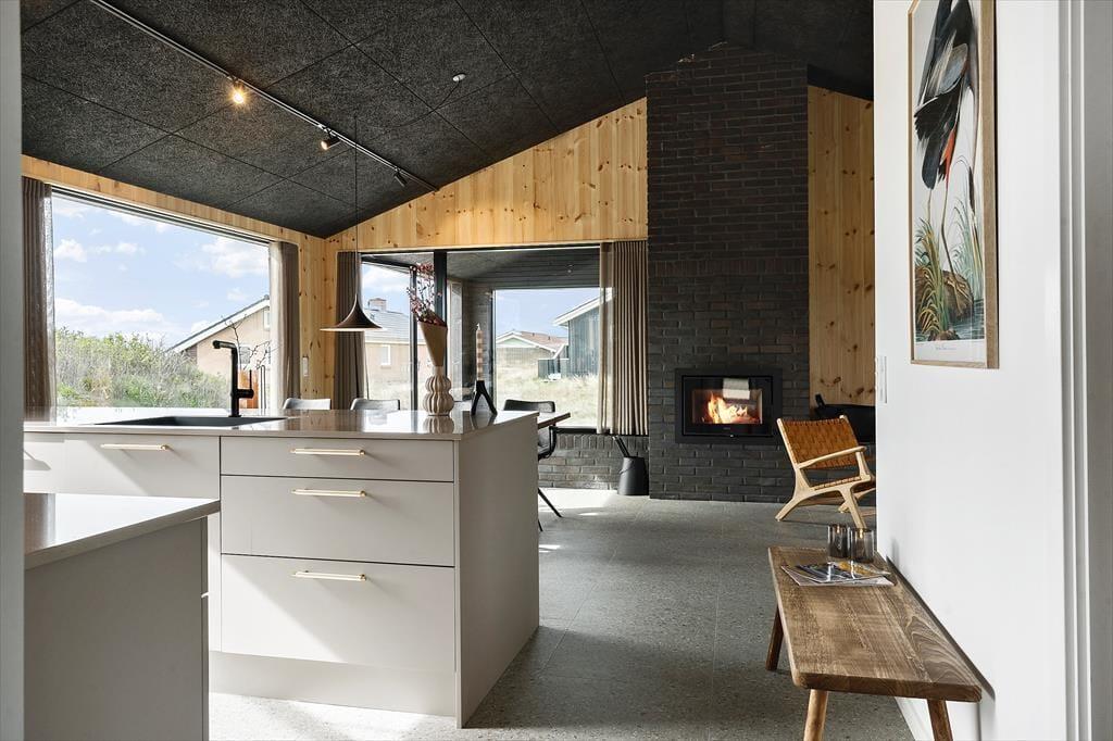 Inden døre sørger vinduerne for et skønt lysindfald, der går perfekt i spænd med rummenes moderne møblement og mange lækre detaljer. En brændeovn sørger for at sprede varme og hygge i opholdsafdelingen, hvor stuen og køkkenet er forenet – og hvis det er køligt udenfor, er der for øvrigt gulvvarme overalt i huset.