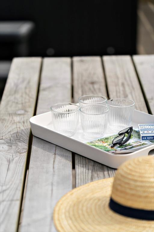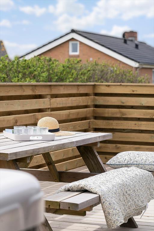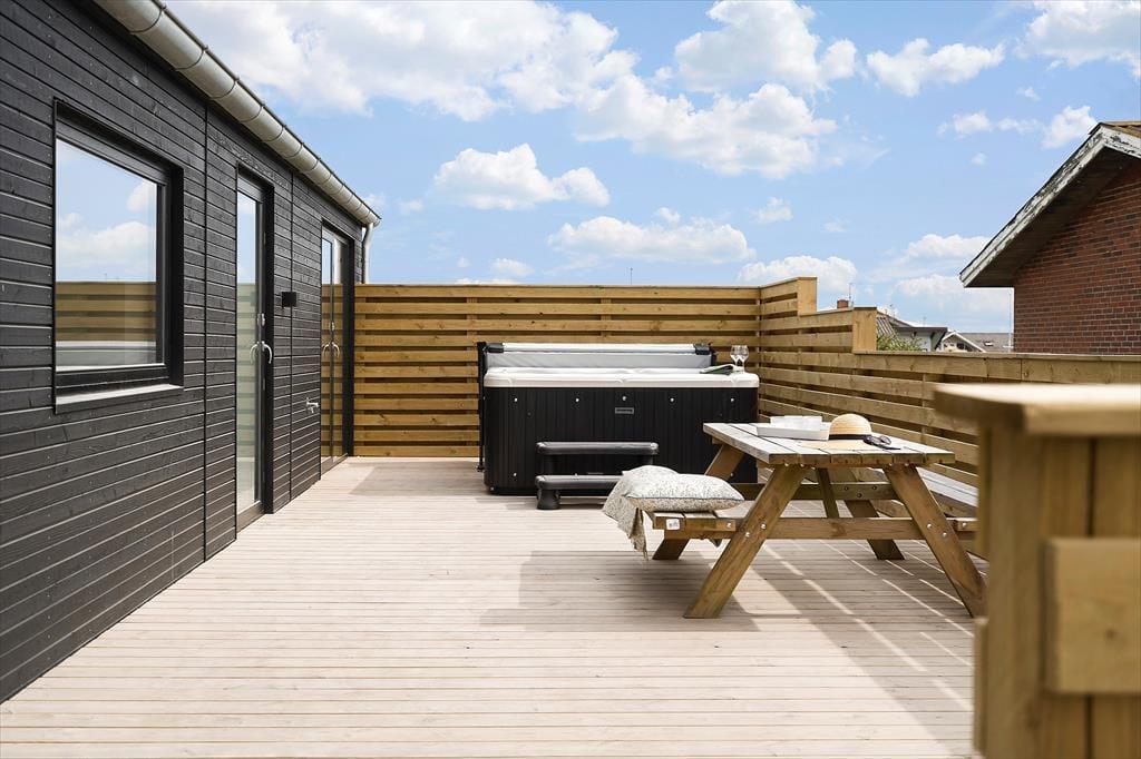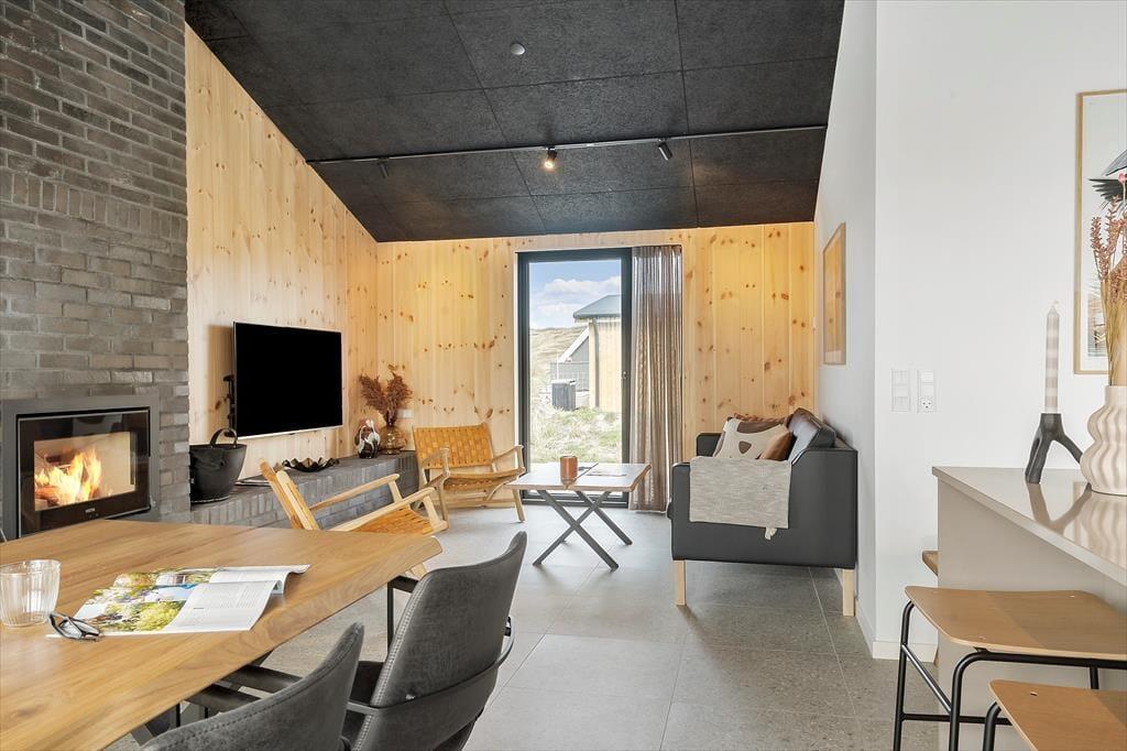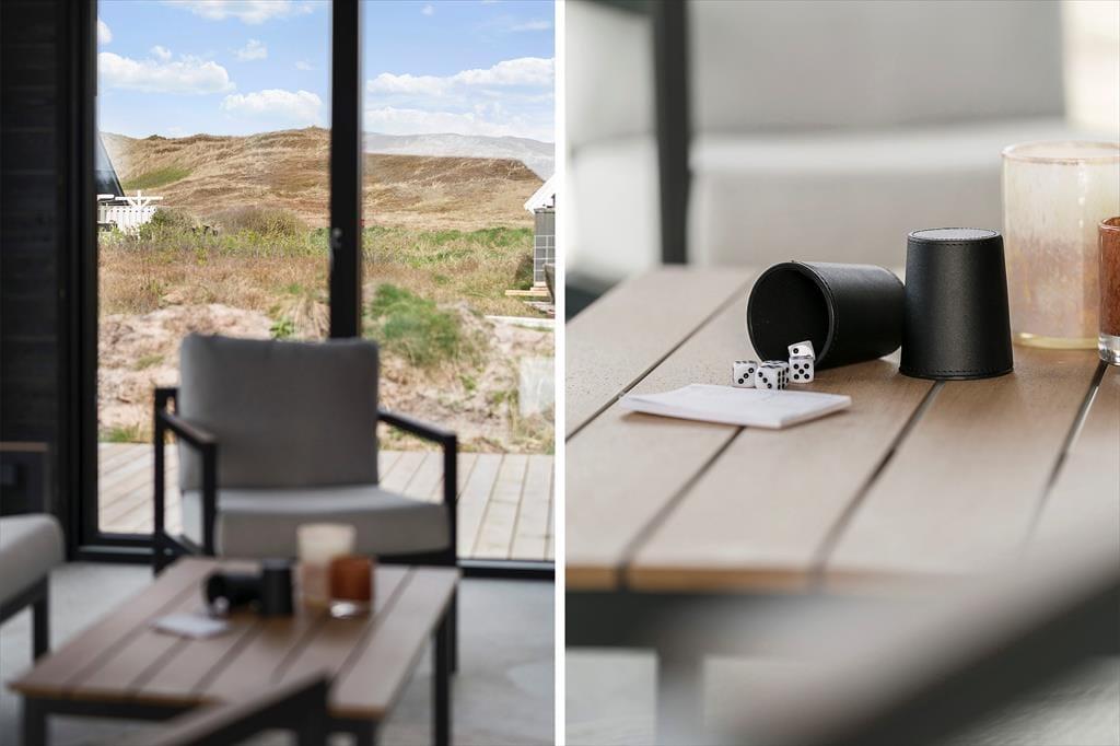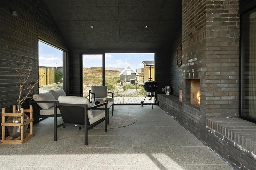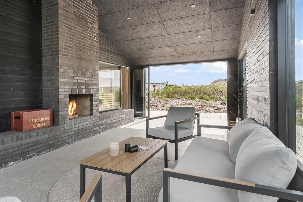 På husets åbne terrassemiljø kan I solbade, grille og hygge jer i stor stil, og det overdækkede, afskærmede lounge-område er et skønt sted at søge læ, hvis en brise kommer ind fra Vesterhavet. Lounge-området er også ideelt til gode og hyggelige aftenstunder, hvor der tændes op i det indbyggede bålsted, så varmen kan brede sig.