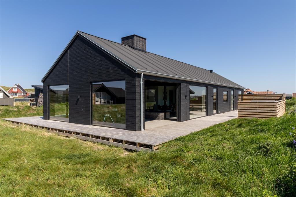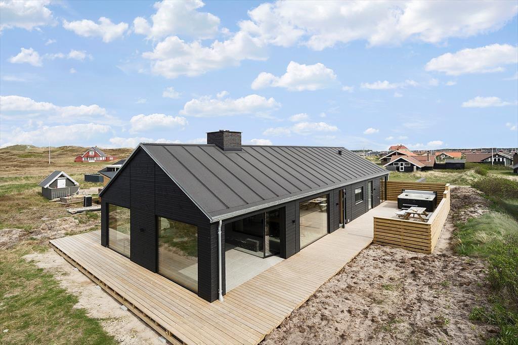Sommerhusets høje kvalitet kan fornemmes lige fra ankomsten, når I ser det lækre terrassemiljø og den sorte træfacade med kæmpestore vinduespartier.