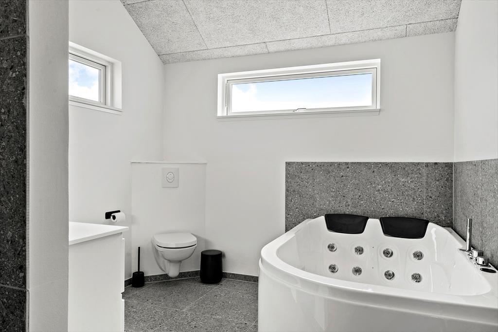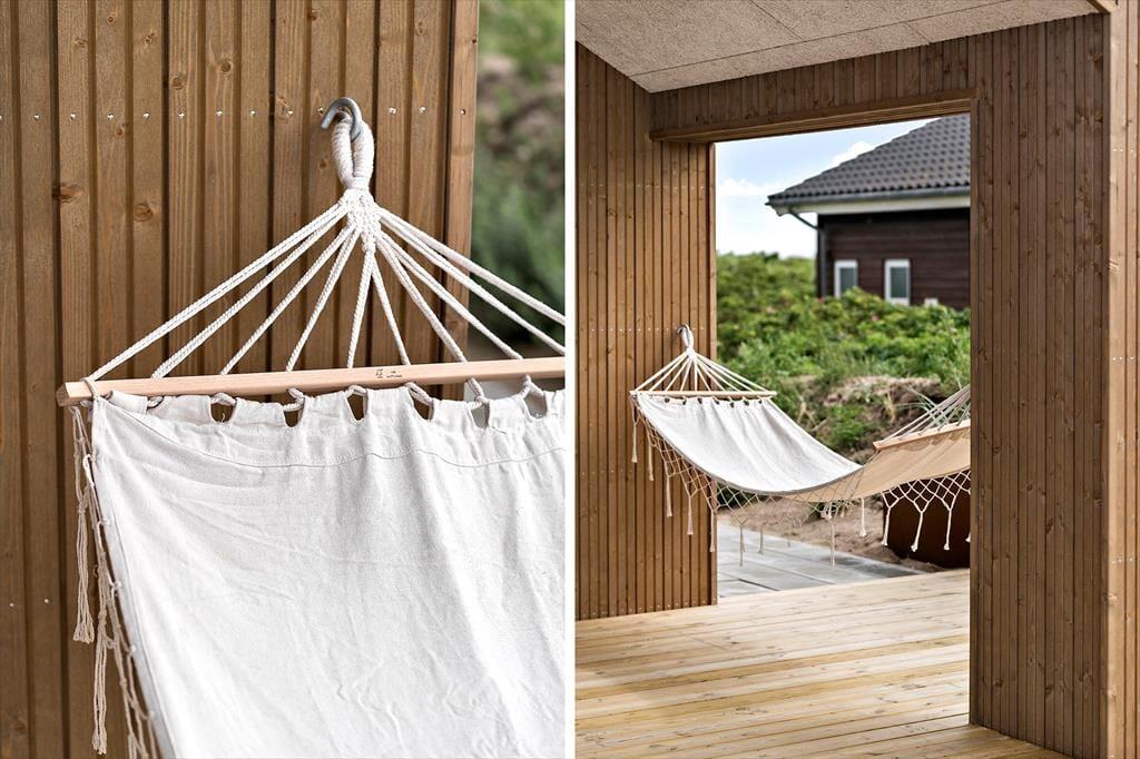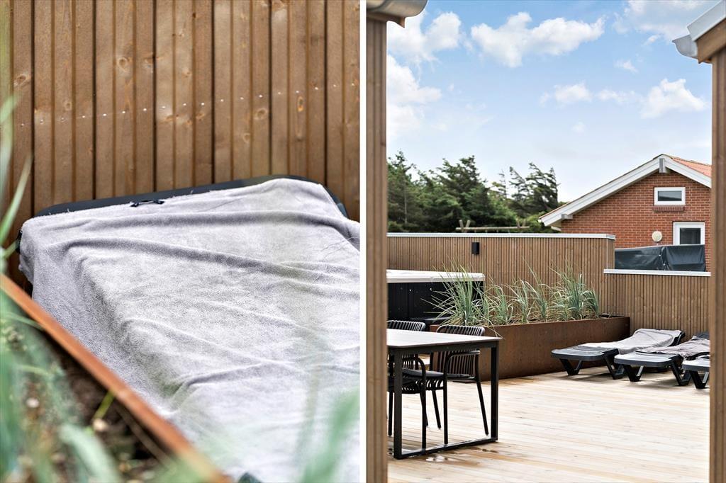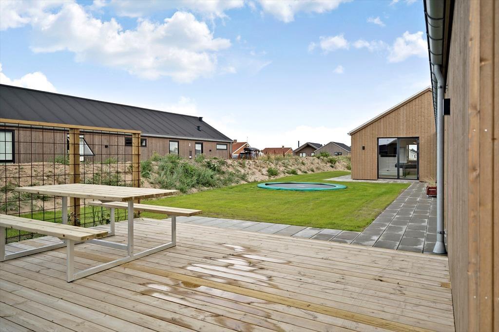 Sommerhusets udendørsarealer er designet til at samle gode ferieminder. Den moderne terrasse har både solrige og overdækkede sektioner, så du altid kan finde en passende plads – uanset om du søger sol, skygge eller læ for vinden. Her kan du nyde lange sommeraftener med grillmad og fællesskab, eller du kan hoppe i det udendørs spabad og lade kroppen slappe helt af under åben himmel. Haven er også et hit for børnene: De kan gynge og hoppe på trampolinen, mens de voksne nyder roen fra liggestolen. Det hele er rammet ind af fredelige omgivelser, og da huset ligger på en stille vej, kan ferien nydes i trygge og rolige rammer for både børn og hund.