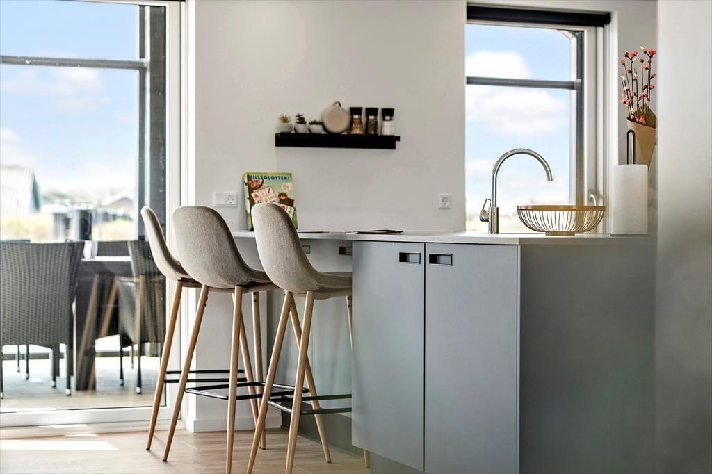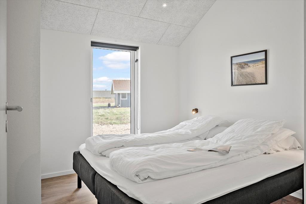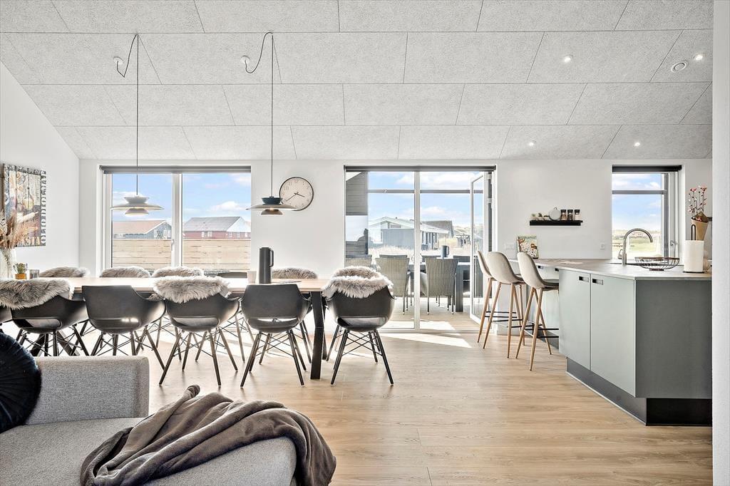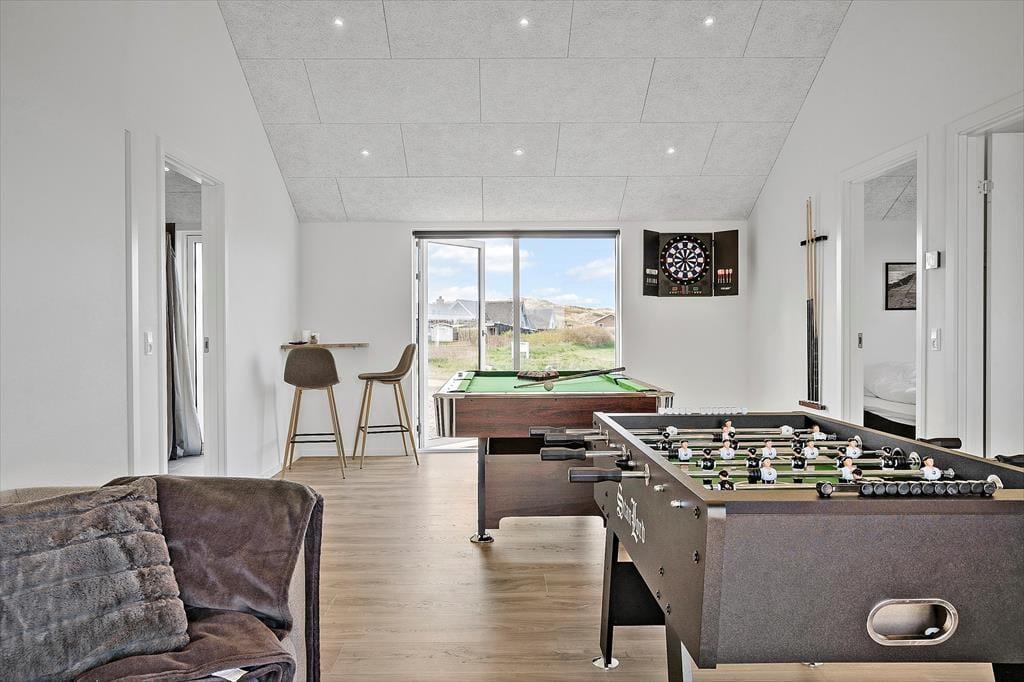 Så snart du træder ind i sommerhuset på Neerlandiavej 196, mærker du den moderne og rolige atmosfære, som gennemsyrer hele huset. Indretningen er holdt i lyse toner, og store vinduer og glaspartier sørger for masser af dagslys og en naturlig kontakt til omgivelserne. Køkken og stue er integreret i ét samlet opholdsrum, hvor I nemt kan være sammen – uanset om I laver mad, spiller spil eller slapper af foran fladskærmen. Den hyggelige havestue forlænger sæsonen og giver ekstra plads til samvær og ro. Når det er tid til sjov, byder aktivitetsrummet på både poolbord, bordfodbold og dart – et hit for både børn og voksne.