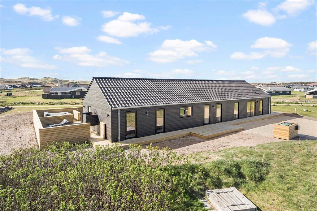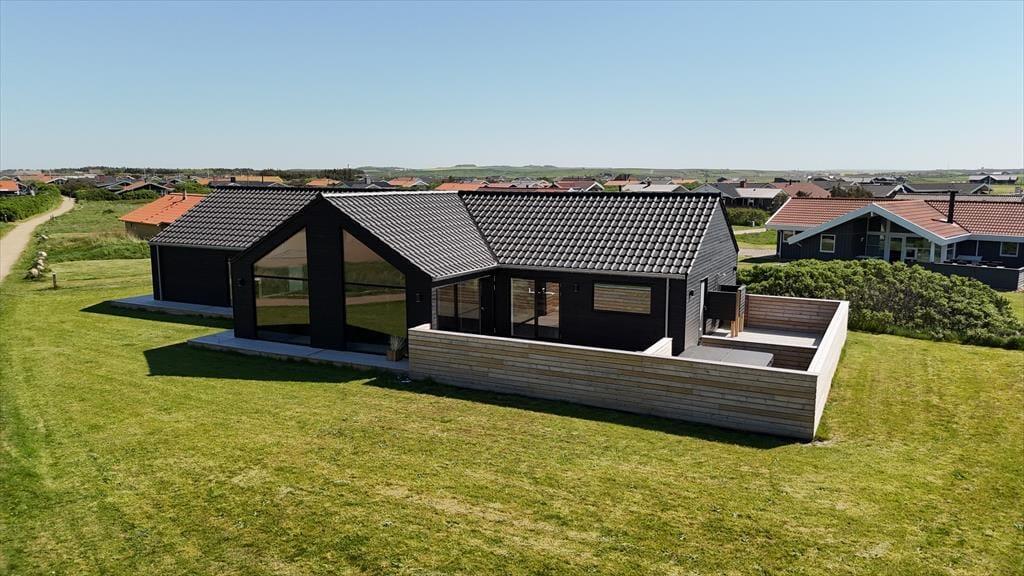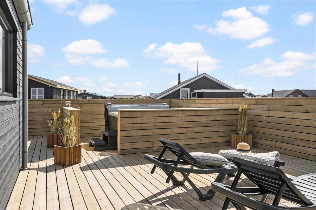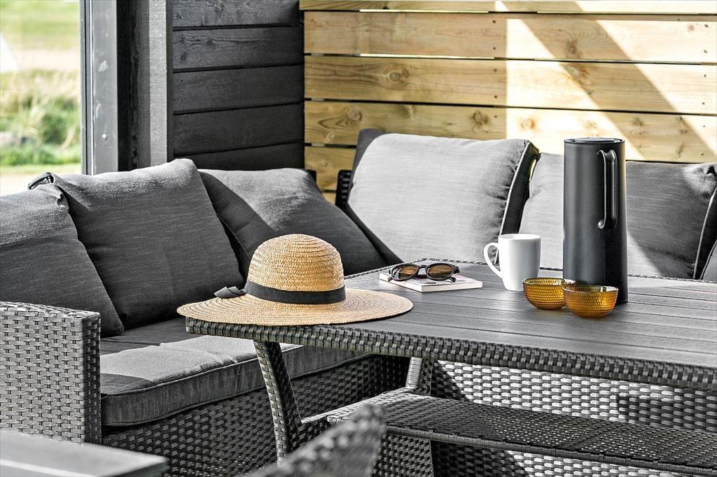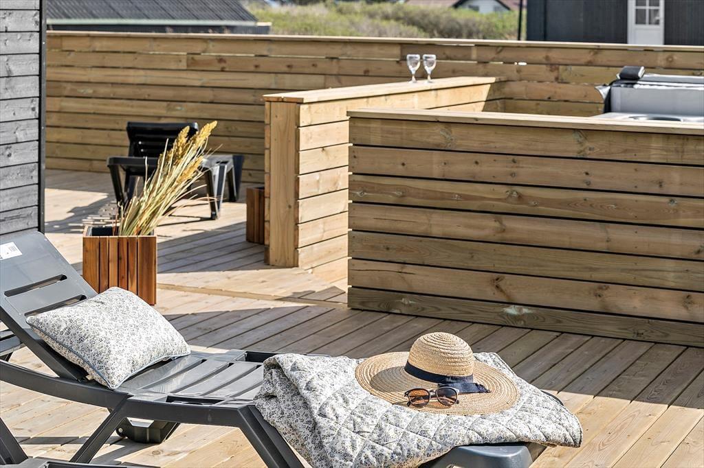 Udendørslivet omkring sommerhuset er mindst lige så tiltalende som det, der venter indenfor. Den 100 m² store terrasse er inddelt i forskellige zoner, hvor du kan vælge sol eller skygge, alt efter humør og tidspunkt på dagen. Her kan du nyde morgenkaffen i ro og mag, læse en bog i loungemøblerne eller gøre klar til grillmiddag i det fri. Og så er der selvfølgelig wellness-delen: en skøn udendørs spa, en sauna og en udebruser, der tilsammen giver den ultimative ferieluksus under åben himmel. Imens kan hunden bevæge sig trygt rundt i de rolige omgivelser, og børnene kan lege udenfor, mens de voksne nyder freden.