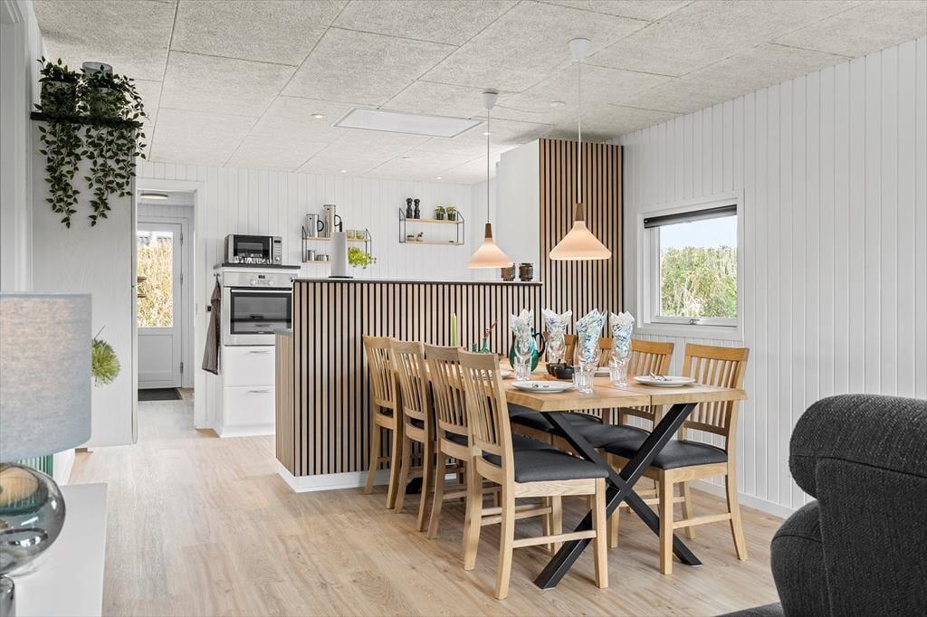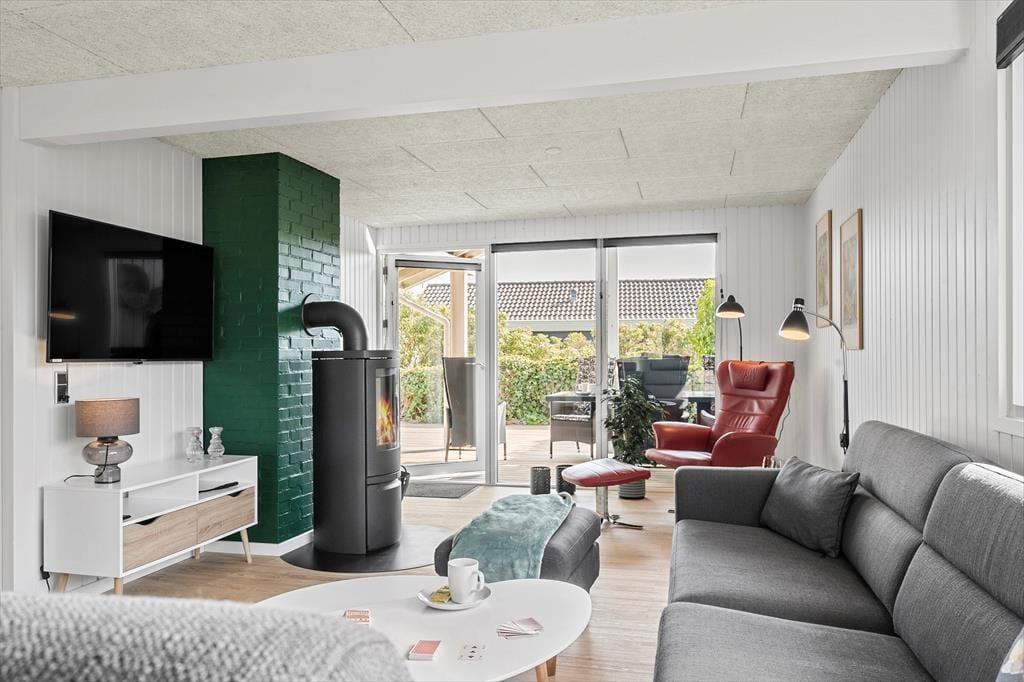 Det første, du lægger mærke til, når du træder ind i sommerhuset på Neerlandiavej 49, er den lyse og hyggelige atmosfære. Huset er indrettet i en afslappet og imødekommende stil, hvor det er nemt at finde ro og føle sig hjemme – uanset om du er her med familien, vennerne eller bare din firbenede ven. Det kombinerede køkken og stueområde fungerer som samlingspunktet, hvor du kan lave mad, spille spil, slappe af i sofaen eller måske bare læne dig tilbage med en god bog og nyde det fredelige ferietempo. Store vinduer lukker lyset ind og giver et dejligt kig til udelivet, så naturen altid føles tæt på – selv når du er indenfor.