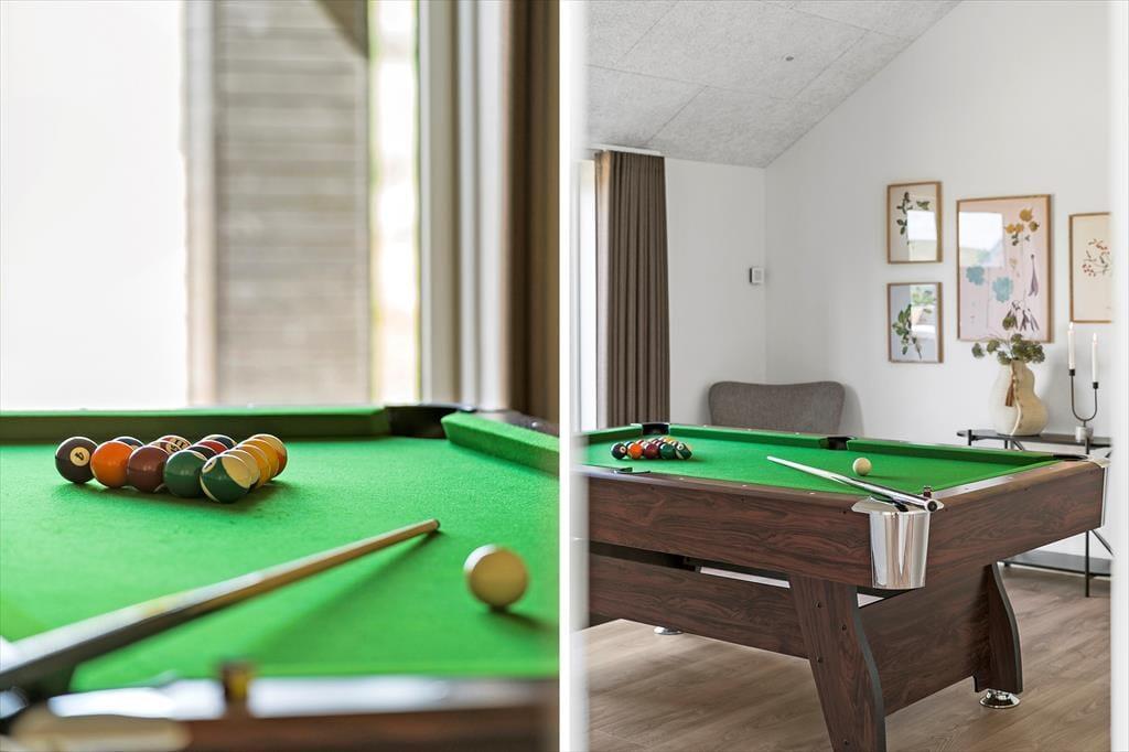 Når du træder ind i sommerhuset på Lucievej 12B, mødes du af en moderne og gennemført indretning, der inviterer til hygge og samvær. I det lyse opholdsrum kombineres stue og køkken i ét stort fællesrum, hvor biopejsens bløde flammer skaber den perfekte stemning til hyggelige aftener. Efter en lang dag under åben himmel kan du glæde dig til at slappe af i husets sauna, mens børnene morer sig med et spil pool i aktivitetsrummet. Den velindrettede planløsning gør det nemt for hele familien at være sammen – uanset om der laves mad, spilles spil eller slappes af i sofaen.