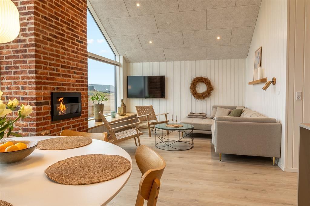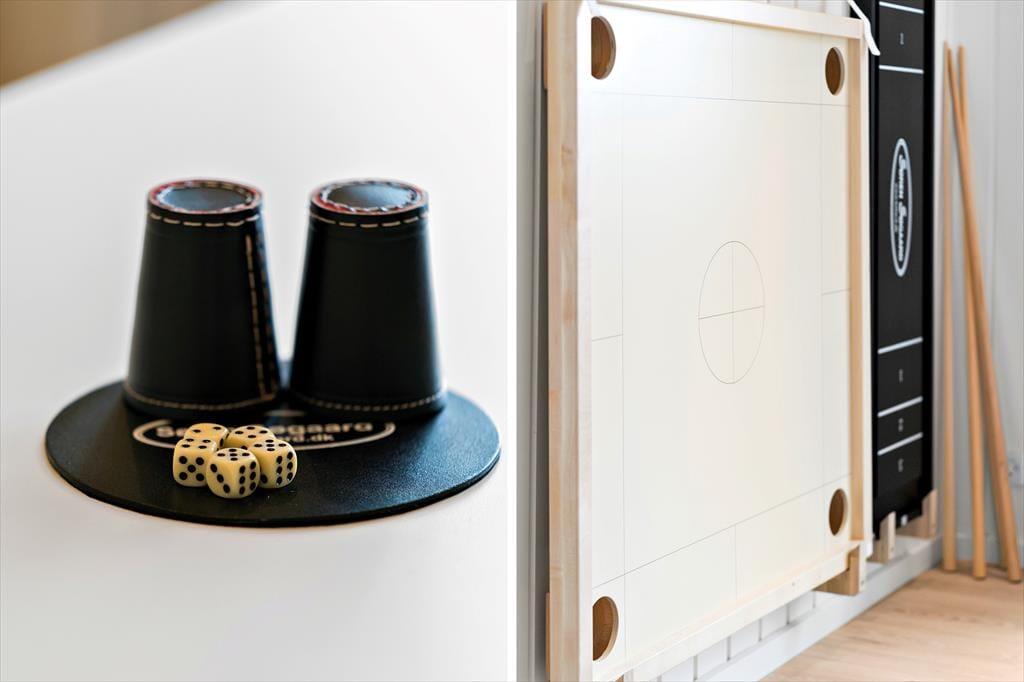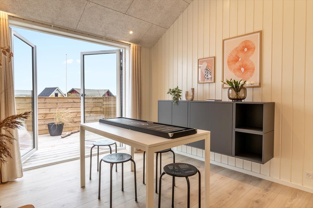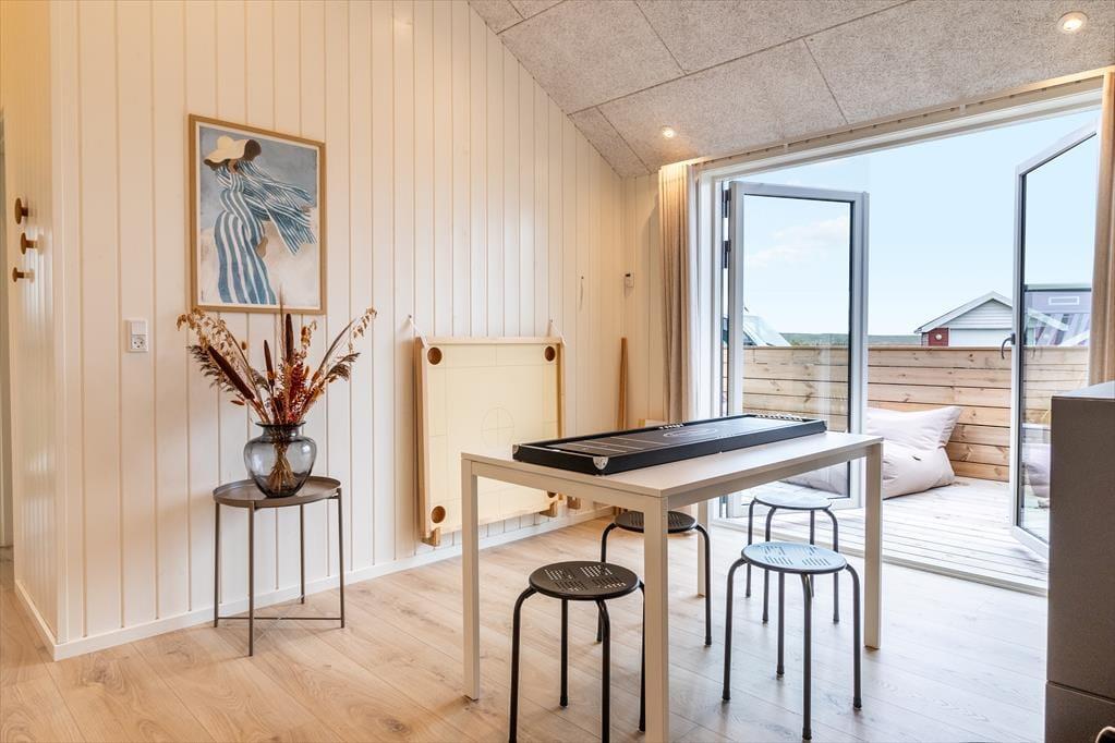 Når du træder indenfor i dette skønne sommerhus, bliver du mødt af en lys og indbydende indretning, der straks emmer af feriestemning. Stuen er husets naturlige samlingspunkt med en biopejs, der spreder varme og hygge, mens store vinduespartier åbner op for udsigten til det omkringliggende landskab og Ferring Sø. Køkkenet ligger i åben forbindelse med stuen, så du kan nyde fællesskabet, mens maden forberedes. Huset byder på flere lækre faciliteter som en sauna, hvor du kan slappe af efter en dag i naturen, og et aktivitetsrum fyldt med muligheder – dyst i shuffleboard eller bobspil, eller slå jer ned med et af de mange brætspil til en hyggelig aften.