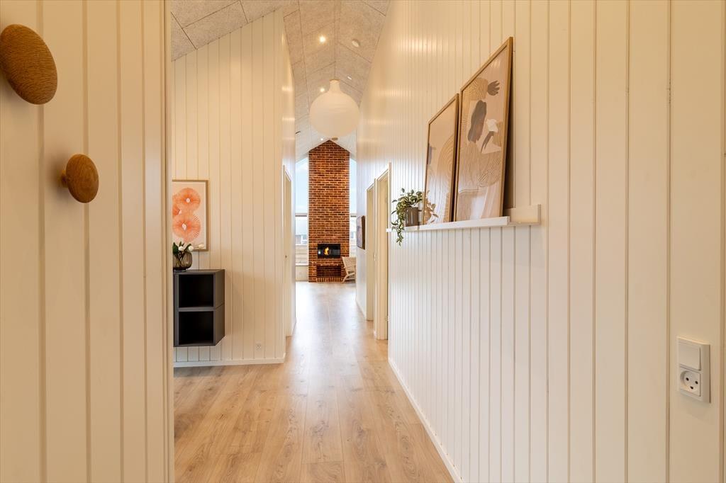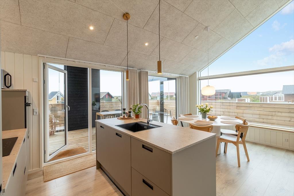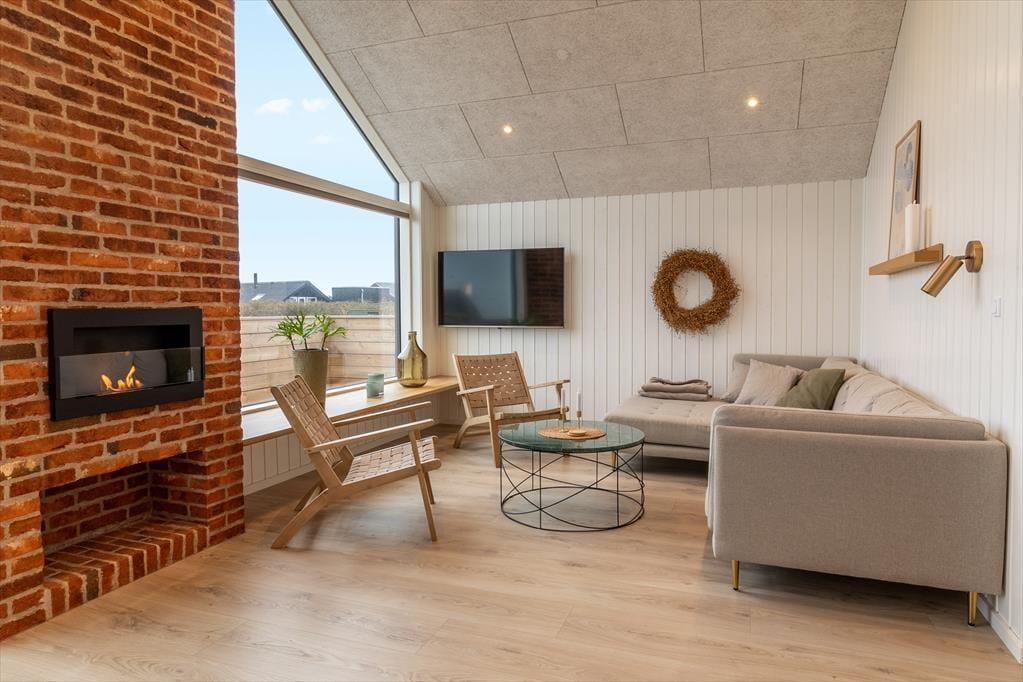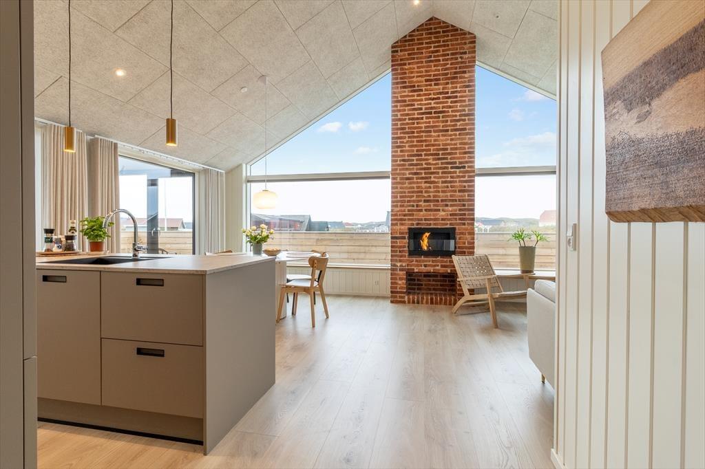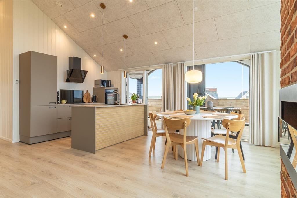 Når du træder indenfor i dette skønne sommerhus, bliver du mødt af en lys og indbydende indretning, der straks emmer af feriestemning. Stuen er husets naturlige samlingspunkt med en biopejs, der spreder varme og hygge, mens store vinduespartier åbner op for udsigten til det omkringliggende landskab og Ferring Sø. Køkkenet ligger i åben forbindelse med stuen, så du kan nyde fællesskabet, mens maden forberedes. Huset byder på flere lækre faciliteter som en sauna, hvor du kan slappe af efter en dag i naturen, og et aktivitetsrum fyldt med muligheder – dyst i shuffleboard eller bobspil, eller slå jer ned med et af de mange brætspil til en hyggelig aften.