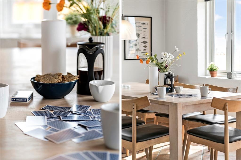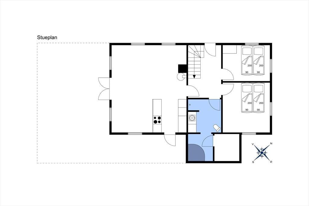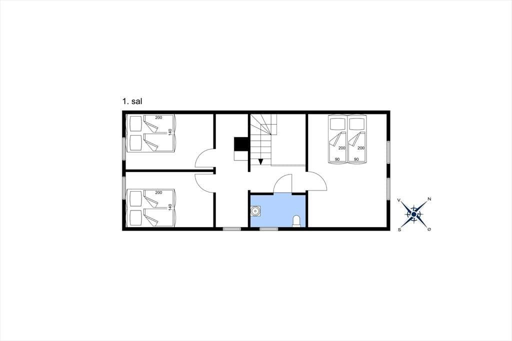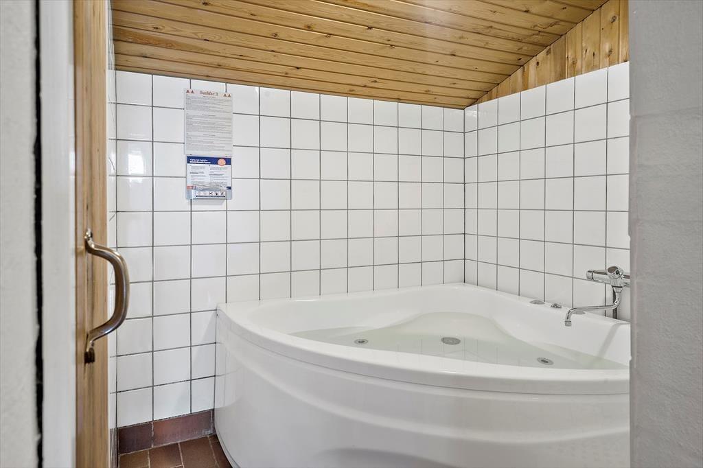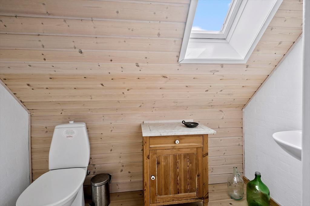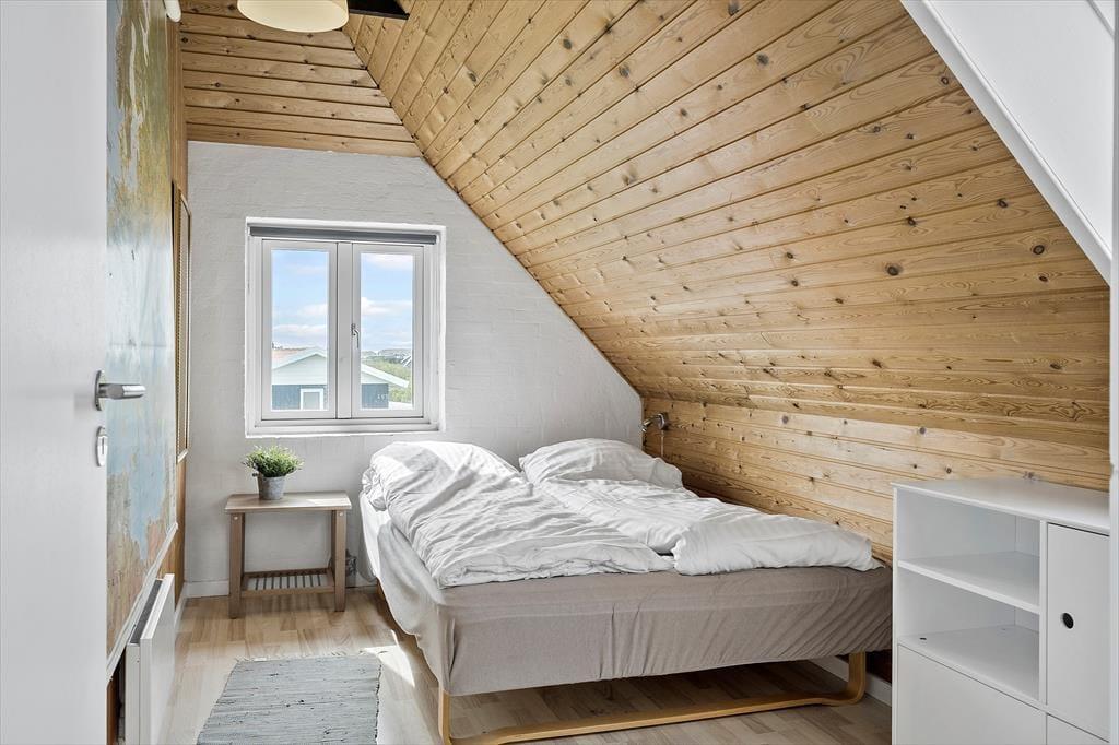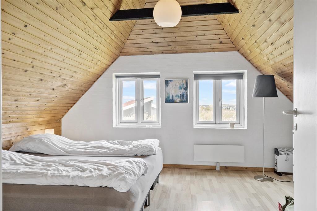 Spabadet og saunaen er noget af det, der gør driverlivet ekstra skønt i det 138 m2 store sommerhus – og hvis en del af selskabet optager badeværelset med wellness og afslapning, er det som en sidebemærkning rart, at der er et ekstra toiletrum på førstesalen. I det hele taget passer planløsningen godt til ti personer, for der er fem soveværelser at gøre godt med foruden et dejligt opholdsrum med sofaarrangement, brændeovn og spisebord. I det åbne, tosidede køkken kan du nemt deles om kokketjansen med dem, der også synes, at det er hyggeligt at småsnakke over madlavningen. Førstesalen skal vi lige dvæle ved et ekstra øjeblik, for mod syd kan du se ud over de åbne marker over Ferring Sø og helt til Bovbjerg Fyr.