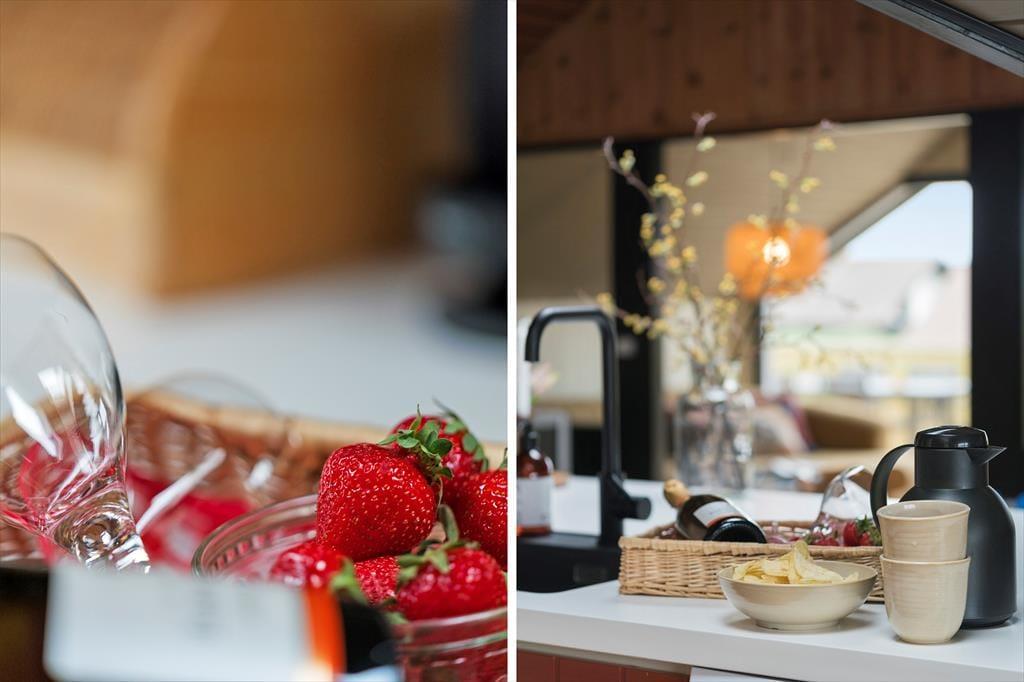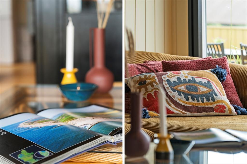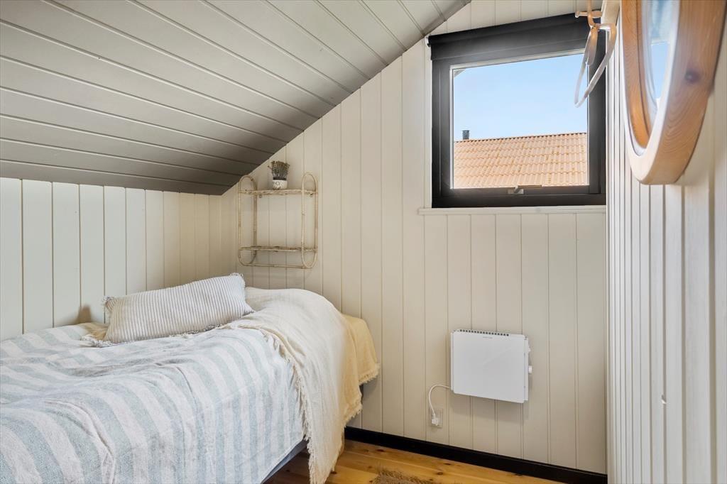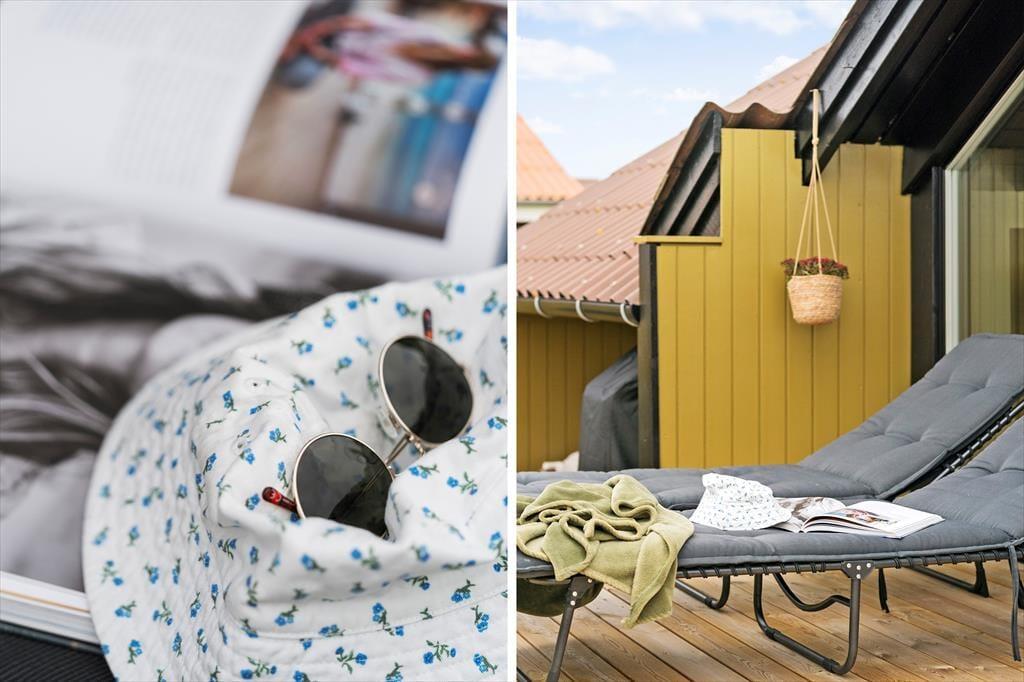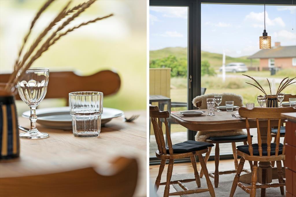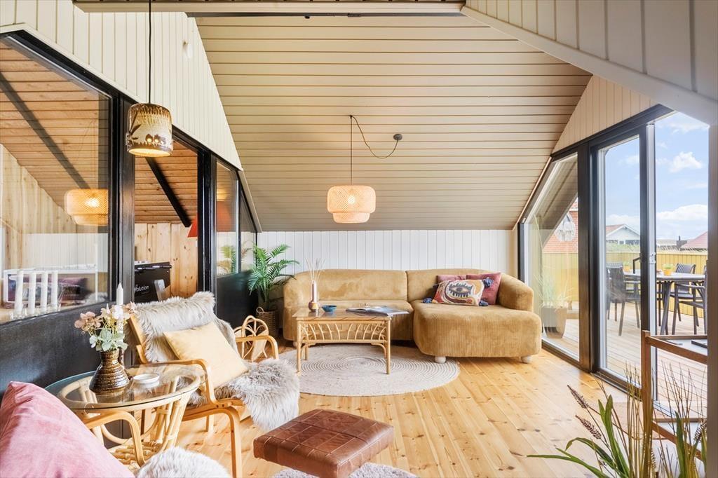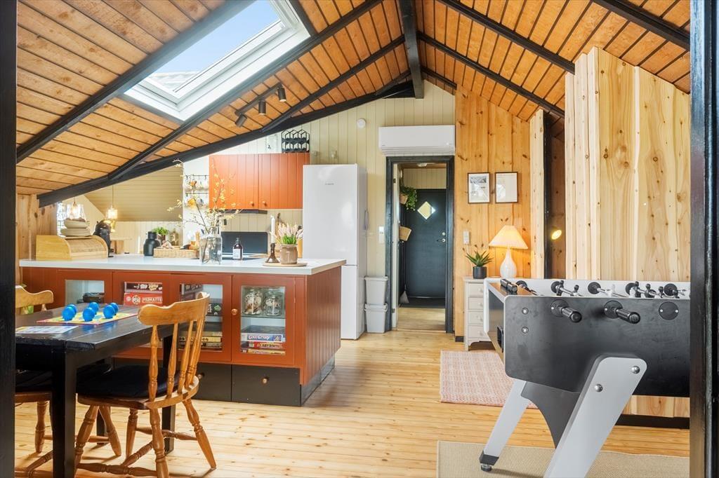 Indenfor byder sommerhuset på en varm og afslappet atmosfære, der emmer af feriestemning og samvær. De lyse rum og den hjemlige stil gør det nemt at finde ro og nærvær. Stuen er indrettet med bløde møbler, alkove og et hyggeligt spilområde med både spillekonsol og bordfodbold – et oplagt sted at samle hele familien til en omgang brætspil eller en god film. Det er let at forestille sig børnene fordybet i et spil, mens de voksne nyder en stille stund med en bog i alkoven. Køkkenet ligger i åben forbindelse med stuen, hvilket gør det nemt at snakke sammen og være nærværende – også når der skal laves mad. Små, personlige detaljer og indbydende kroge gør huset til et sted, hvor man har lyst til at være.