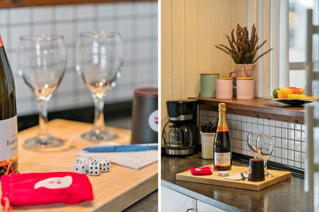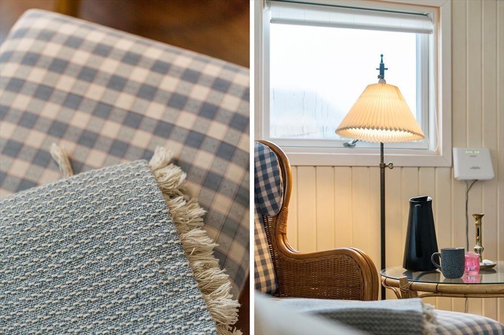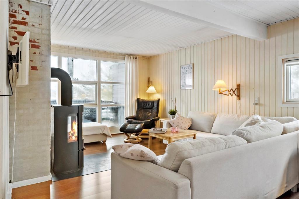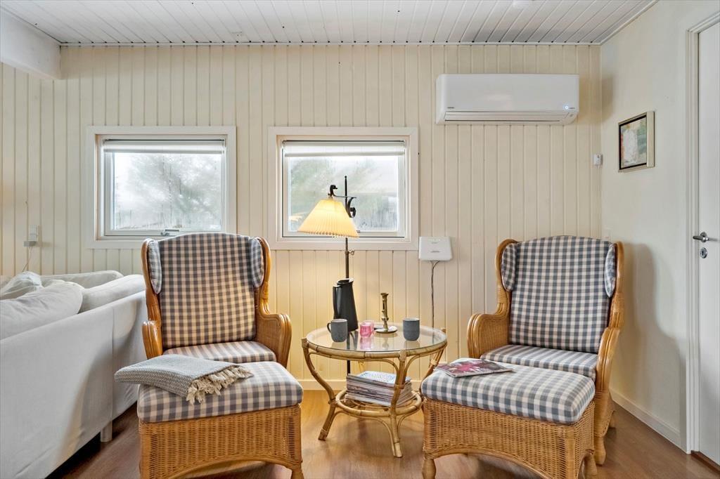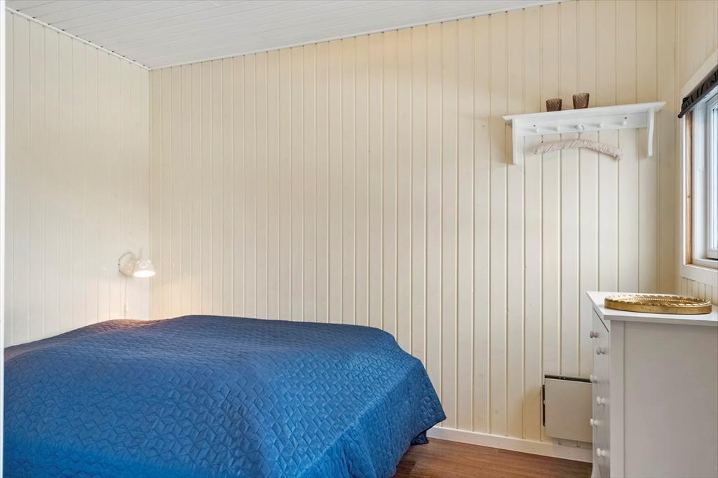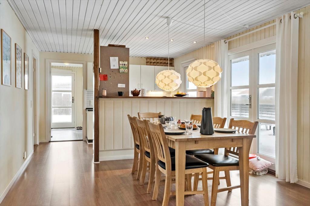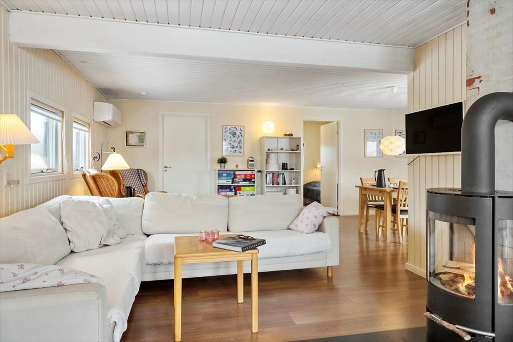 Indenfor mødes du af en lys og hyggelig atmosfære, hvor det er let at finde ro og feriestemning. Indretningen er venlig og indbydende, og de lyse overflader understreger fornemmelsen af luft og plads. Brændeovnen står klar til de køligere dage, hvor flammernes knitren hurtigt samler familien til hyggelige stunder med varme drikke, brætspil og gode samtaler. Badeværelset er nyrenoveret og fremstår moderne og indbydende – et rart sted at starte dagen efter en frisk morgentur ved havet eller afslutte den med et varmt bad. Sommerhuset egner sig perfekt til en ferie med familie eller venner, hvor der er fokus på nærvær, komfort og afslapning. Her kan du trække stikket, sænke skuldrene og nyde ferien i dit eget tempo.