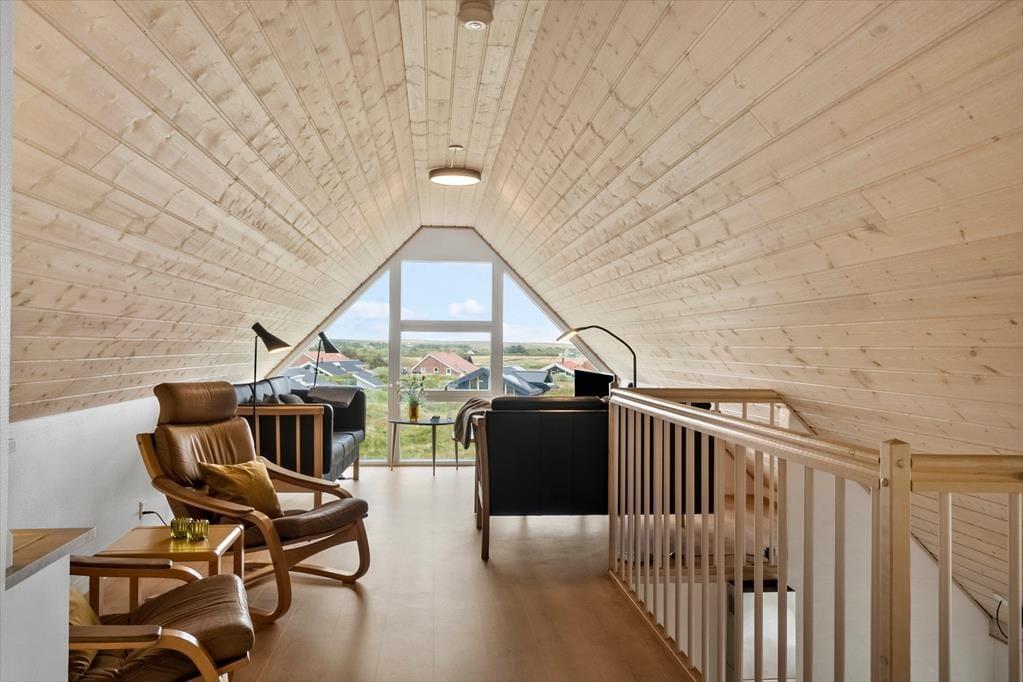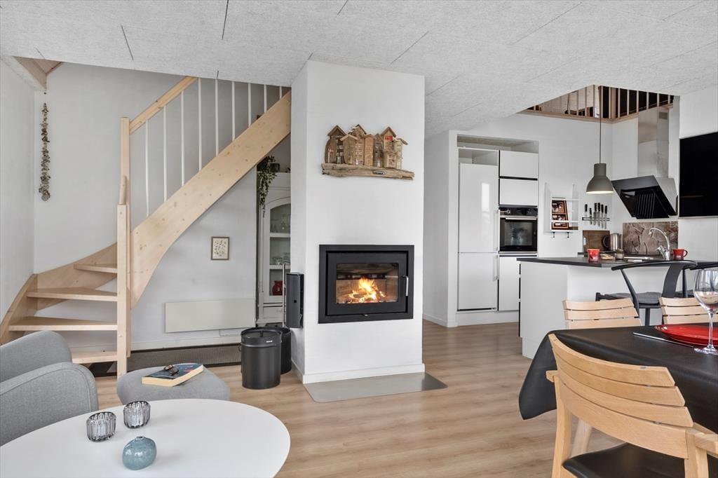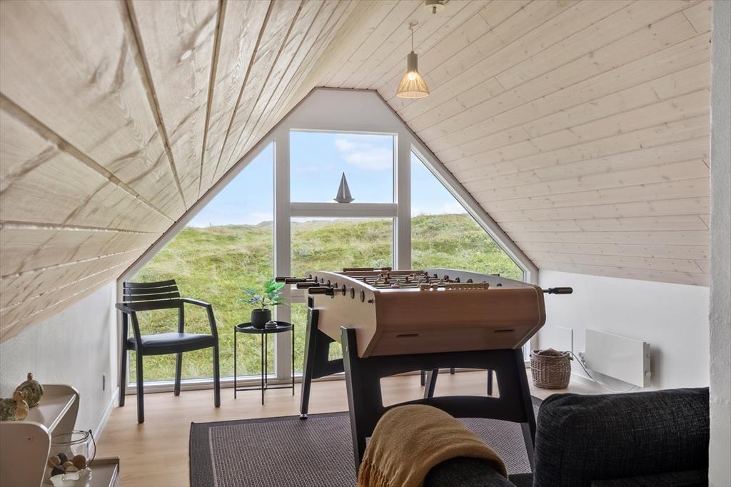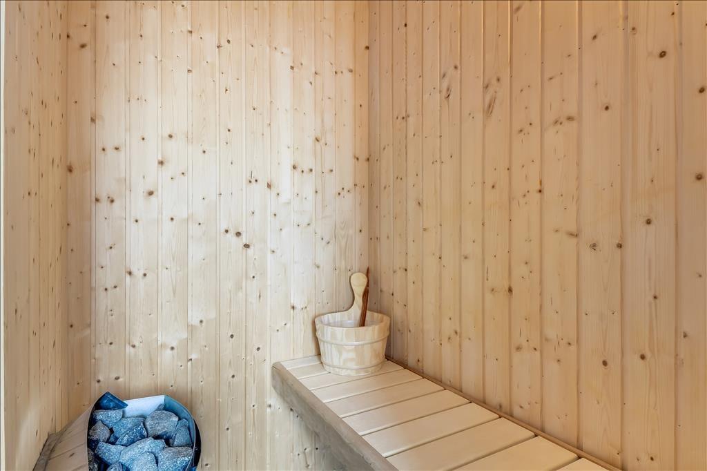 Sommerhuset er indrettet i to plan, og allerede når du træder indenfor, fornemmer du den varme og velgennemtænkte atmosfære. I stueplan finder du opholdsstuen med brændeovn og store vinduer, som inviterer dagslyset indenfor og skaber en rolig ramme om familiens feriestunder. Herfra er der direkte udgang til terrassen, så inde- og udeliv let smelter sammen. Spaen og saunaen ligger i stueetagen og er oplagte til en stund med selvforkælelse – især efter en blæsende tur ved havet. På første sal finder du et lyst og hyggeligt fællesrum med både sofagruppe og bordfodbold, som indbyder til leg, grin og hyggelige timer sammen. Indretningen emmer af kvalitet, og uanset årstid er det let at finde roen og komme ned i gear her.