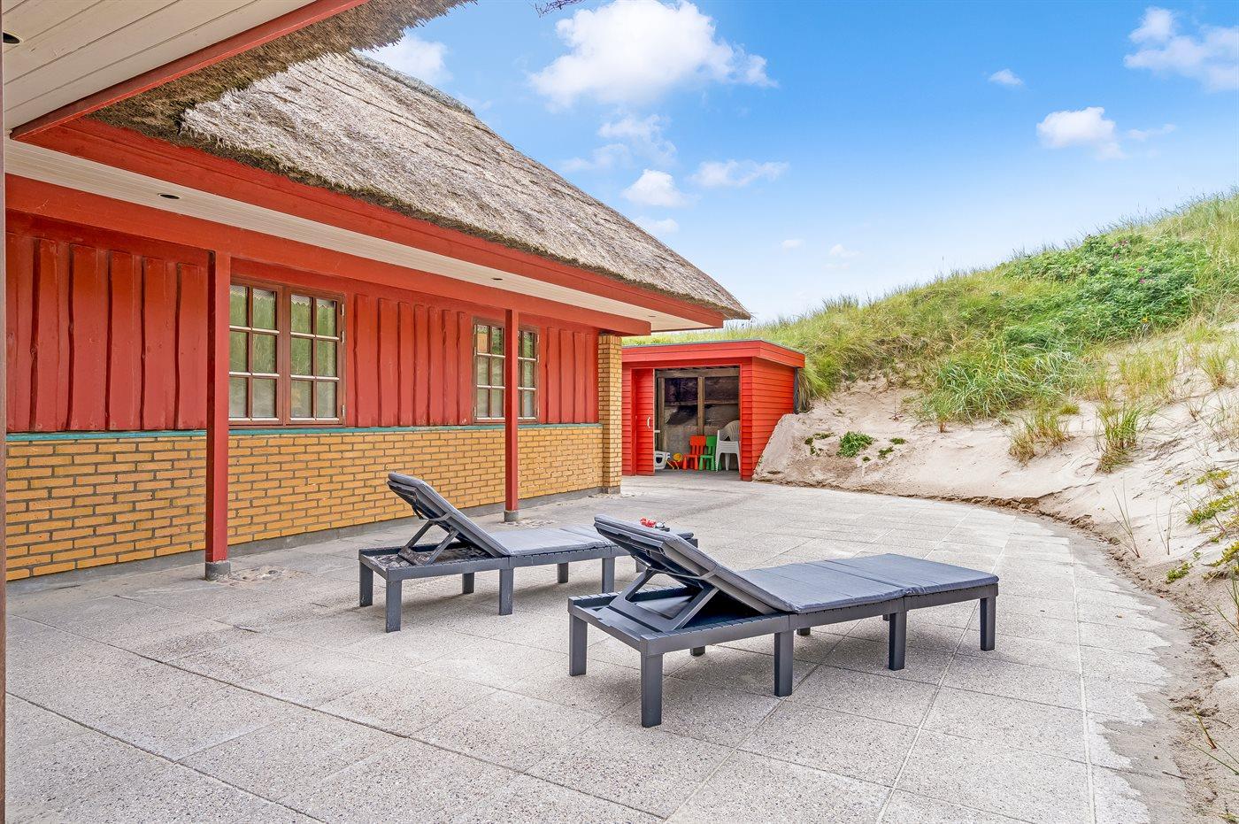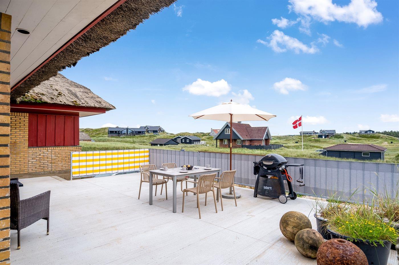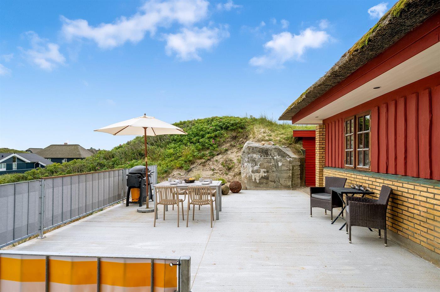 Ferieboligen er beliggende på en 7881 m² stor klitgrund. Der er 100 m til havet. Nærmeste forretning er beliggende i en afstand af 5000 m. Til ferieboligen hører åbent terrasseareal. Der er installeret stik til opladning af elbil. Type 2 stik. Med 11 kW ladeeffekt. Parkering ved ferieboligen.
