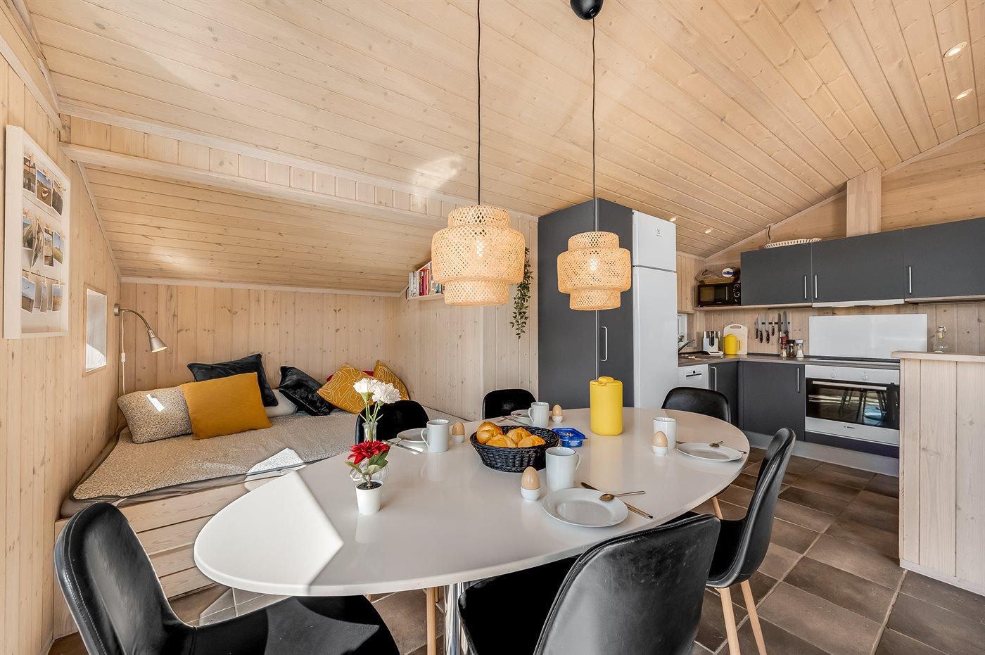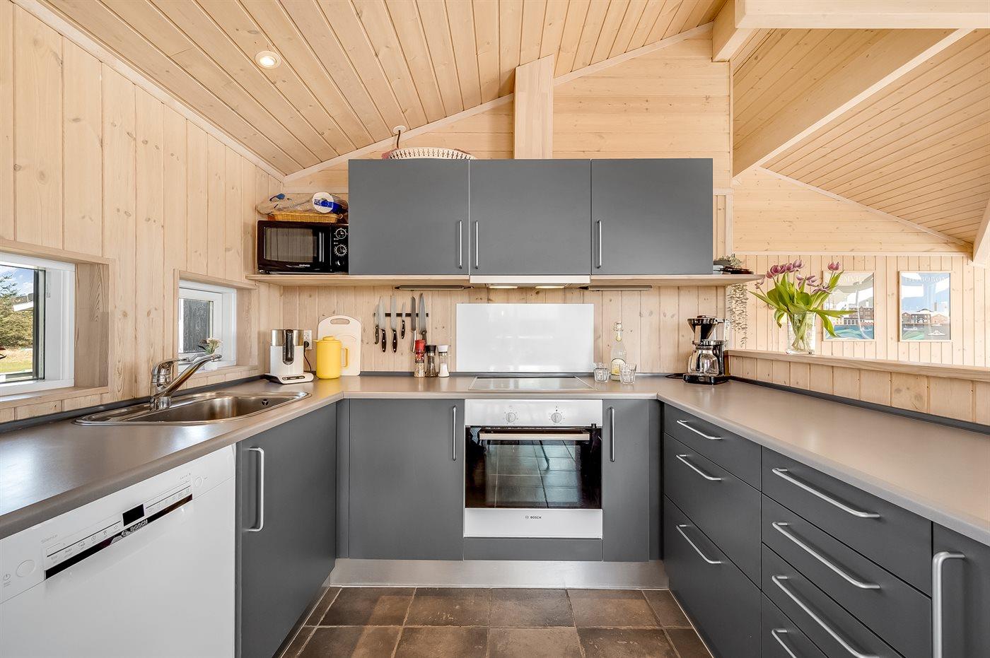 Køkkenet er udstyret med 1 køleskab. Der er 4 keramiske kogeplader, varmluftovn, mikrobølgeovn samt opvaskemaskine.
