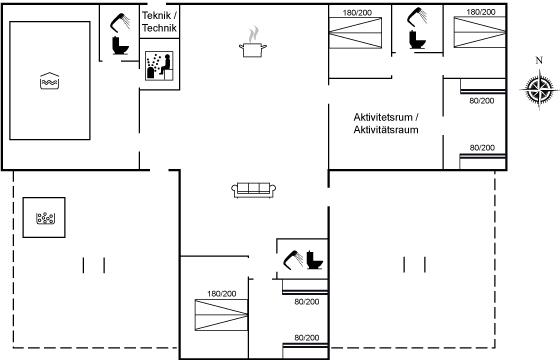 Swimmingpoolen er opvarmet til 24–28 grader og giver mulighed for leg og afslapning året rundt. I tilknytning hertil finder du sauna og udendørs standvandsspa til seks personer. Huset har et separat aktivitetsrum med bordfodbold – perfekt til små turneringer og hyggelige aftener.