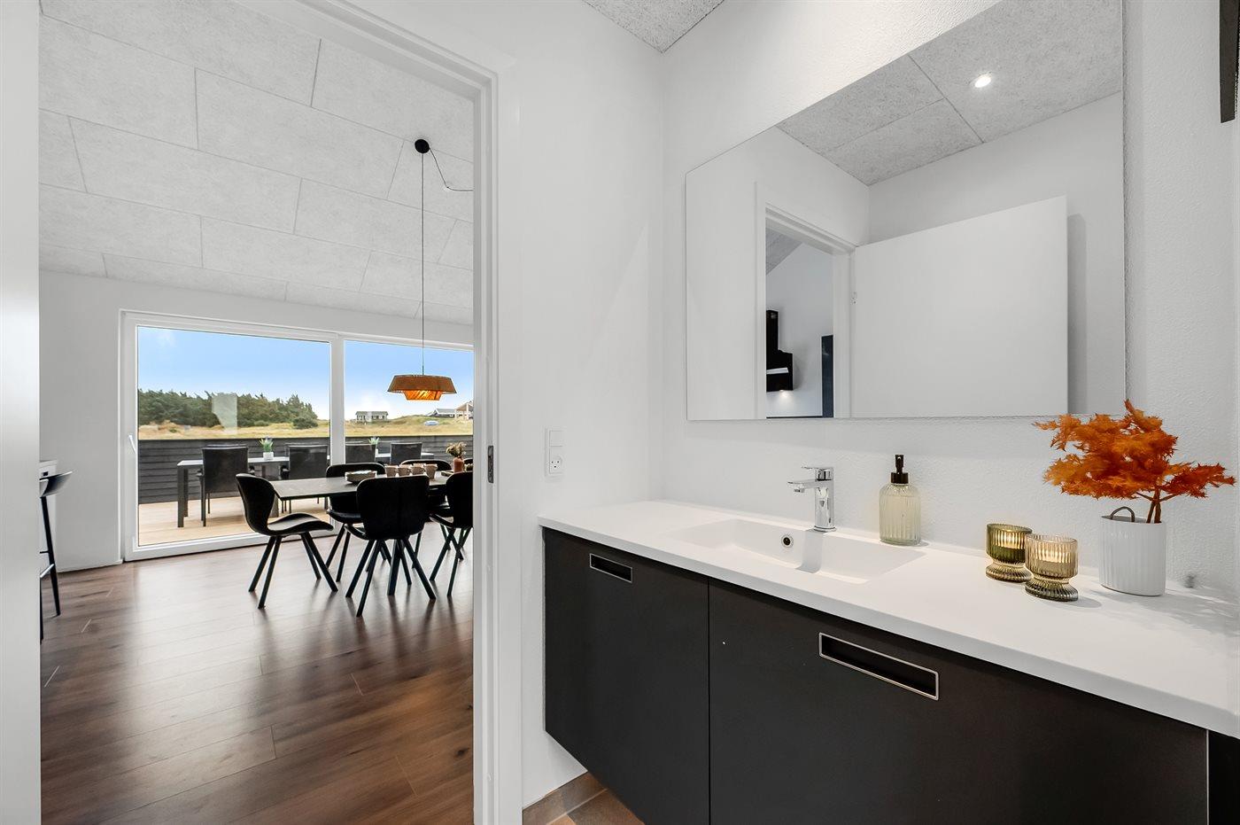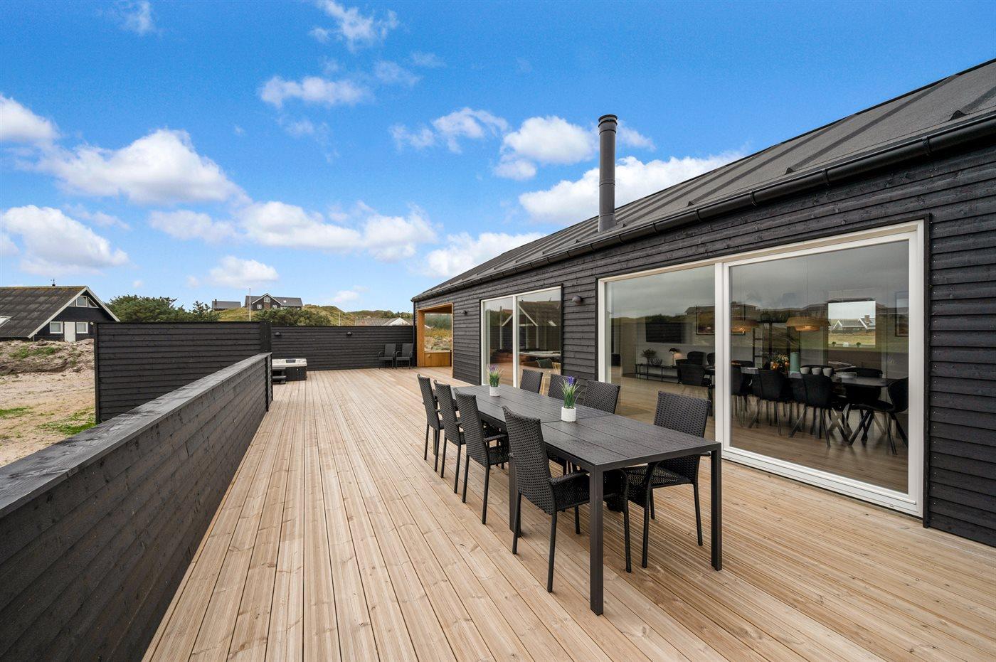 I dette feriehus får du et moderne og funktionelt hus, hvor der er fokus på rummelighed og æstetik. Med de store vinduespartier kommer der masser af lys ind i huset, og den overdækkede terrasse er en fantastisk oase selvom Vesterhavets susen kan mærkes. I dette hus har du nok også Vejlby Klits største sauna og i kombination med den lækre udendørs spa byder huset også på masser af wellness.