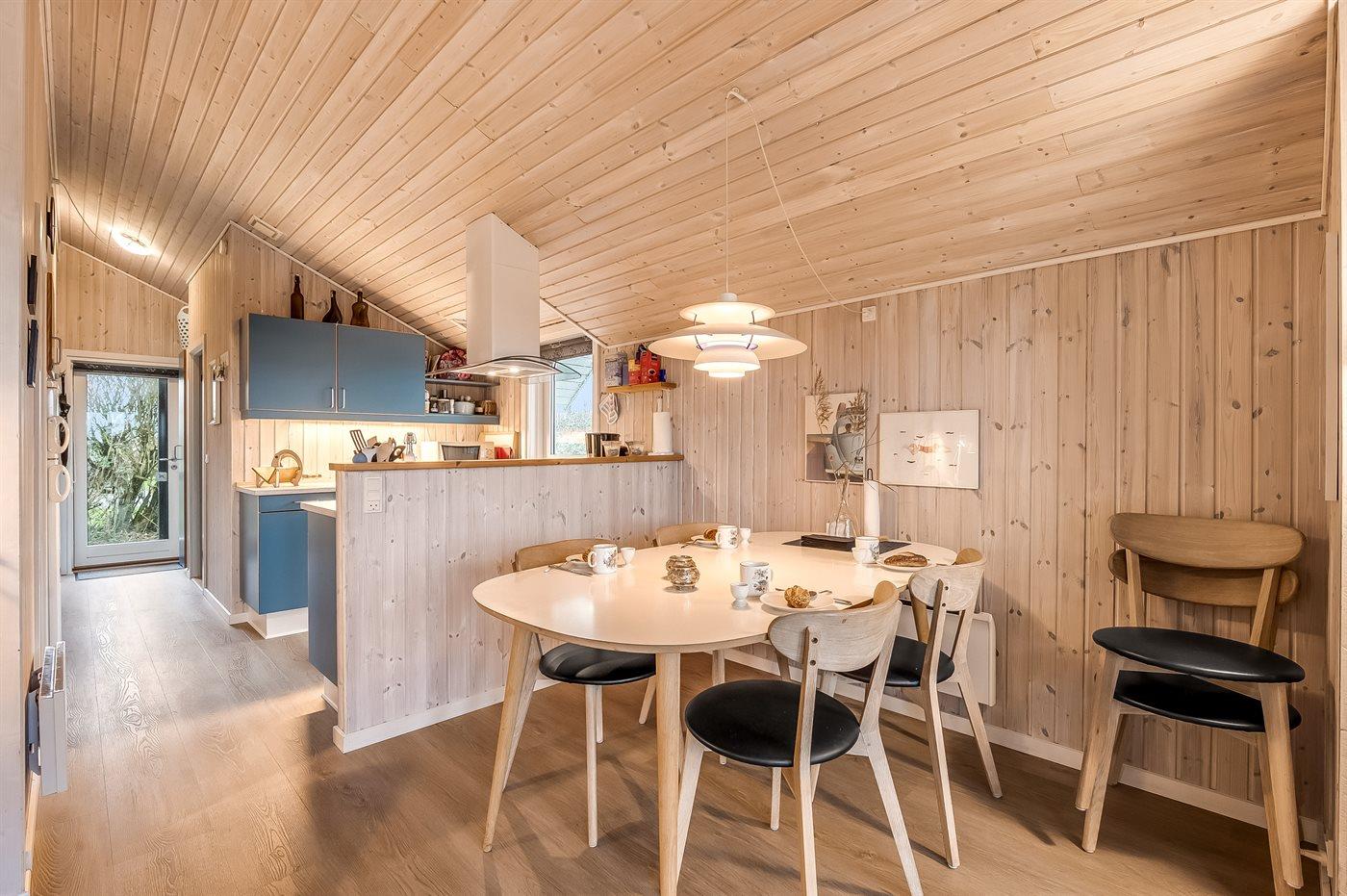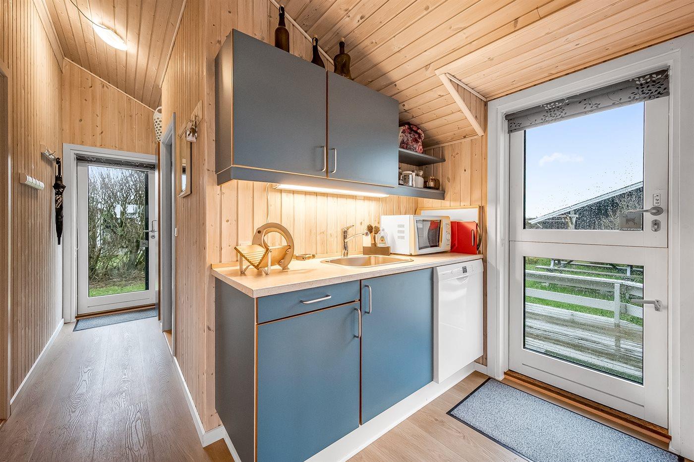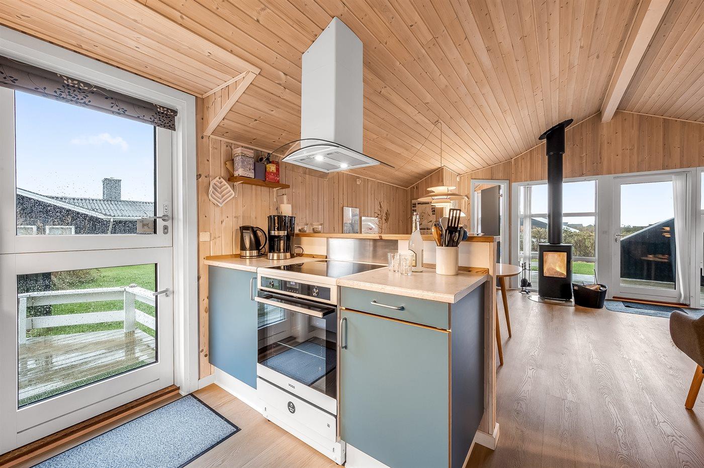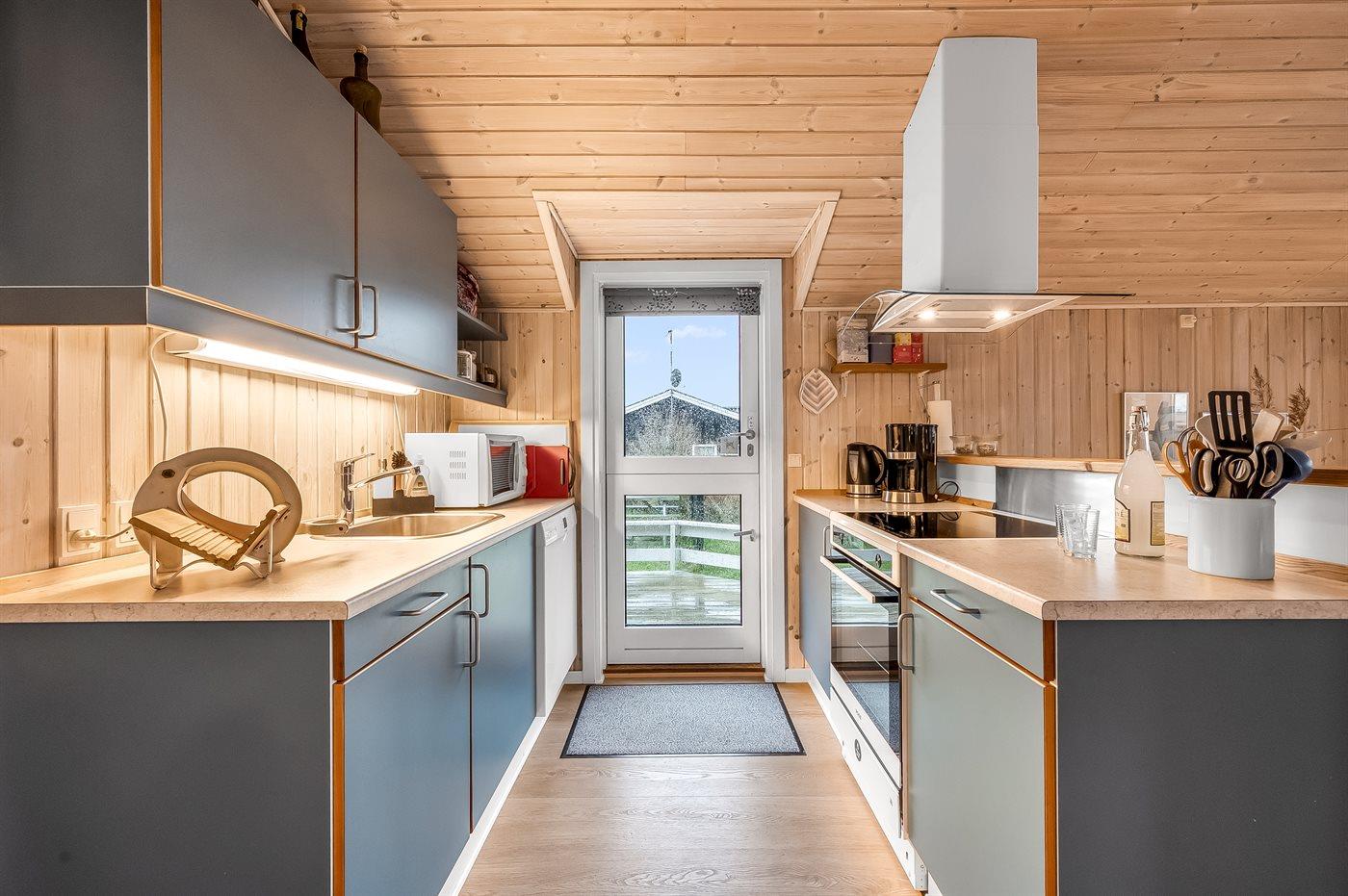 Køkkenet er udstyret med 1 køleskab. Der er 4 keramiske kogeplader, varmluftovn, mikrobølgeovn samt opvaskemaskine.