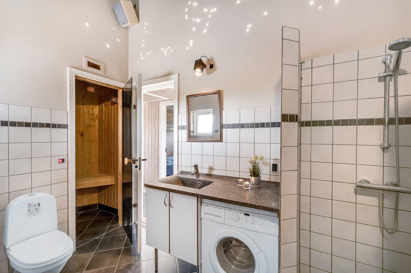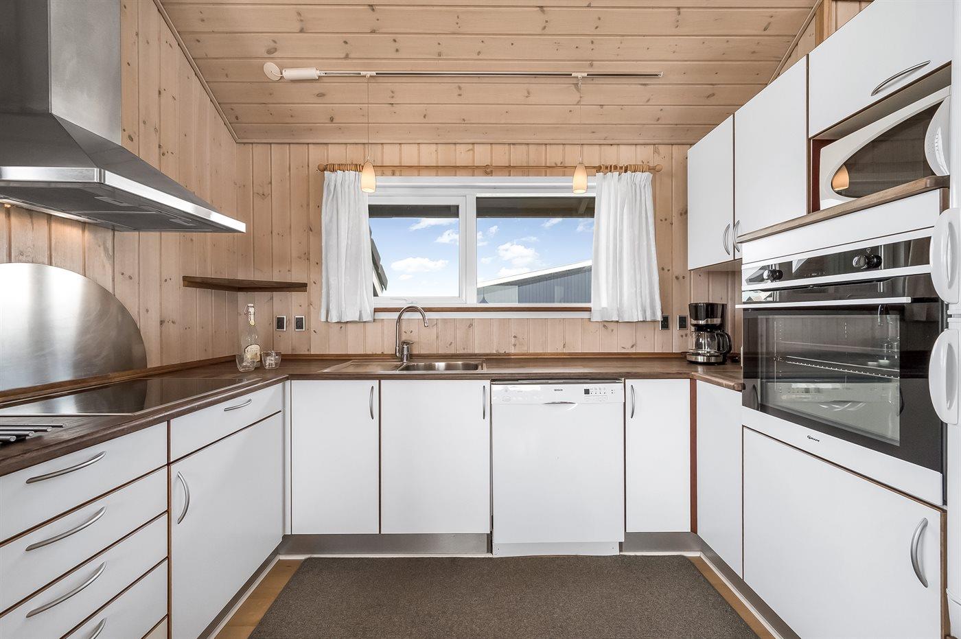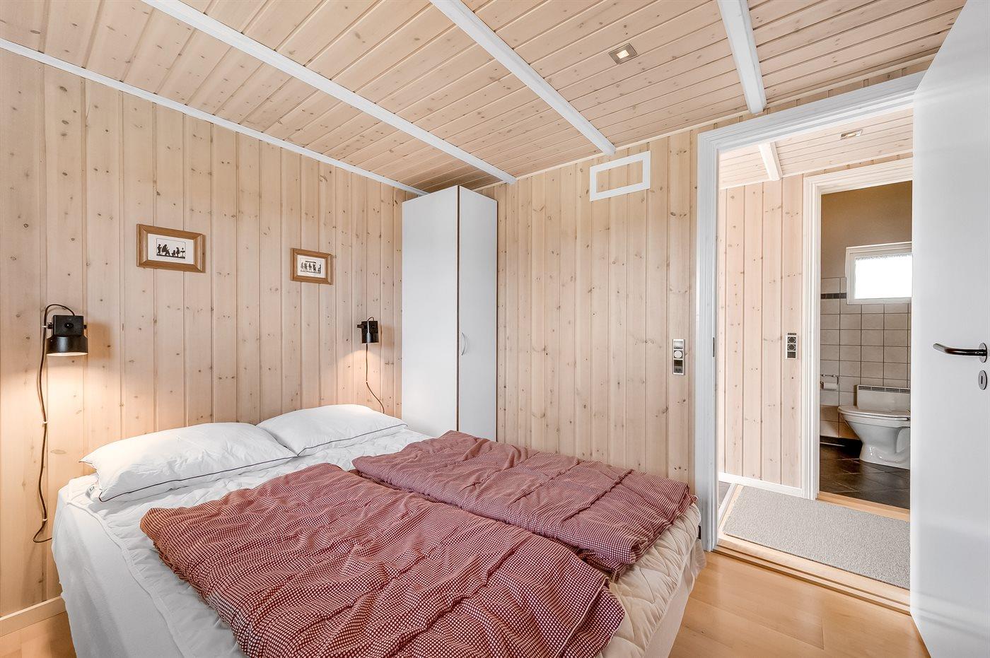 Hele huset er smagfuldt og funktionelt indrettet. Badeværelse med gulvvarme, bruseniche, adgang til 4 pers. sauna samt 3 pers. spa - dæmp lyset, tænd for massagedyserne og højtalerne på badeværelset, hvorefter stemningen fuldendes når stjernehimlen tændes efter et tryk på stikkontakten. Køkkenet er kombineret med opholdsstuen og bl.a. udstyret med opvaskemaskine, mikrobølgeovn, fryser, varmluftovn og komfur med keramiske kogeplader. I den rummelige opholds-/spisestue, med adgang til den overdækkede terrasse, finder I brændeovn, stereoanlæg med CD-afspiller, video, DVD-afspiller og TV med parabol (digital). Husets sovepladser fordeler sig på 3 værelser; 2 med dobbeltseng og 1 med 2 enkeltsenge.
