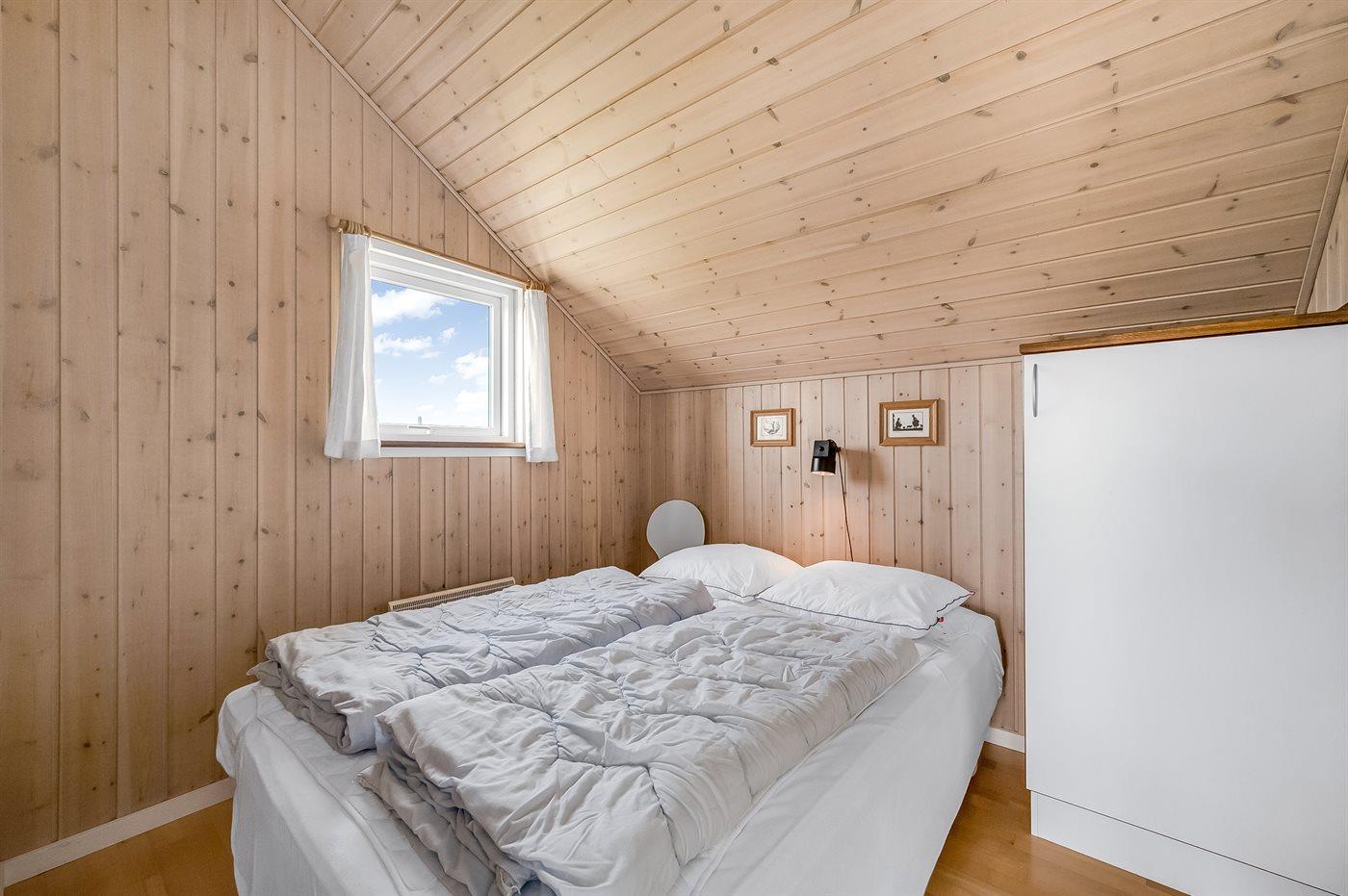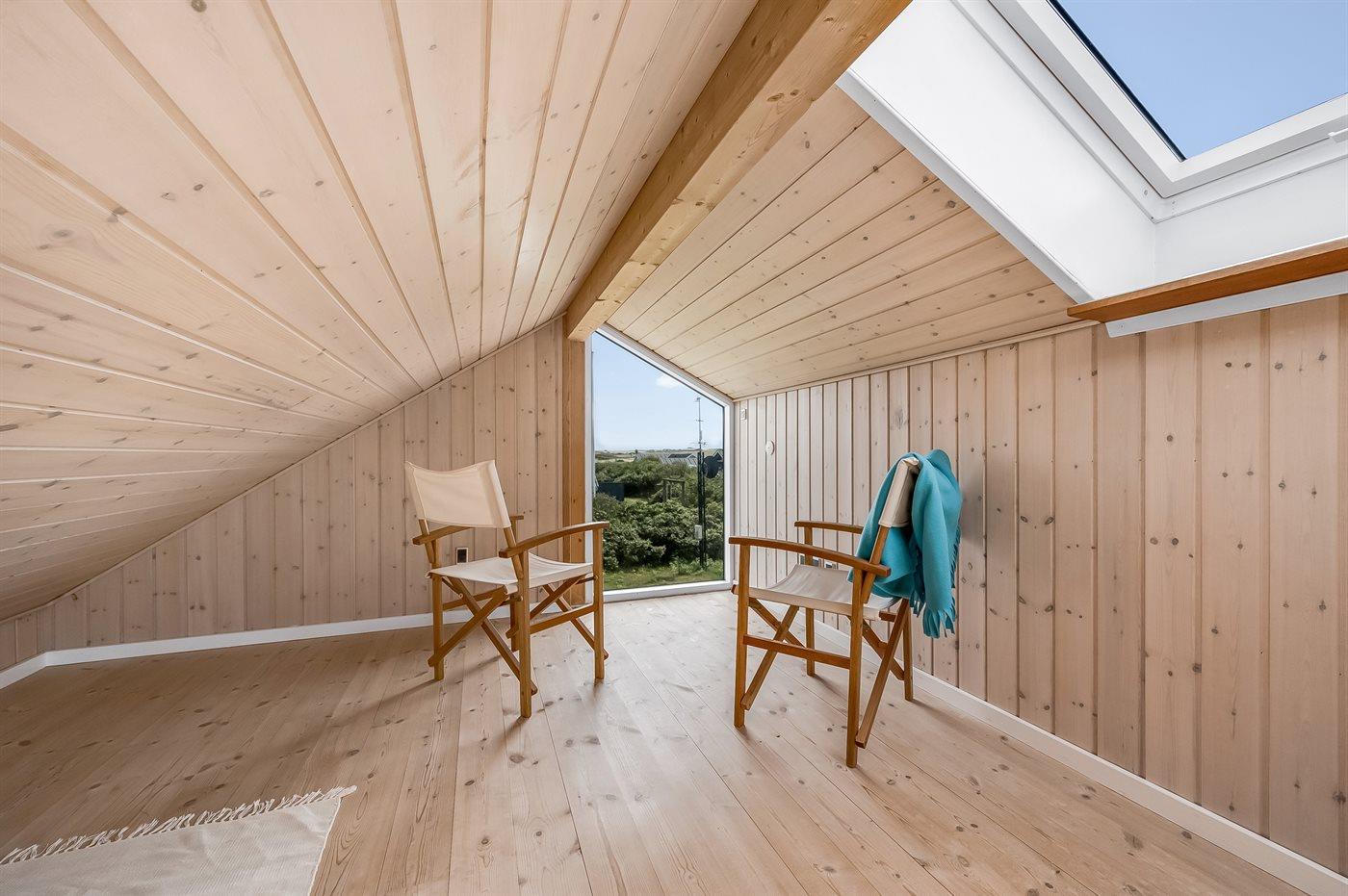 Til huset hører dejlige, såvel åbne som overdækkede terrasser med havemøbler. Nyd morgensolen og udsigten over bl.a. klitterne og Ferring Sø fra den 28 m2 store hems med delvis ståhøjde.