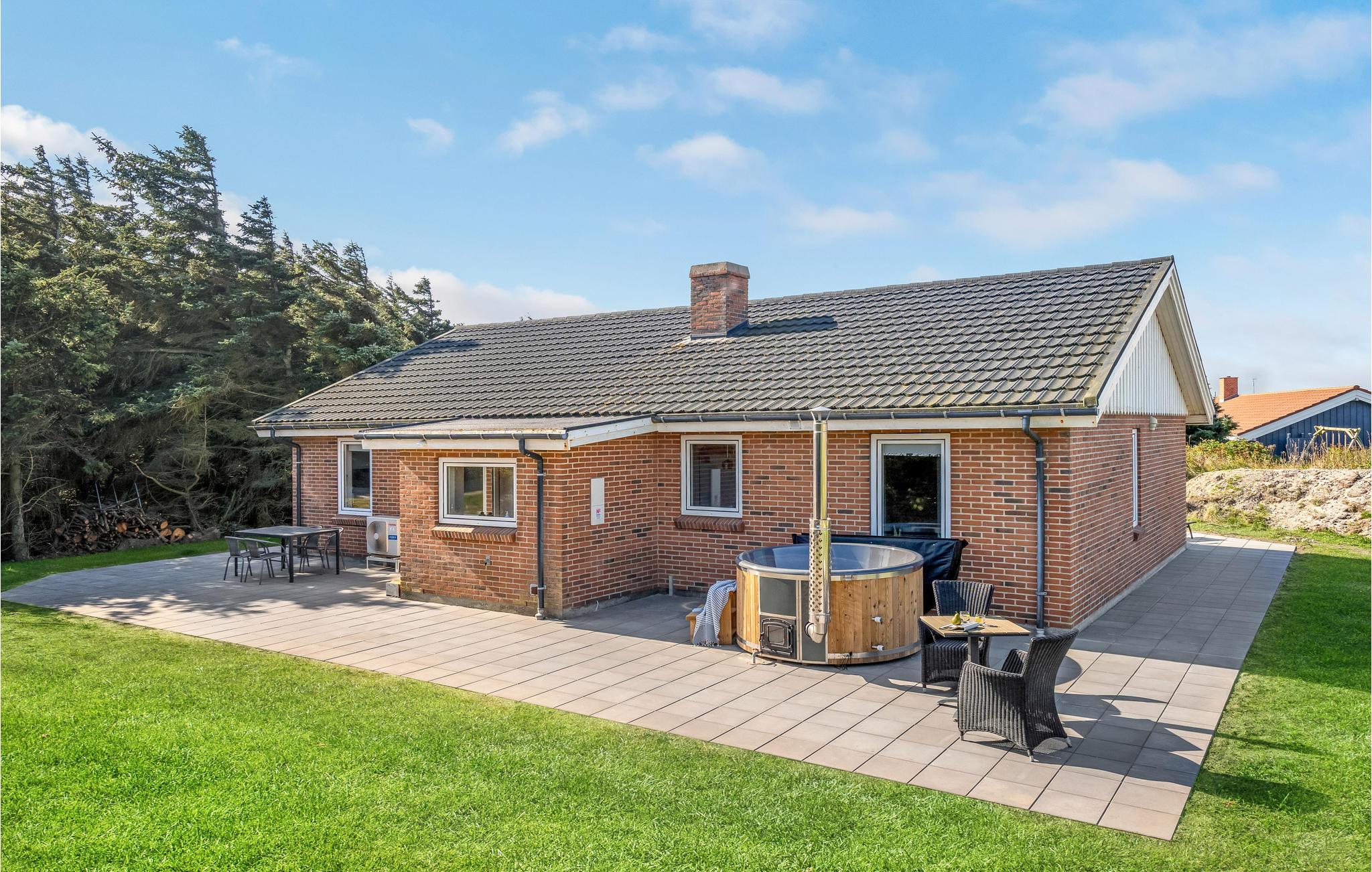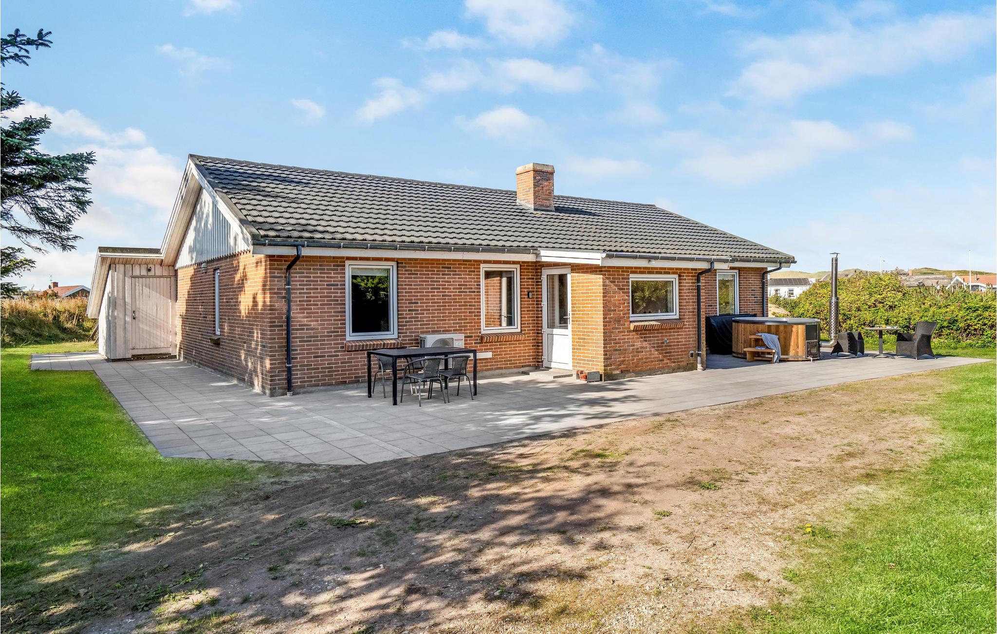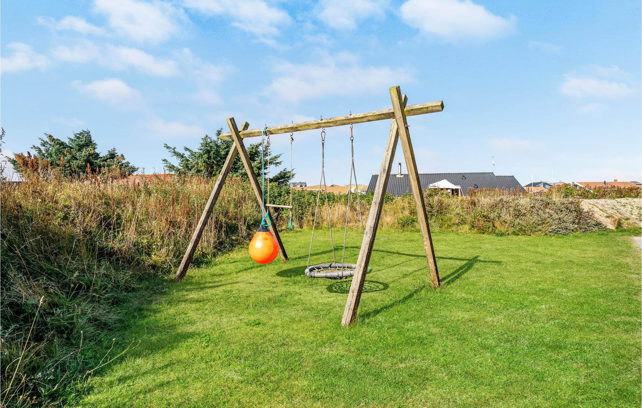 I hjertet af Vejlby Klit ligger dette særdeles velindrettede feriehus, med praktisk køkken der ligger i åben forbindelse med stuen. Herfra kommer I ud på den dejlige terrasse, hvor grillen også står og hvor det er skønt at slappe af på de lange lyse sommerdage. Husets soveværelser ligger i hver sin side, med badeværelse til adskillelse, det ene med spa og sauna. Efter en lang gåtur langs havet, er det pragtfuldt at hoppe i spaen og bagefter i saunaen og blive godt varm igen. Familiens børn vil med garanti sætte pris på hemsen, hvor der er indrettet legeværelse, her kan de få mange timer til at gå, uden at kede sig. Udendørs sørger den specielle gynge for adspredelse.