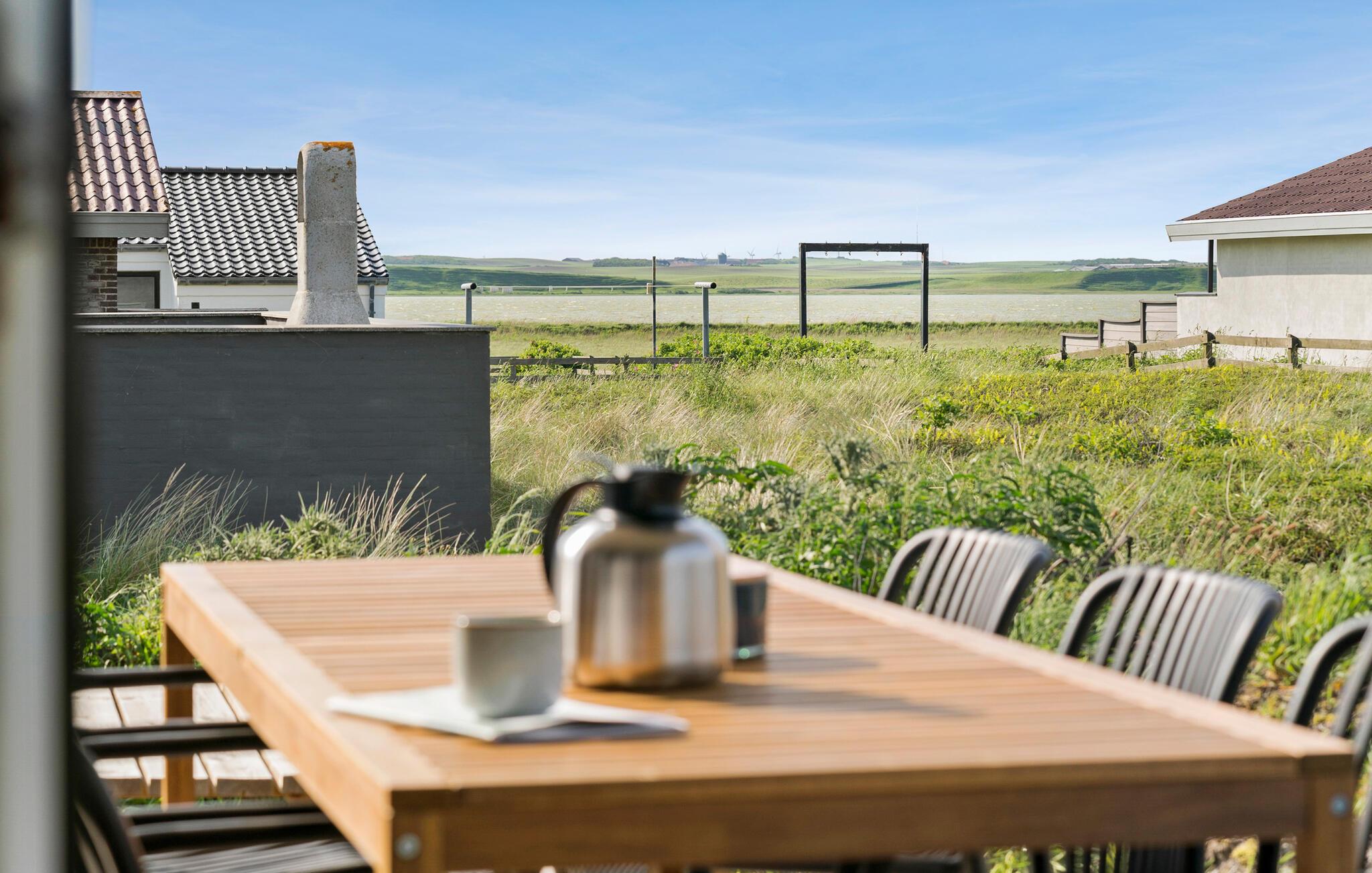 Moderne træhus med panoramaudsigt over Ferring Sø ved Vesterhavet, tæt på strand og natur.