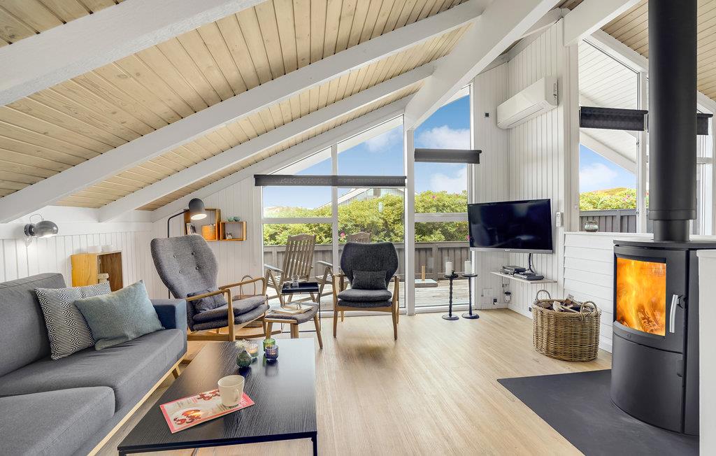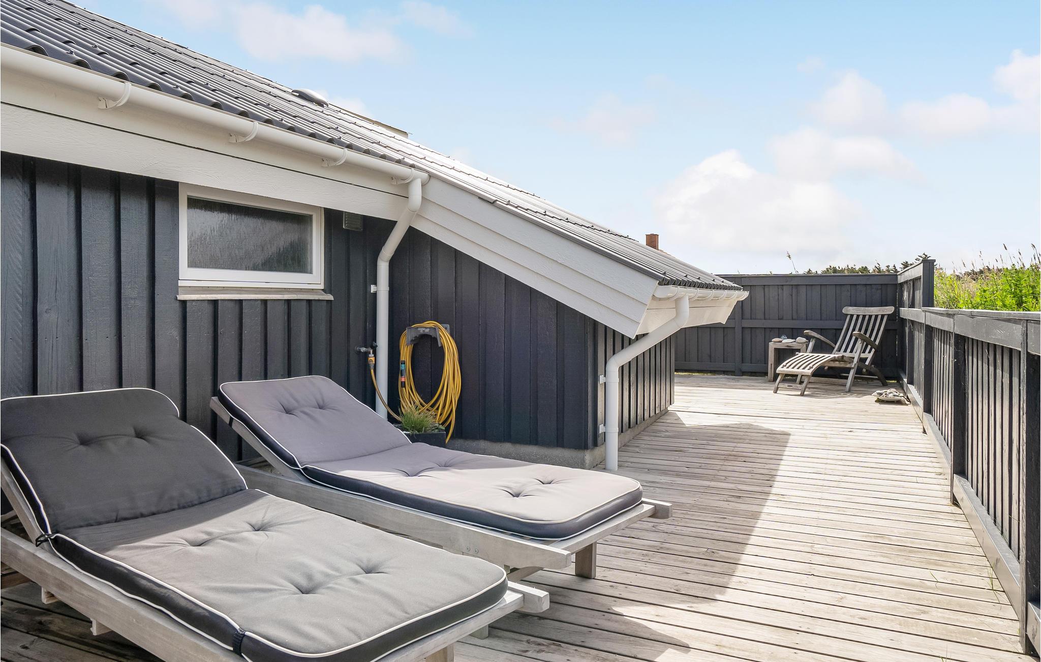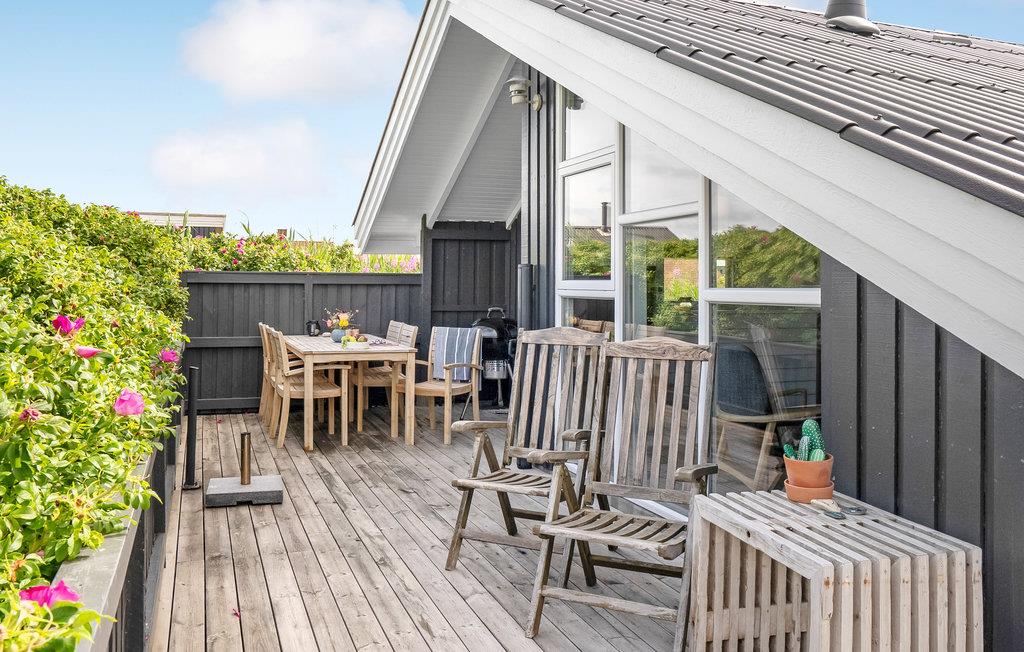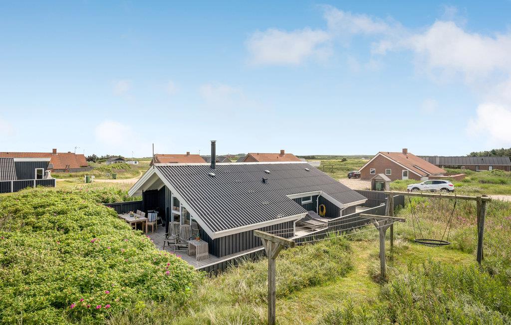Tæt på Vesterhavet, midt i det skønne klitlandskab, finder I dette idylliske, pænt renoverede feriehus bygget i træ. Feriehuset er hyggeligt og smagfuldt indrettet med sans for detaljen og indbyder til hygge og afslapning. Det indeholder et godt køkken med stort køle-fryseskab, tre soveværelser samt en dejlig stue med kvalitetsmøbler, stort tv og brændeovn m.m. Udendørs er der anlagt terrasser mod syd, øst og vest, så der er altid en mulighed for at finde læ og nyde solen. På to af terrasserne er der havebord med stole og på den sidste terrasse findes liggestole. Huset ligger for enden af en lukket vej med stisystem til en købmand. Selve området indbyder til udendørs aktiviteter som drageflyvning, hygge på stranden, gå-/løbe- eller cykelture m.m. I kort afstand fra huset ligger et trinbræt, hvor VLTJ (den lokale bane) kan transportere jer til Thyborøn og Lemvig. Hjemme igen, godt træt efter en dag i den friske havluft, kan dagen afsluttes med at tænde op i brændeovnen og lade roen sænke sig til lyden af den varme knitrende ild, mens tankerne får frit løb!