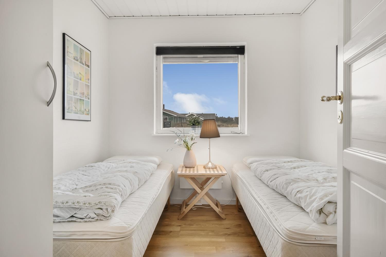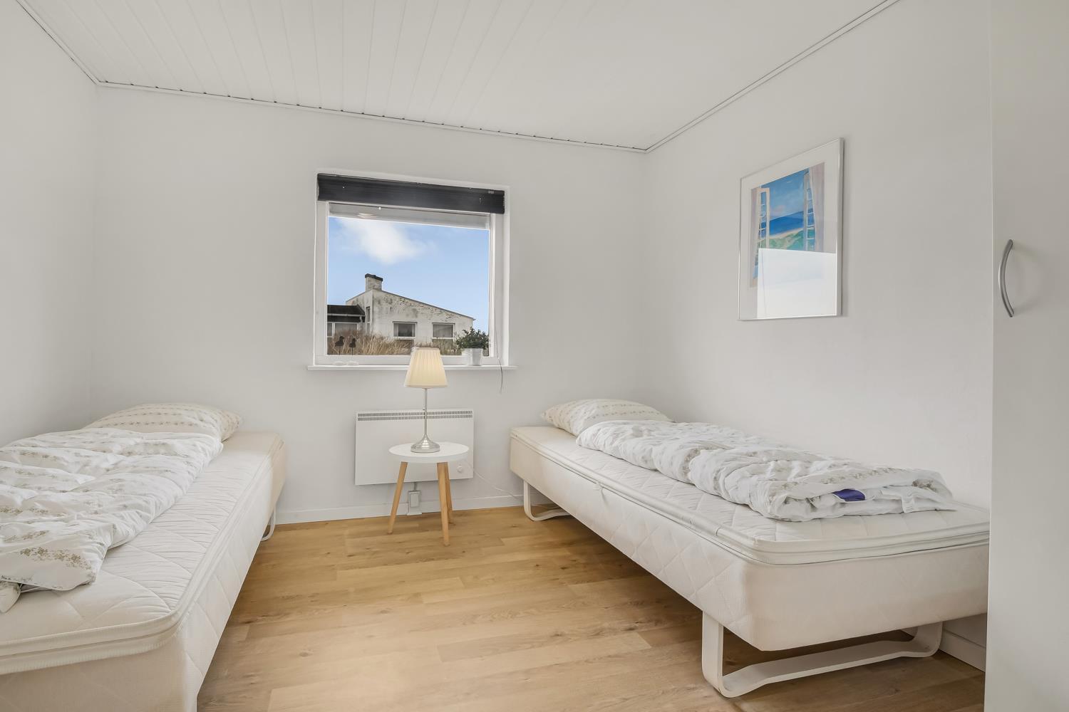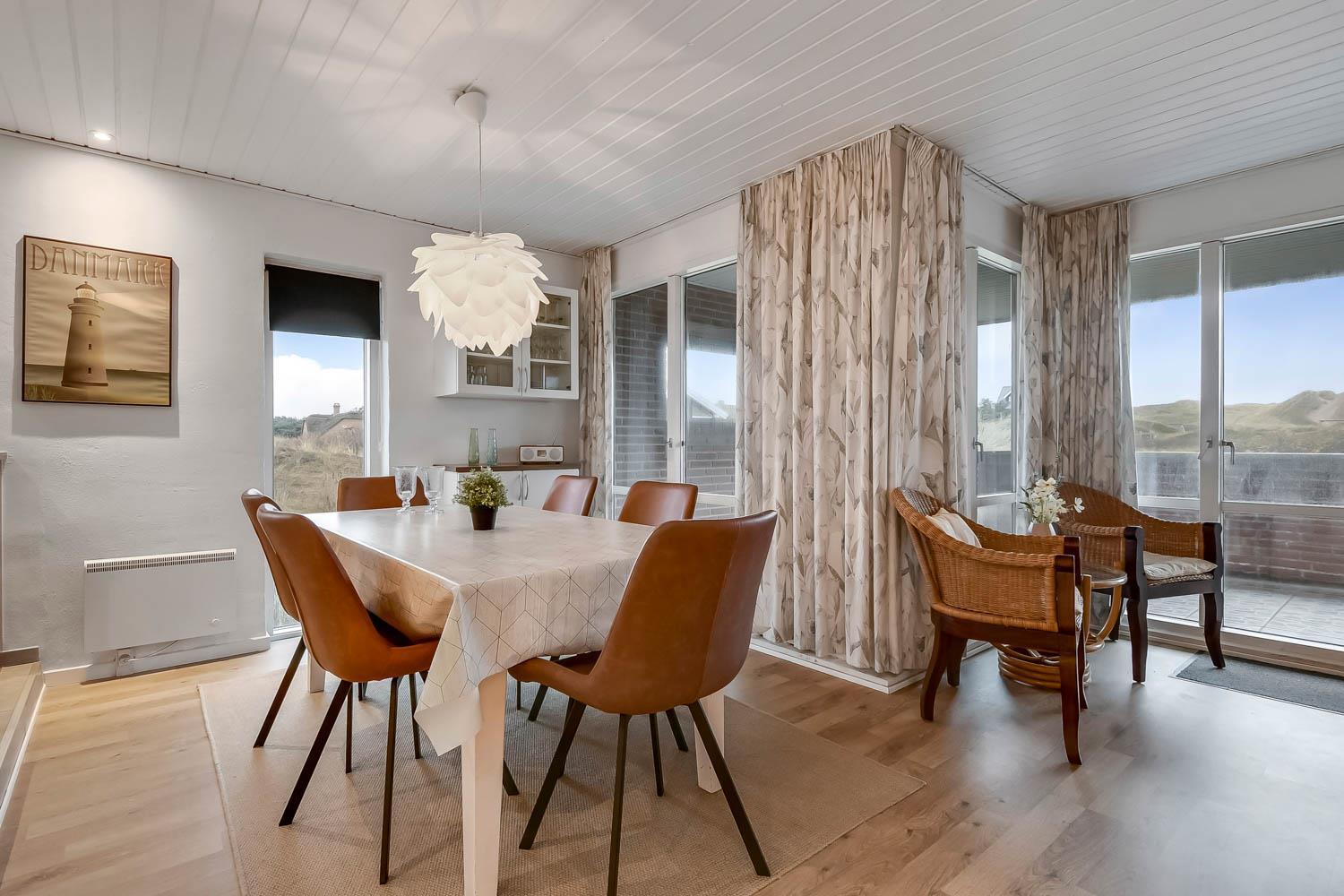 Allerede når bilen rammer grusvejen, bliver det klart at beliggenhed og hus er noget ganske særligt. Når man drejer ind på grunden og parkerer bilen begynder ferien. En dejlig entre byder jer velkommen og fører jer direkte ind i en fordeler gang, hvor der er adgang til husets 3 soverum og badeværelse. Flot, moderne køkkenhjørne med udsigt til de høje klitter ved Vesterhavet. Køkkenet har alt i service og køkkengrej og er også udstyret med keramisk kogeplade, indbygningsovn, emhætte, mikroovn, køleskab med fryseboks og opvaskemaskine. Der er et trin fra køkkenet og ned til spiseafdelingen med spisebord og stole. Opholdsstuen har en dejlige lædermøbler og TV med danske som tyske kanaler. En dejlig brændeovn som giver ekstra hygge og behagelig varme. Fra stuen er der ligeledes udsigt til Klitterne. 3 værelser (1DS, 2S, 2S). Husets badeværelse har bruser, toilet, håndvask og klinkegulv med gulvvarme. Hele huset har trægulve. Ikke ryger hus. Husdyr ikke tilladt.