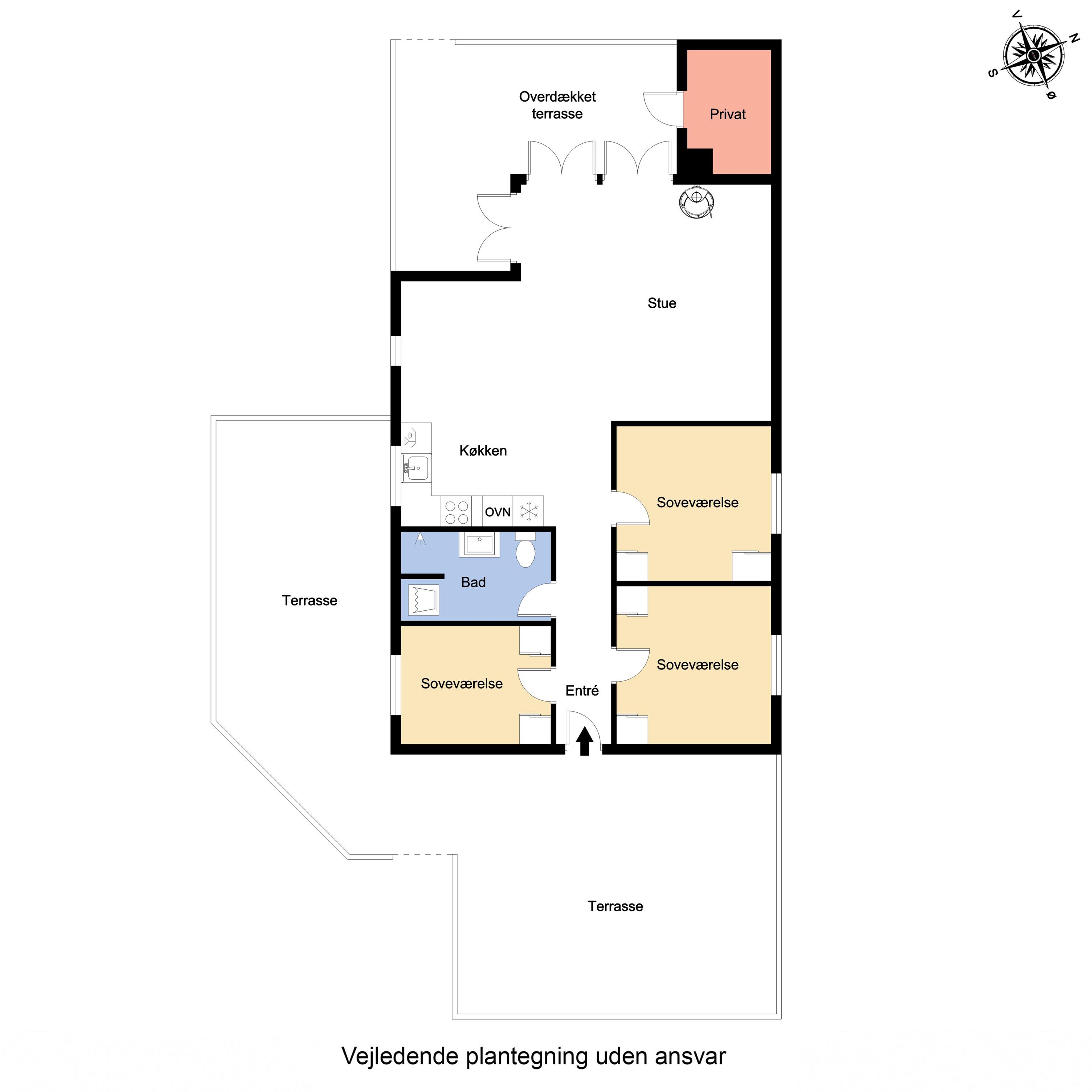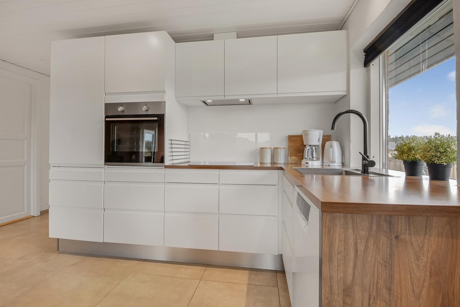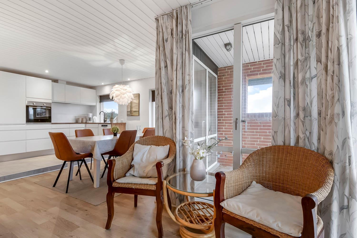 Allerede når bilen rammer grusvejen, bliver det klart at beliggenhed og hus er noget ganske særligt. Når man drejer ind på grunden og parkerer bilen begynder ferien. En dejlig entre byder jer velkommen og fører jer direkte ind i en fordeler gang, hvor der er adgang til husets 3 soverum og badeværelse. Flot, moderne køkkenhjørne med udsigt til de høje klitter ved Vesterhavet. Køkkenet har alt i service og køkkengrej og er også udstyret med keramisk kogeplade, indbygningsovn, emhætte, mikroovn, køleskab med fryseboks og opvaskemaskine. Der er et trin fra køkkenet og ned til spiseafdelingen med spisebord og stole. Opholdsstuen har en dejlige lædermøbler og TV med danske som tyske kanaler. En dejlig brændeovn som giver ekstra hygge og behagelig varme. Fra stuen er der ligeledes udsigt til Klitterne. 3 værelser (1DS, 2S, 2S). Husets badeværelse har bruser, toilet, håndvask og klinkegulv med gulvvarme. Hele huset har trægulve. Ikke ryger hus. Husdyr ikke tilladt.