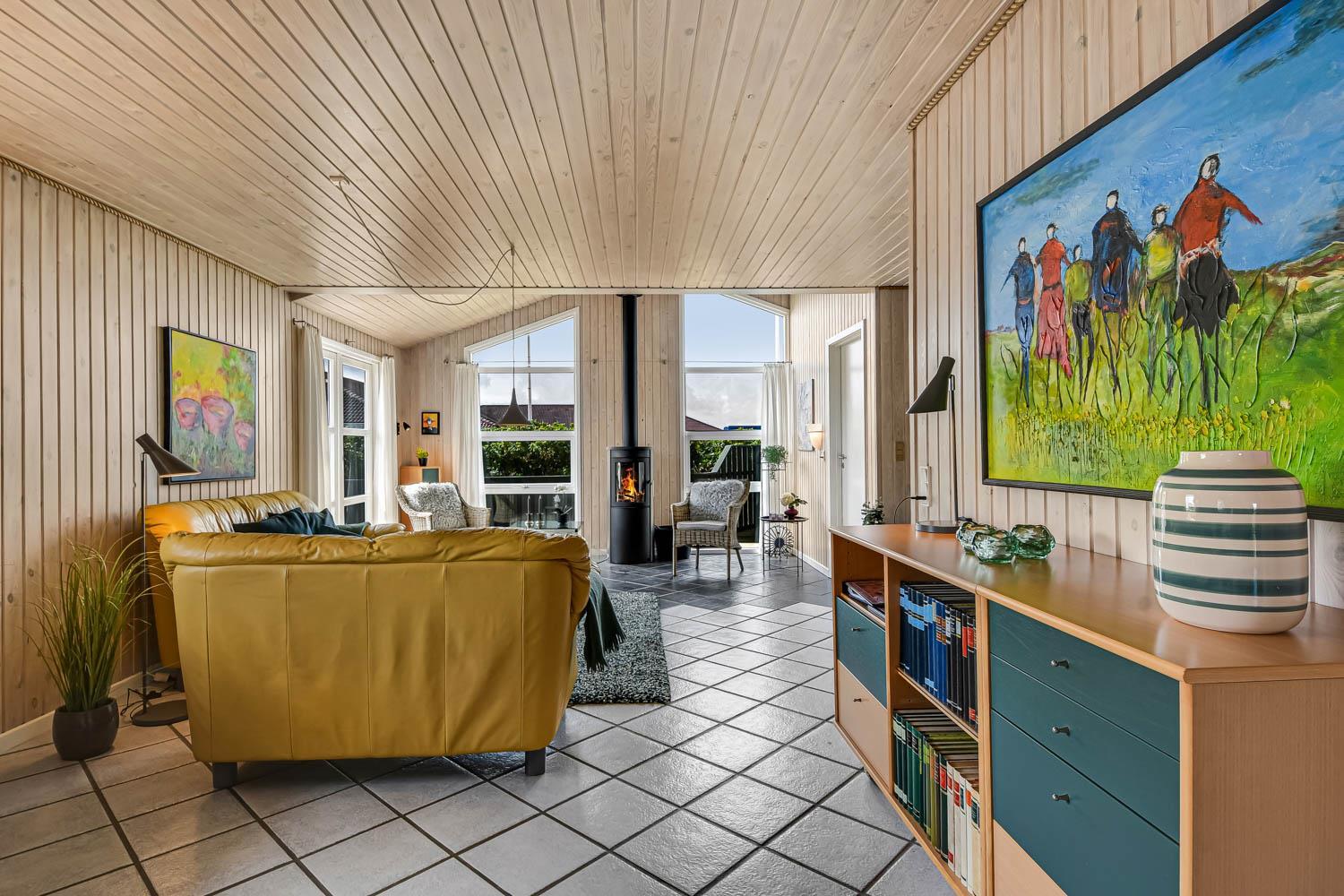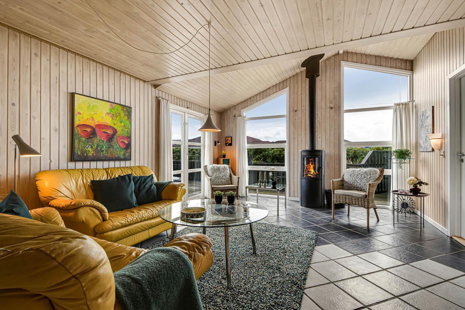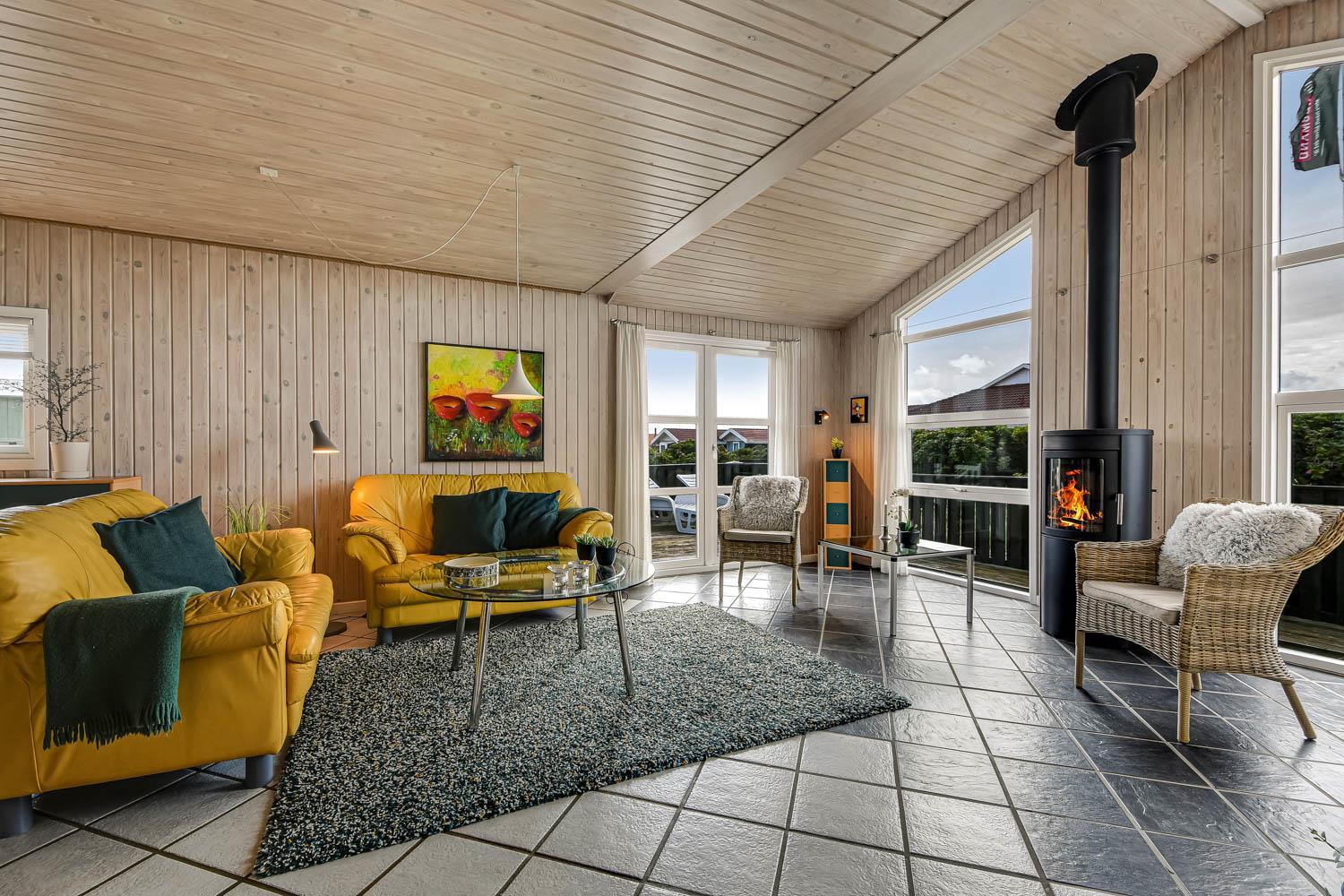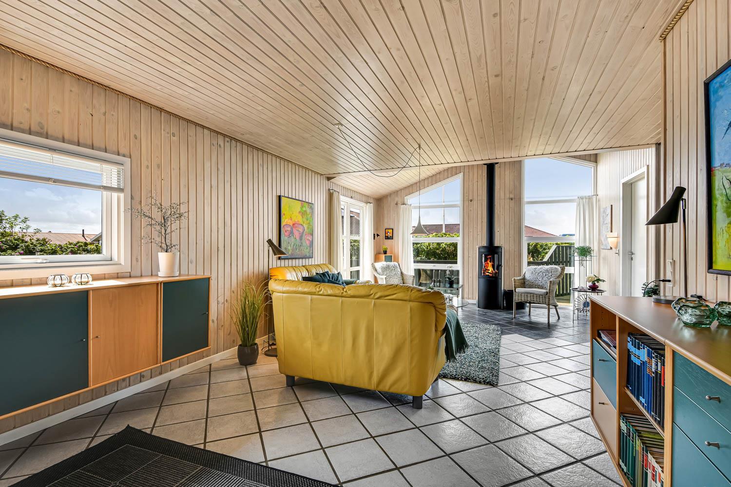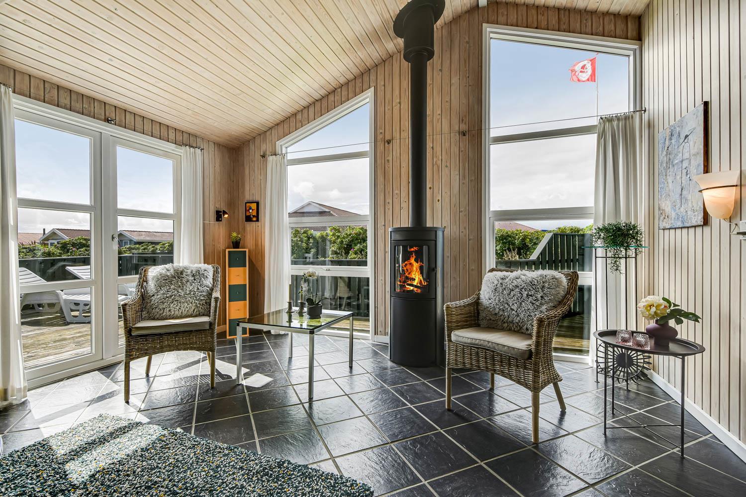 Dette flotte feriehus er 98 m2. Huset fremstår overalt lyst og venligt og har 3 soverum - alle med 3/4 dobbeltsenge. Kombineret opholdsstue og køkkenhjørne. Dejlig, åben opholdsstue - hyggeligt indrettet med gode polstermøbler, spiseplads, TV med danske og tyske kanaler og Chromecast til streaming af TV / radio / Apps, så har du en mobiltelefon eller et andet device med kan du streame hvad du nu har abonnement til. Der er radio. Slap af foran den knitrende brændeovn som sammen med varmepumpen hjælper med at reducere udgiften til varmeregningen. Nyt og velindrettet køkkenhjørne fra 2023 med alt i service og køkkengrej. Her findes elkeramisk kogeplade og indbygningovn, mikroovn, emhætte, opvaskemaskine og køle-fryseskab. Badeværelse med toilet, håndvask, bruser, vaskemaskine og klinkegulv med gulvvarme. Ikke ryger hus. Husdyr ikke tilladt.