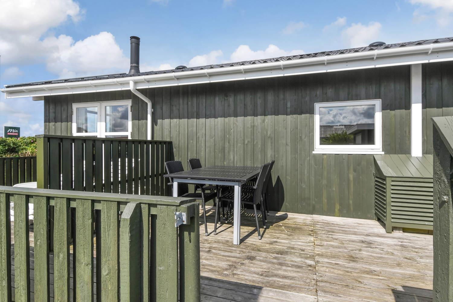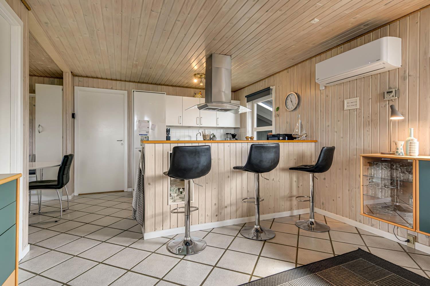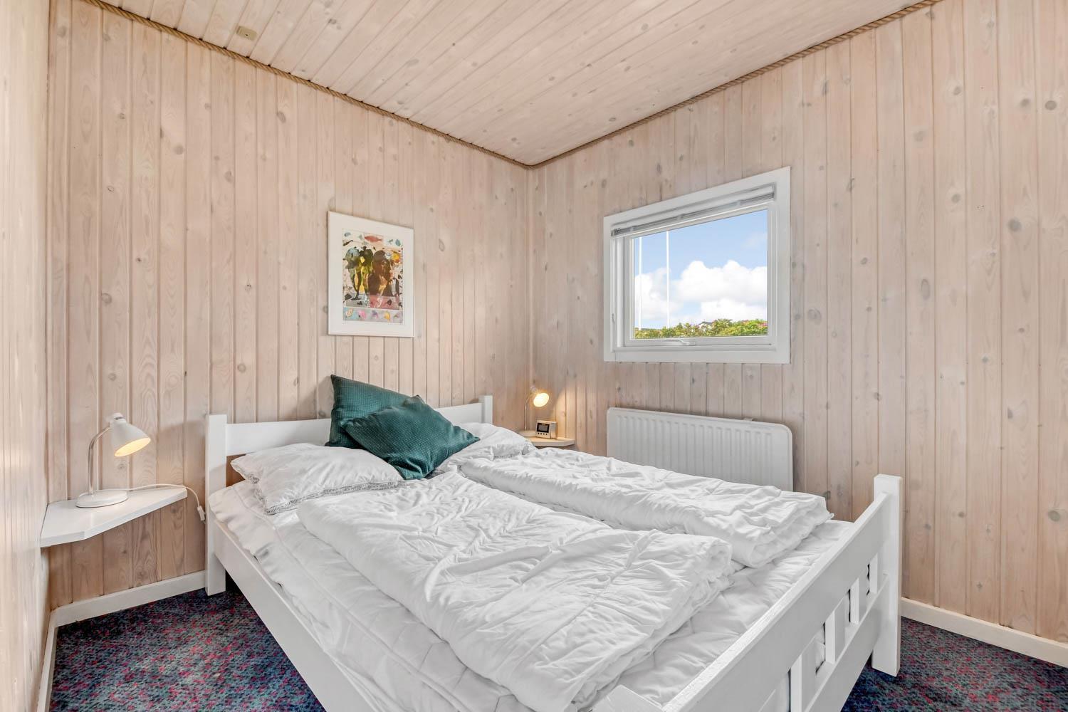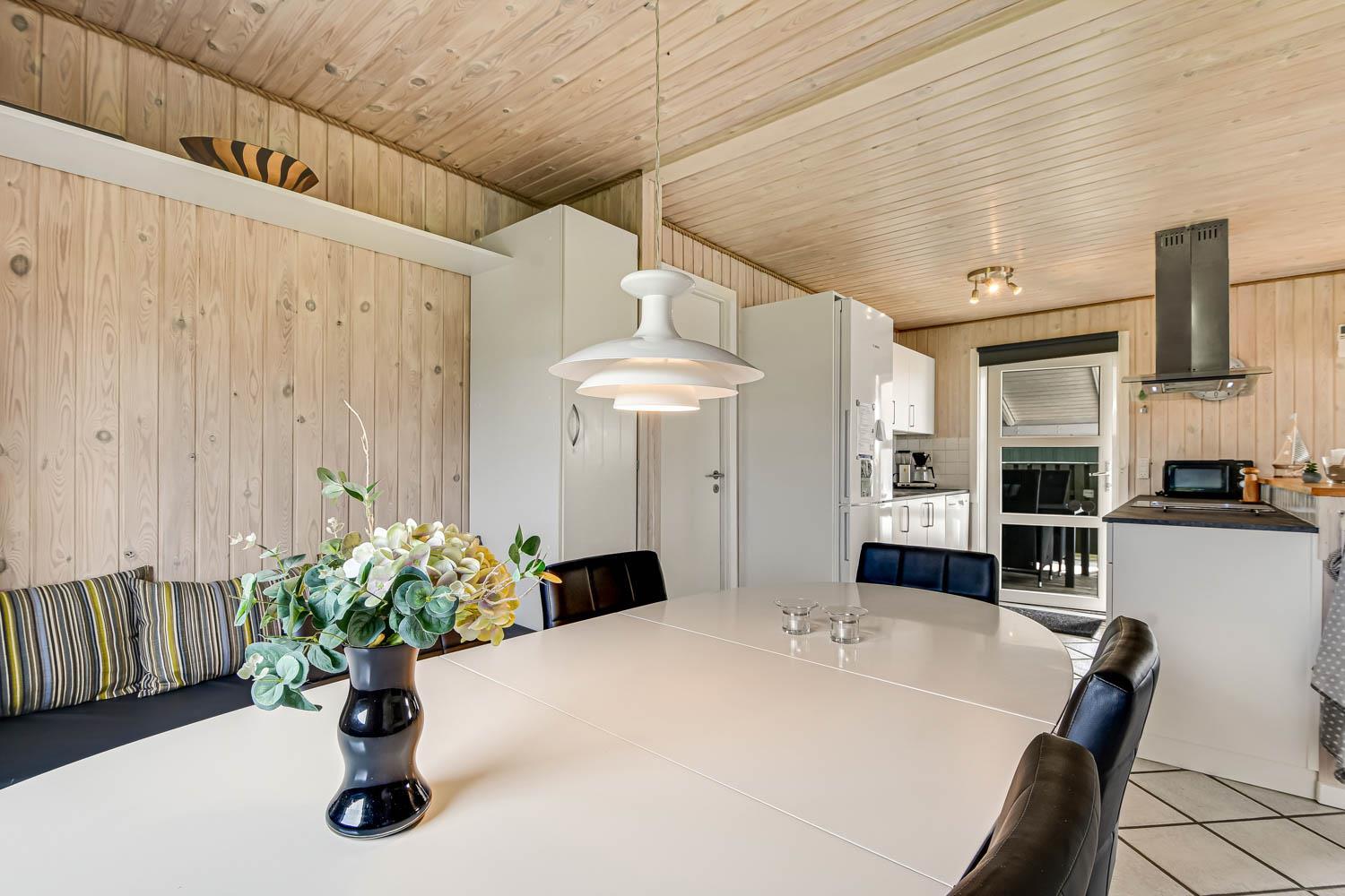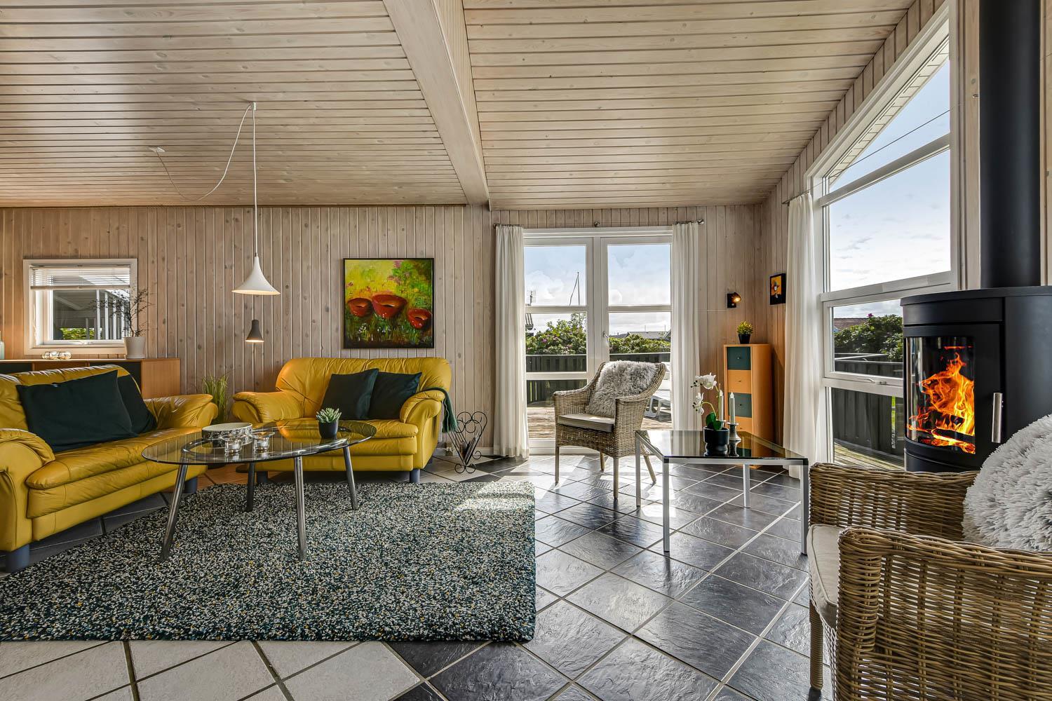 Dette flotte feriehus er 98 m2. Huset fremstår overalt lyst og venligt og har 3 soverum - alle med 3/4 dobbeltsenge. Kombineret opholdsstue og køkkenhjørne. Dejlig, åben opholdsstue - hyggeligt indrettet med gode polstermøbler, spiseplads, TV med danske og tyske kanaler og Chromecast til streaming af TV / radio / Apps, så har du en mobiltelefon eller et andet device med kan du streame hvad du nu har abonnement til. Der er radio. Slap af foran den knitrende brændeovn som sammen med varmepumpen hjælper med at reducere udgiften til varmeregningen. Nyt og velindrettet køkkenhjørne fra 2023 med alt i service og køkkengrej. Her findes elkeramisk kogeplade og indbygningovn, mikroovn, emhætte, opvaskemaskine og køle-fryseskab. Badeværelse med toilet, håndvask, bruser, vaskemaskine og klinkegulv med gulvvarme. Ikke ryger hus. Husdyr ikke tilladt.