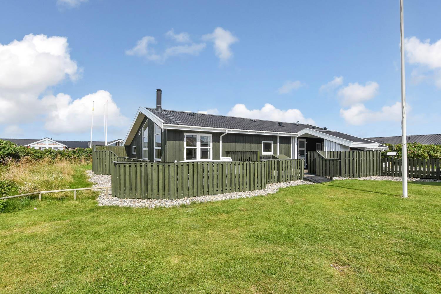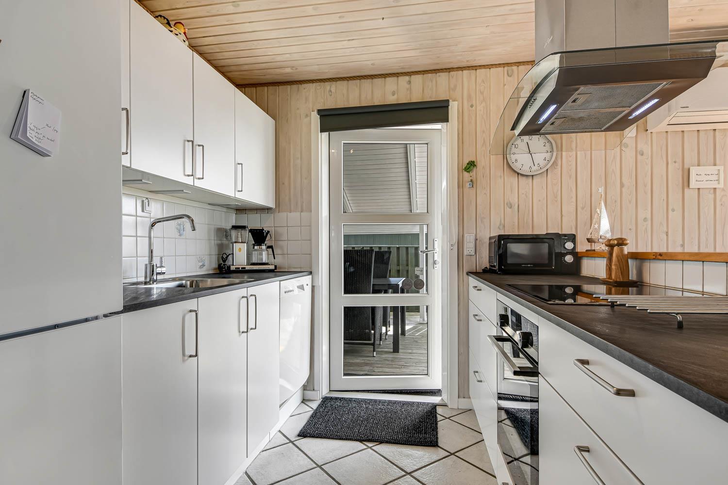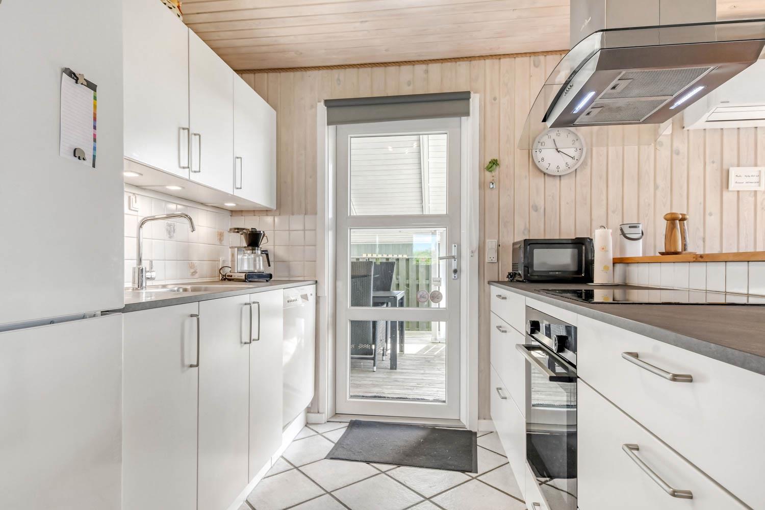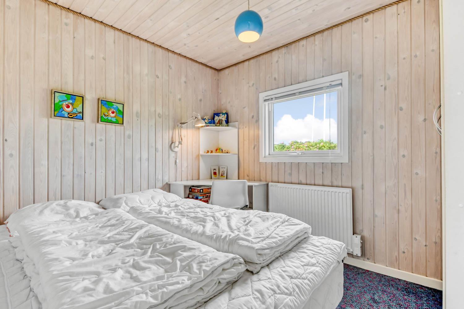 Dette flotte feriehus er 98 m2. Huset fremstår overalt lyst og venligt og har 3 soverum - alle med 3/4 dobbeltsenge. Kombineret opholdsstue og køkkenhjørne. Dejlig, åben opholdsstue - hyggeligt indrettet med gode polstermøbler, spiseplads, TV med danske og tyske kanaler og Chromecast til streaming af TV / radio / Apps, så har du en mobiltelefon eller et andet device med kan du streame hvad du nu har abonnement til. Der er radio. Slap af foran den knitrende brændeovn som sammen med varmepumpen hjælper med at reducere udgiften til varmeregningen. Nyt og velindrettet køkkenhjørne fra 2023 med alt i service og køkkengrej. Her findes elkeramisk kogeplade og indbygningovn, mikroovn, emhætte, opvaskemaskine og køle-fryseskab. Badeværelse med toilet, håndvask, bruser, vaskemaskine og klinkegulv med gulvvarme. Ikke ryger hus. Husdyr ikke tilladt.