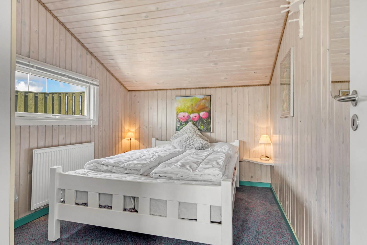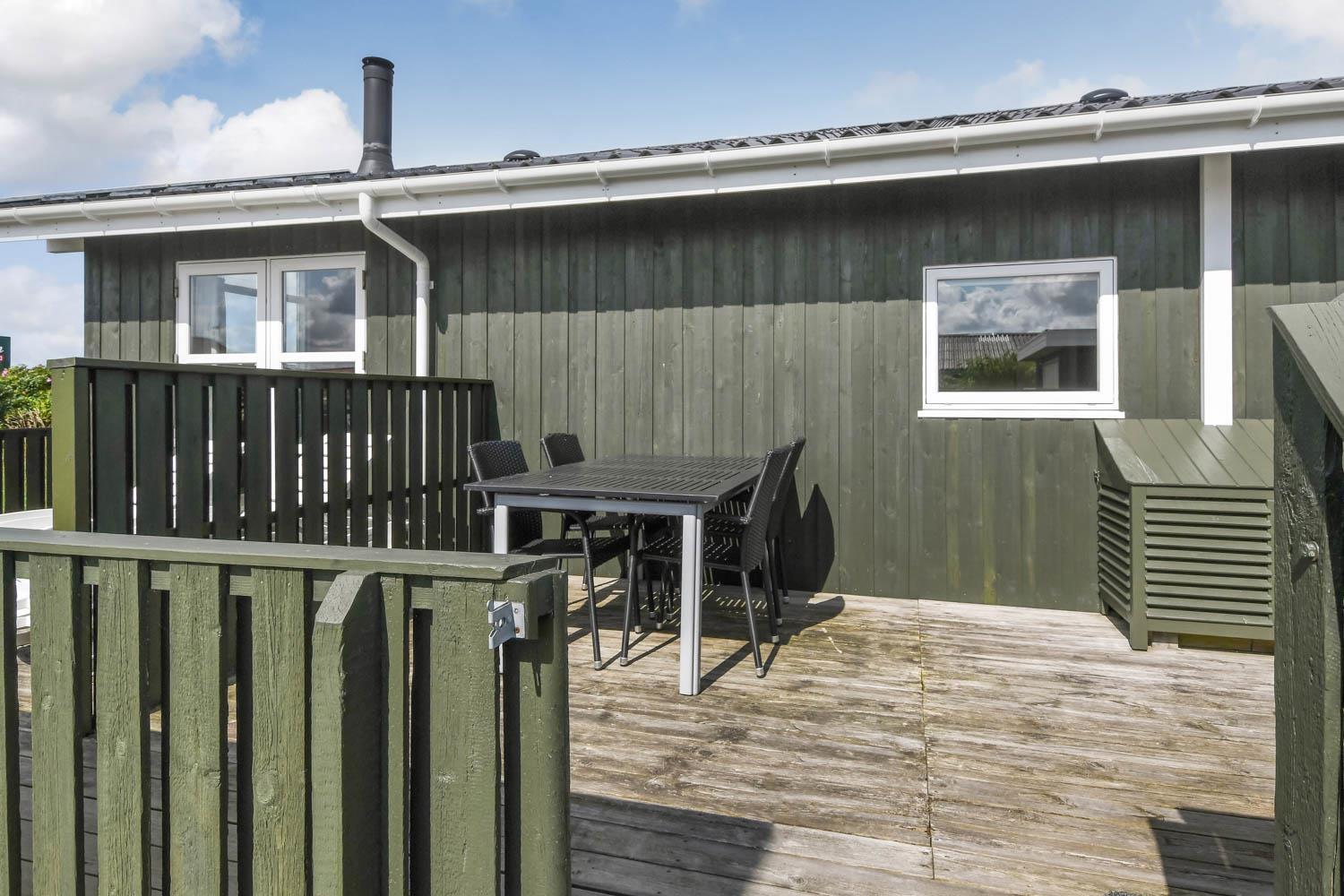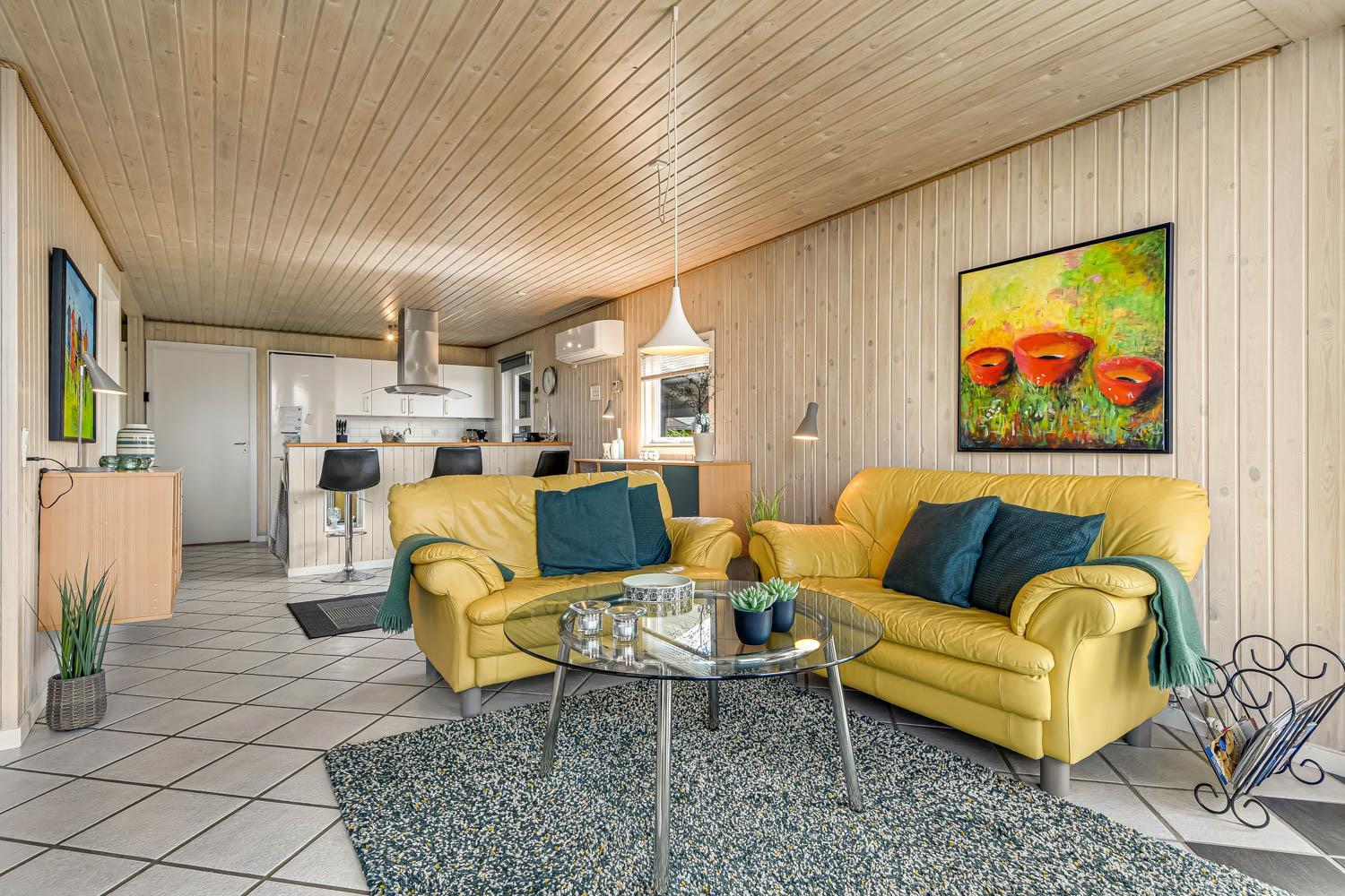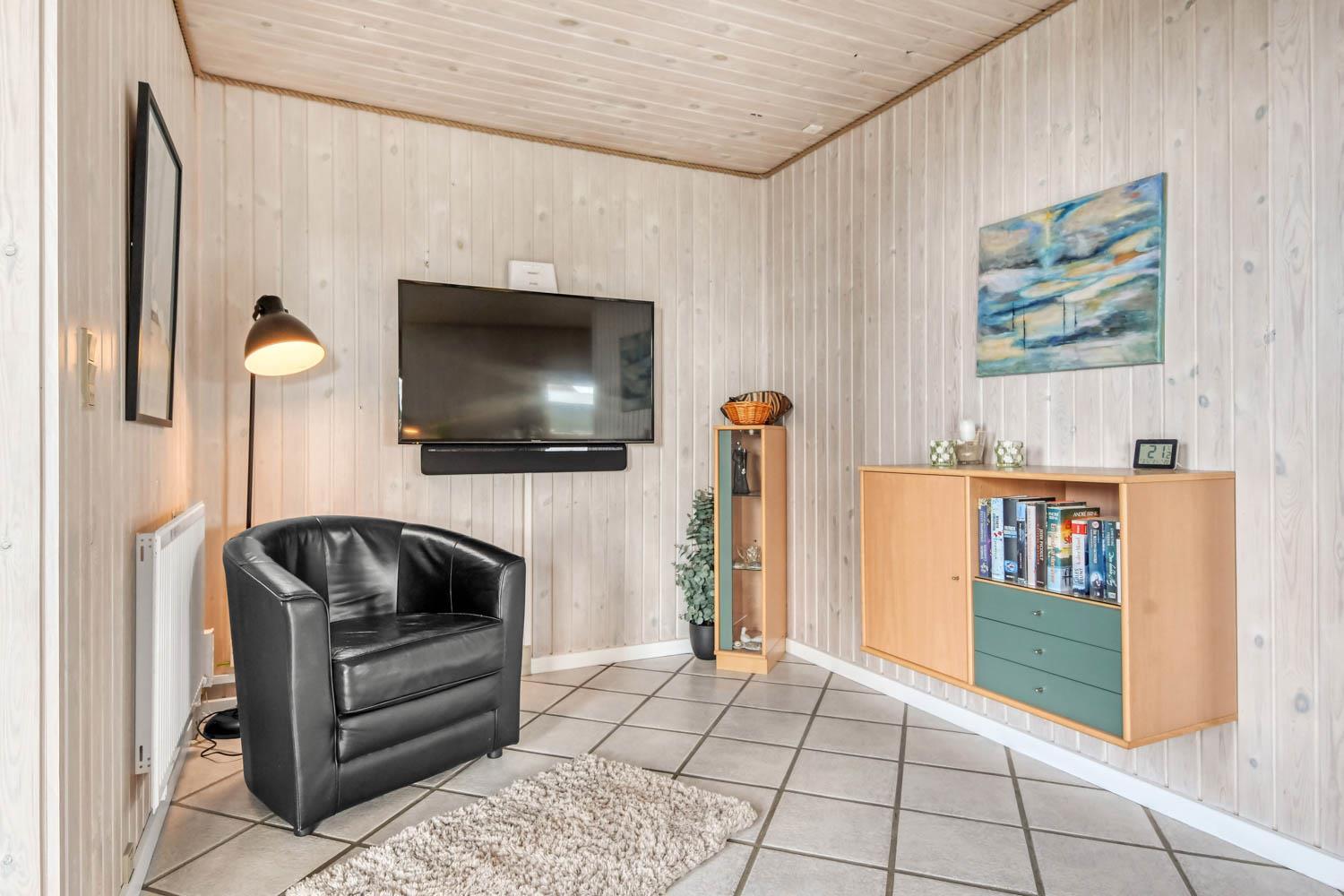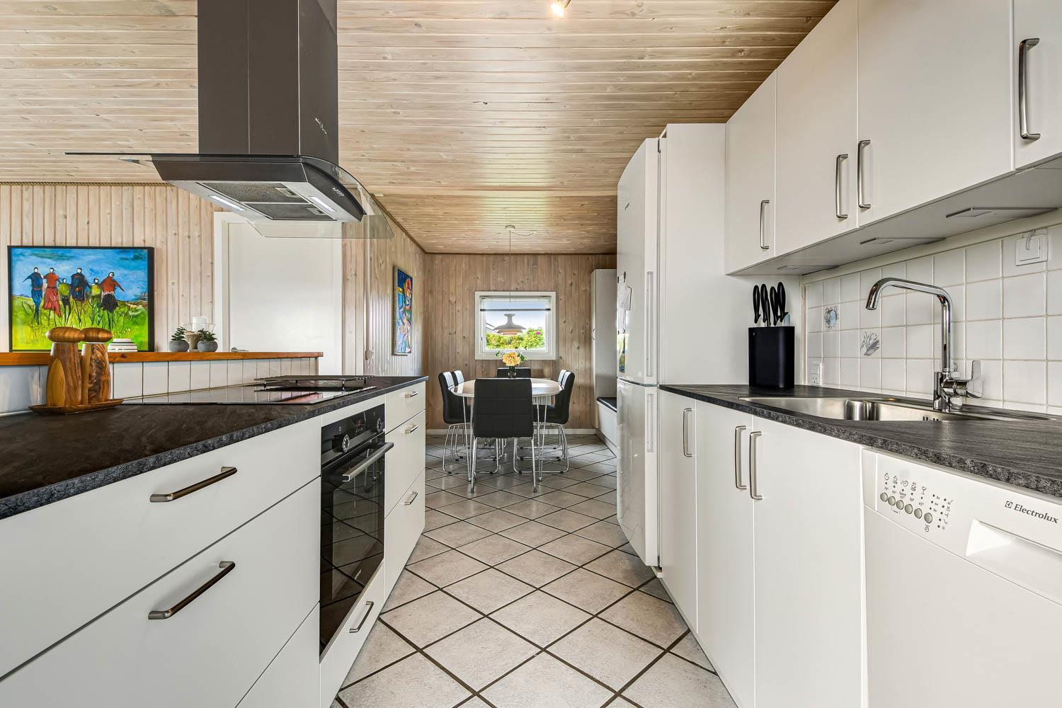Dette flotte feriehus er 98 m2. Huset fremstår overalt lyst og venligt og har 3 soverum - alle med 3/4 dobbeltsenge. Kombineret opholdsstue og køkkenhjørne. Dejlig, åben opholdsstue - hyggeligt indrettet med gode polstermøbler, spiseplads, TV med danske og tyske kanaler og Chromecast til streaming af TV / radio / Apps, så har du en mobiltelefon eller et andet device med kan du streame hvad du nu har abonnement til. Der er radio. Slap af foran den knitrende brændeovn som sammen med varmepumpen hjælper med at reducere udgiften til varmeregningen. Nyt og velindrettet køkkenhjørne fra 2023 med alt i service og køkkengrej. Her findes elkeramisk kogeplade og indbygningovn, mikroovn, emhætte, opvaskemaskine og køle-fryseskab. Badeværelse med toilet, håndvask, bruser, vaskemaskine og klinkegulv med gulvvarme. Ikke ryger hus. Husdyr ikke tilladt.