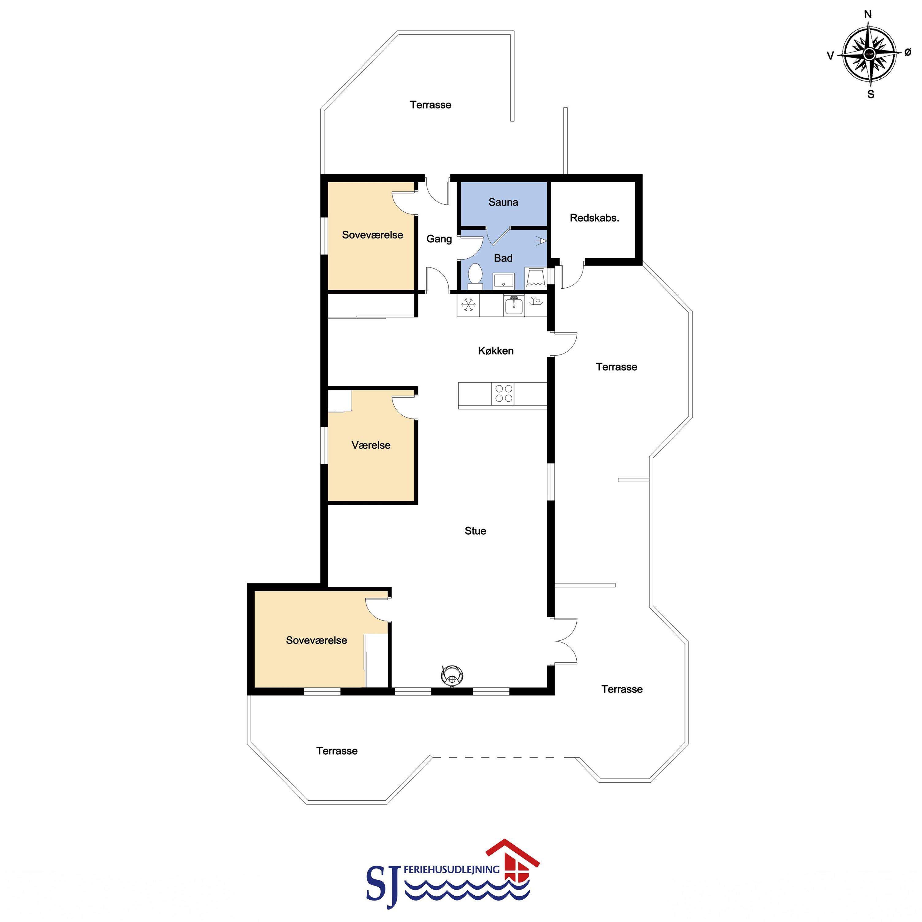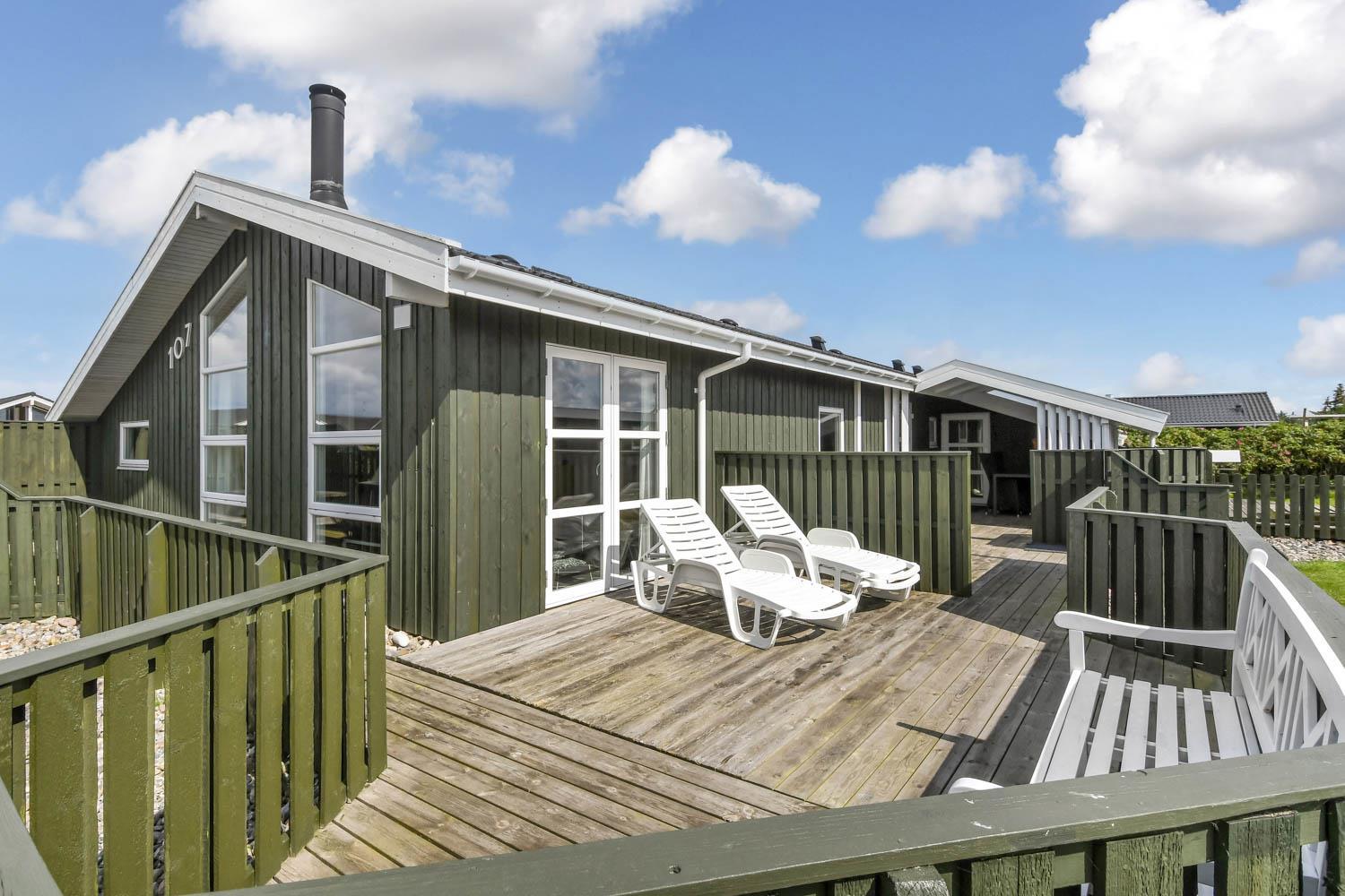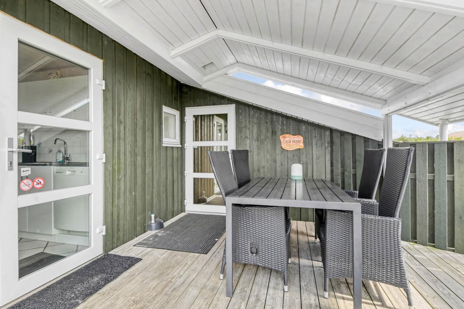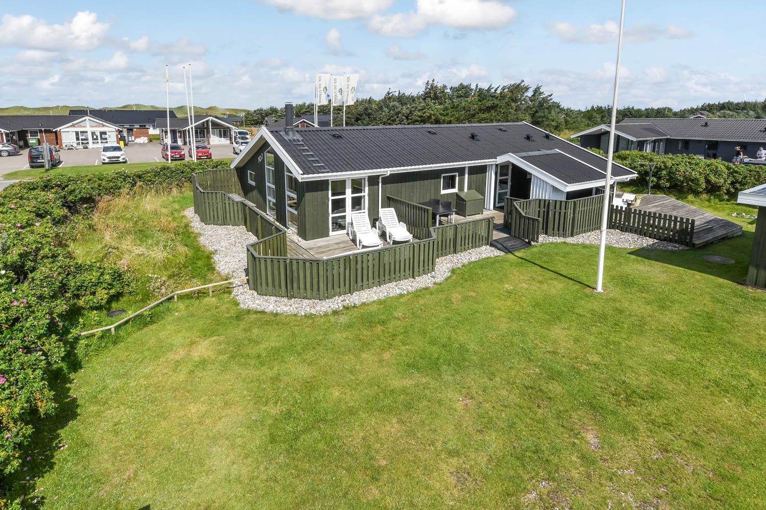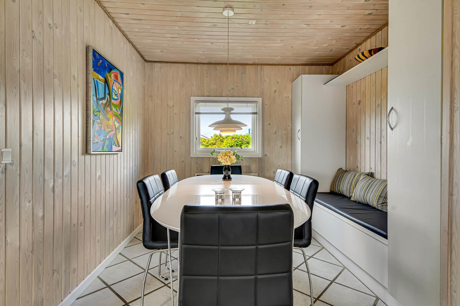 Dette flotte feriehus er 98 m2. Huset fremstår overalt lyst og venligt og har 3 soverum - alle med 3/4 dobbeltsenge. Kombineret opholdsstue og køkkenhjørne. Dejlig, åben opholdsstue - hyggeligt indrettet med gode polstermøbler, spiseplads, TV med danske og tyske kanaler og Chromecast til streaming af TV / radio / Apps, så har du en mobiltelefon eller et andet device med kan du streame hvad du nu har abonnement til. Der er radio. Slap af foran den knitrende brændeovn som sammen med varmepumpen hjælper med at reducere udgiften til varmeregningen. Nyt og velindrettet køkkenhjørne fra 2023 med alt i service og køkkengrej. Her findes elkeramisk kogeplade og indbygningovn, mikroovn, emhætte, opvaskemaskine og køle-fryseskab. Badeværelse med toilet, håndvask, bruser, vaskemaskine og klinkegulv med gulvvarme. Ikke ryger hus. Husdyr ikke tilladt.
