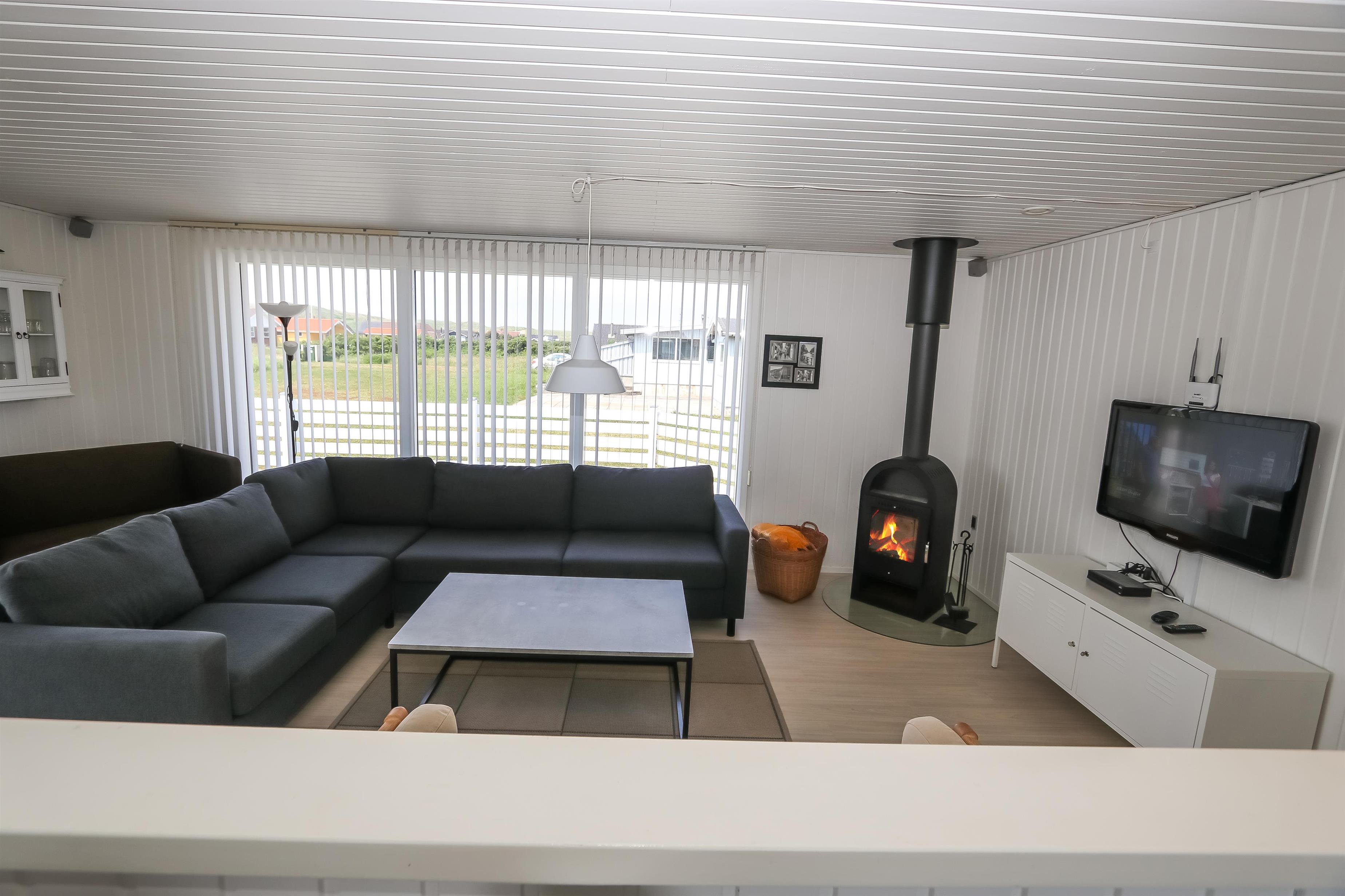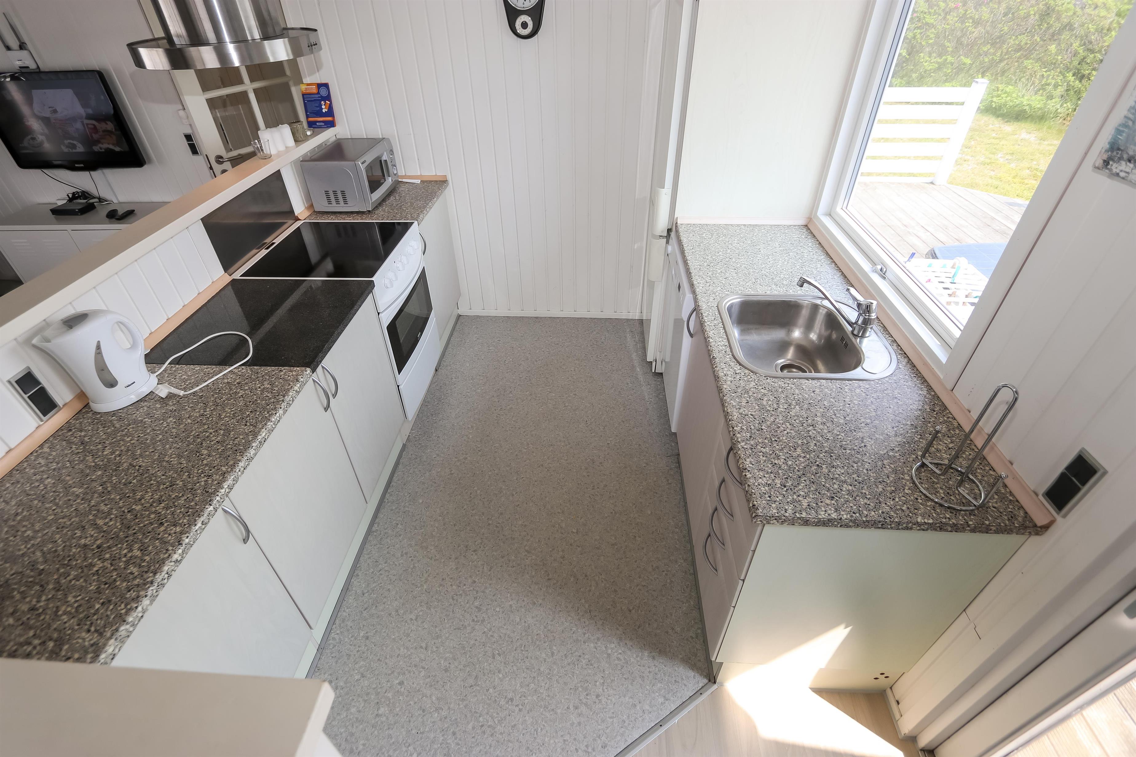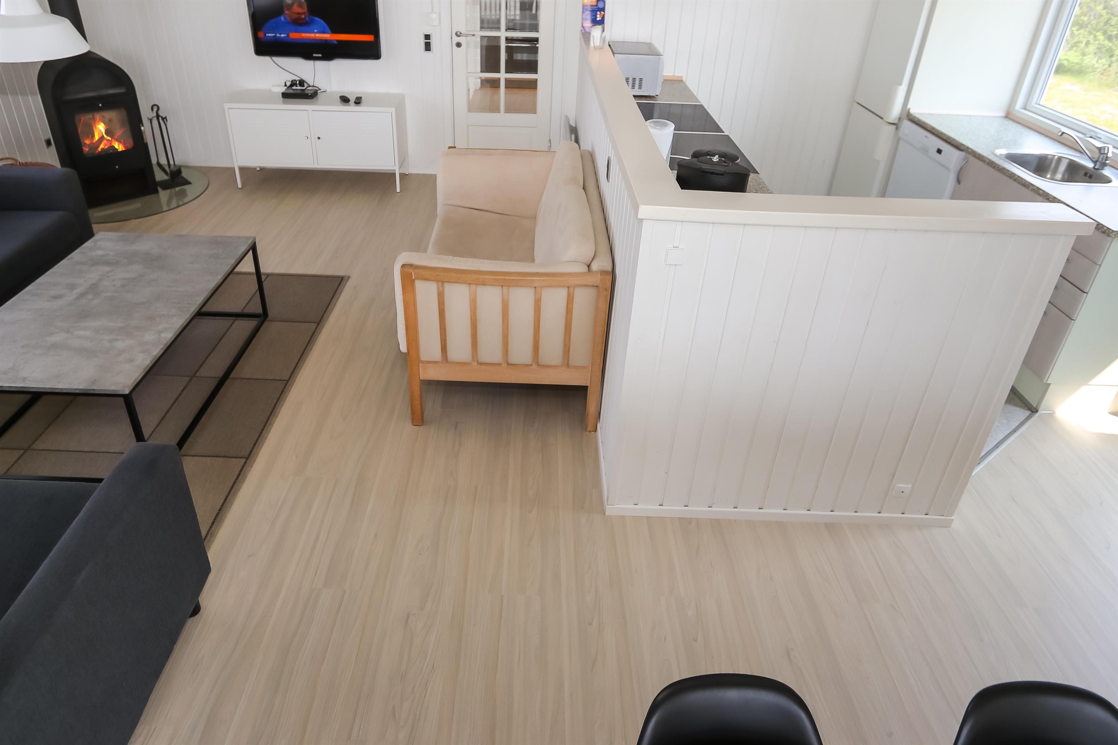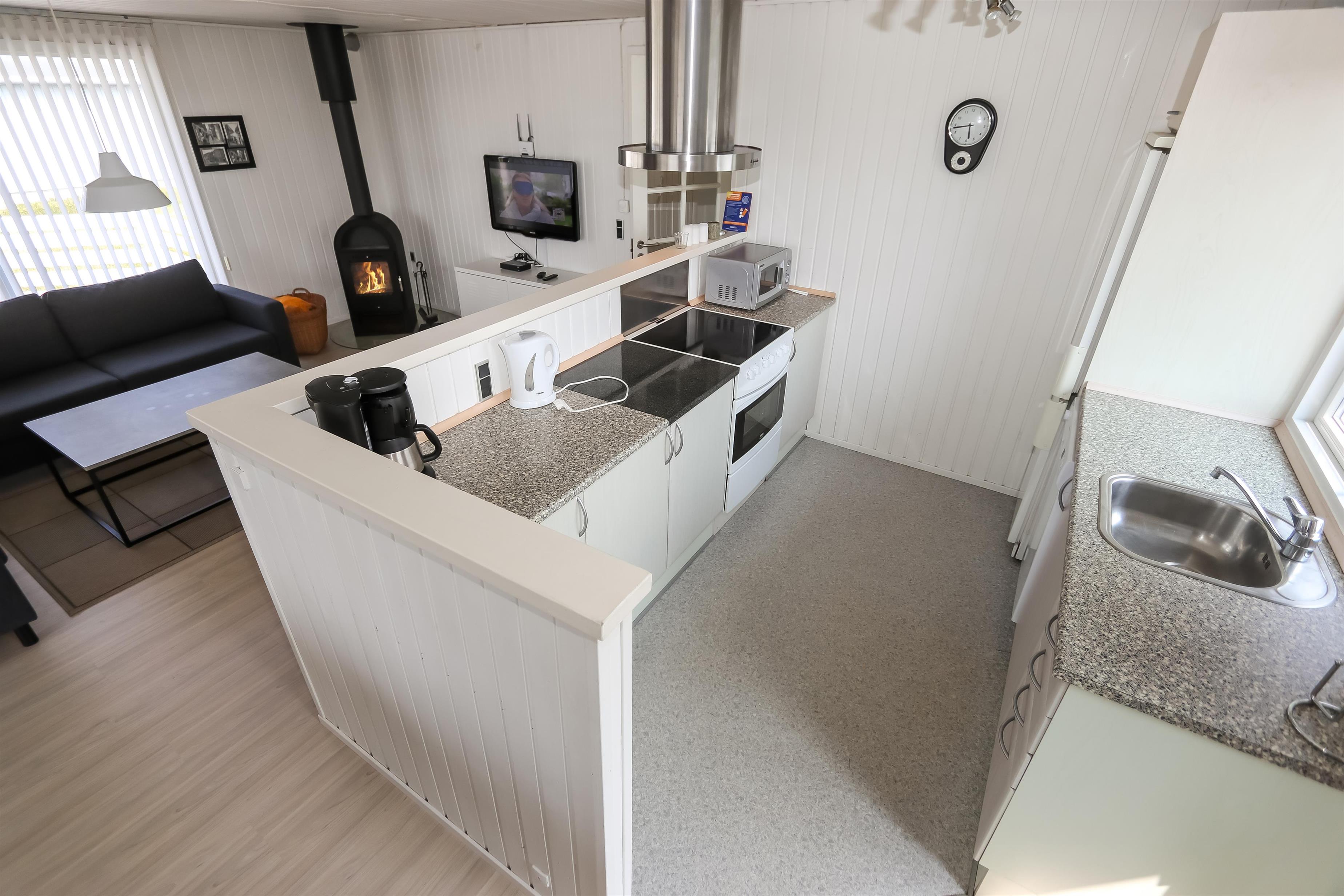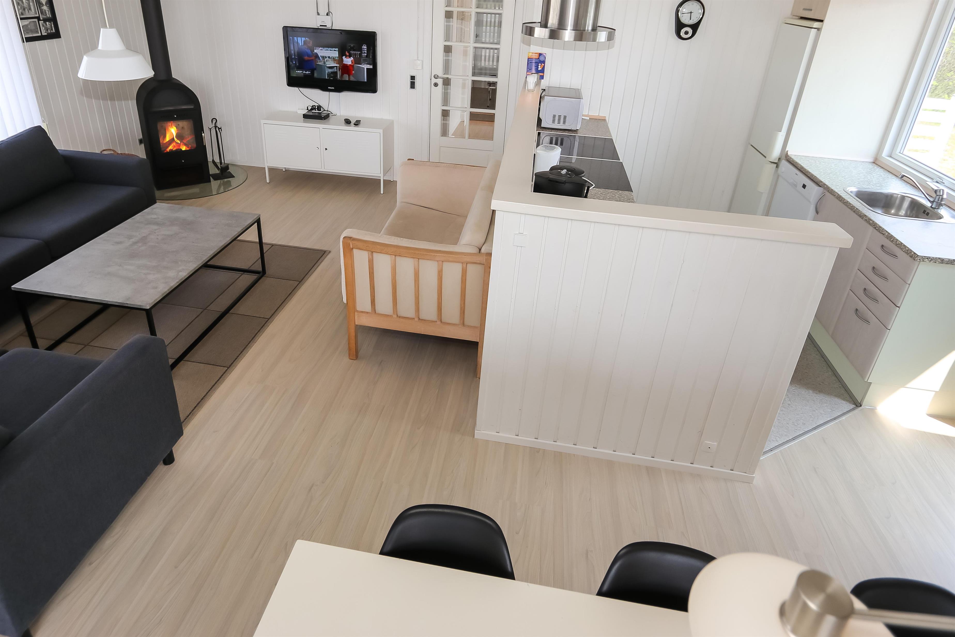 Køkken og stue er i samme rum med udgang til den store delvist overdækkede terrasse og det store vinduesparti ud mod haven og den rolige vej. Stuen har en hyggelig sofagruppe med stuebord tæt på fladskærmen og brændeovnen. Her er både tyske og danske tv-kanaler. Umiddelbart ved siden af er køkkenet som indeholder glaskeramisk komfur, emhætte, køle-/fryseskab med separat fryser på 30 liter og en opvaskemaskine, så man får noget mere tid med familien fremfor at vaske op i hånden.