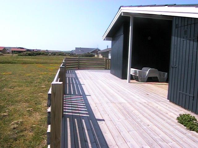 Huset har en dejlig stor terrasse som er delvis overdækket i den sydlige retning. Her er grill, havemøbler og solvogne, så man virkelig kan hygge sammen.