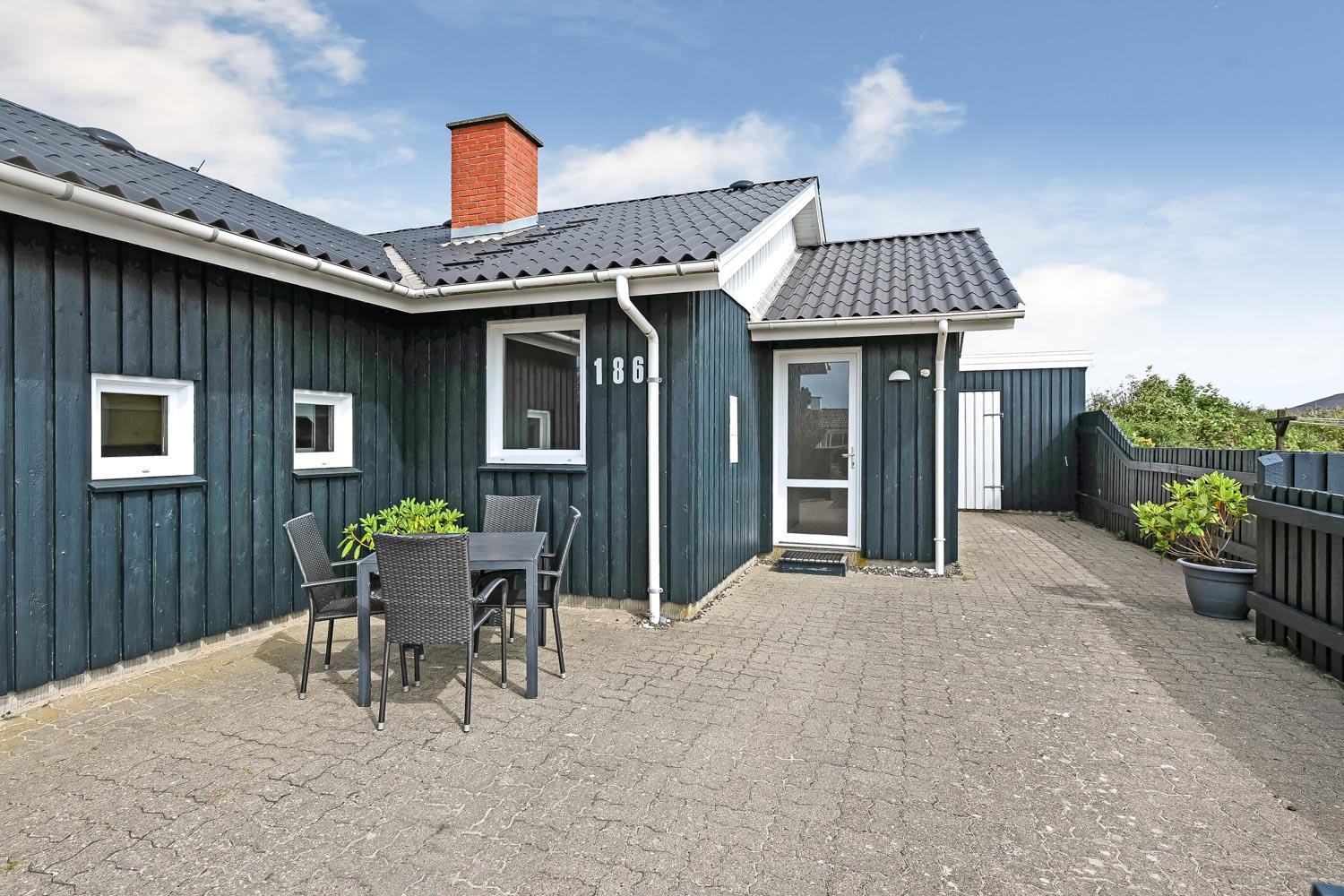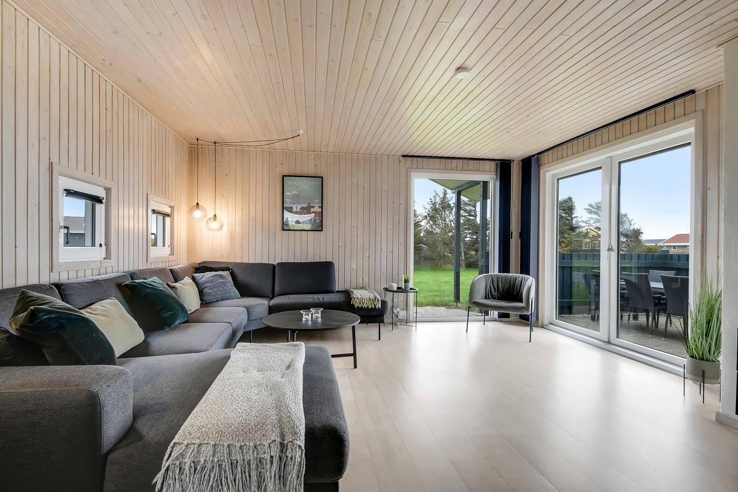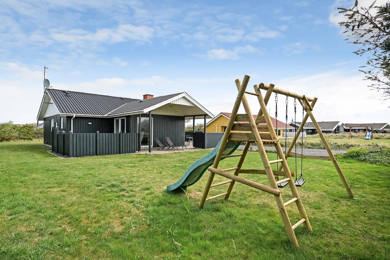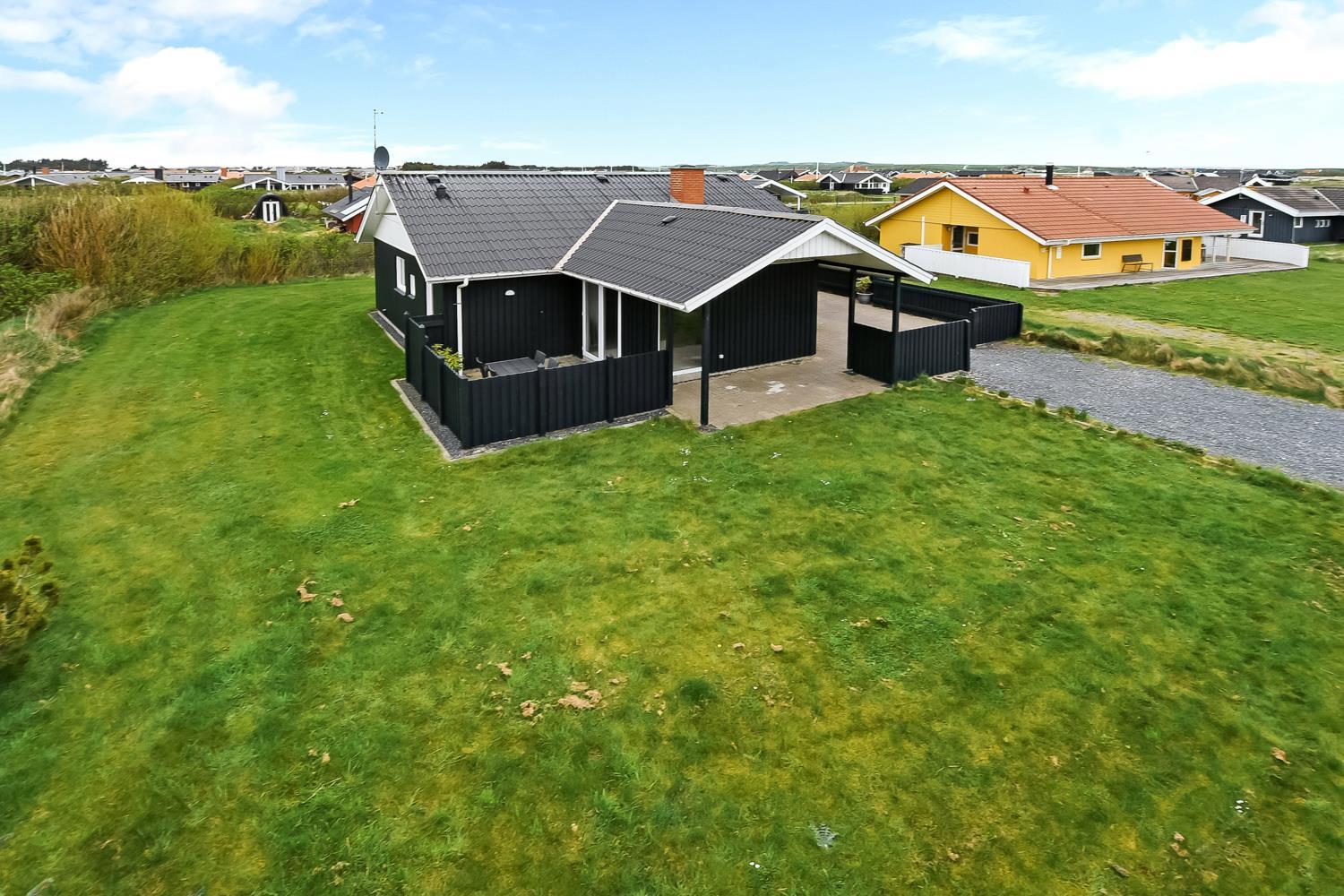 Den velholdte grund er ca. 900 m2 stor, så der er masser af mulighed for sjov og narrestreger. Der er flere dejlige terrasse. Fra Stuen er der udgang til en stor delvis overdækket terrasse med havemøbler, liggestole og grill. Fra køkkenet er der også udgang til en mindre, godt beskyttet terrasse med havemøbler. Der kan altid findes en plads i solen. Lille skur som er perfekt til opbevaring af diverse. Et utrolig dejligt hus, hvor der er tænkt på det meste og med masser af muligheder. 10 – 15 min fra huset ligger Vesterhavet, der altid invitere til en frisk gå- eller løbetur. Nyd også at områdets købmand ligger i gåafstand fra huset og som i sæsonen byder på frisk morgenbrød og her kan de daglige indkøb også klares. Også området madsted ligger tæt ved huset. Inden for 25-30 minutter kan flere aktiviteter og shoppingmuligheder nås. Så hvad enten I er til aktiv ferie eller total afslapning, danner dette rummelige feriehus en dejlig ramme både hvad angår hus, beliggenhed og omgivelser.