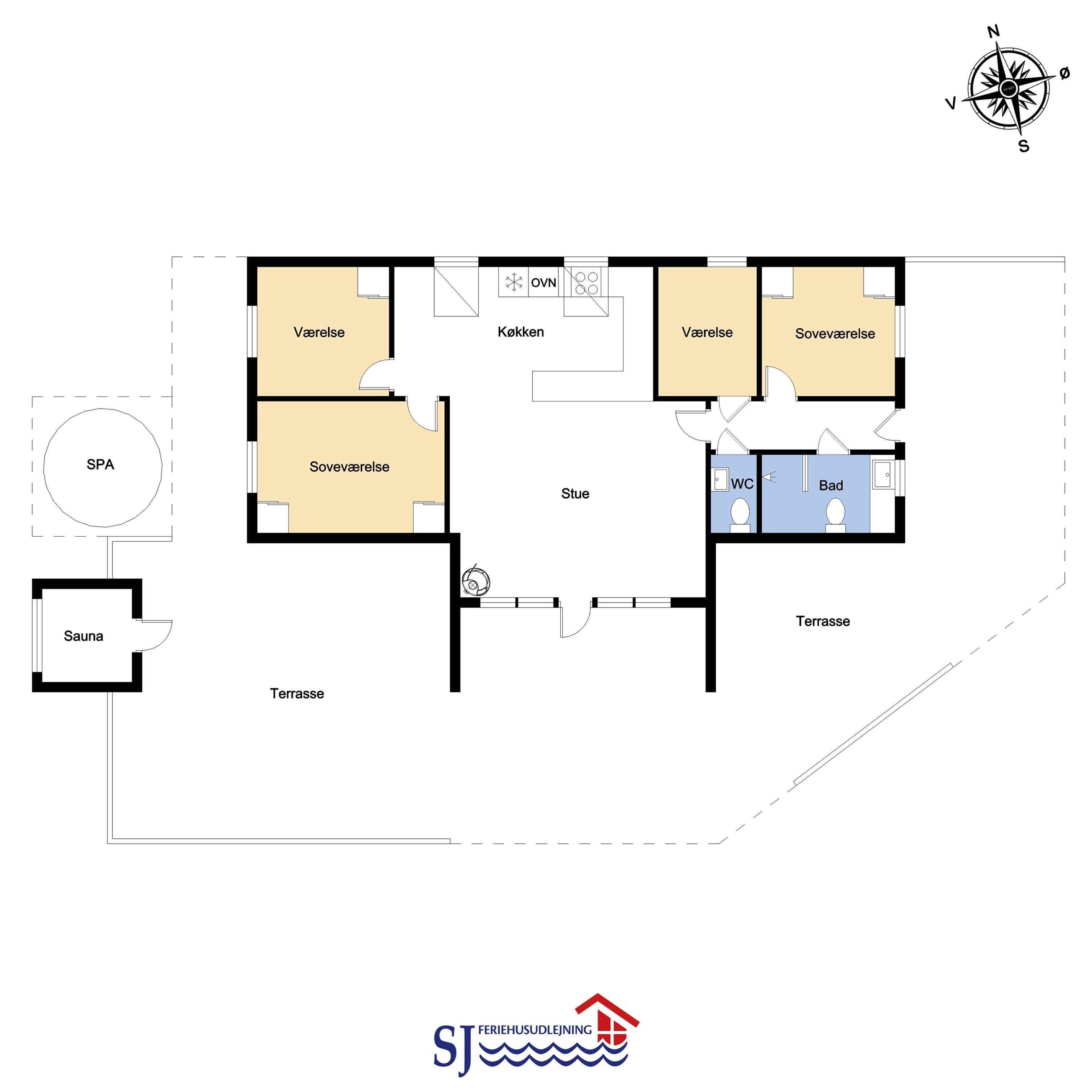 Der er udgang til det store og unikke terrasse anlæg, hvor der hvor der også er en udendørs spa og udendørs sauna. 2 badeværelser, det ene er med bruser, toilet, håndvask og gulvvarme og det andet er med toilet, gulvvarme og håndvask. Vaskemaskine er en selvfølgelig også i huset. Huset lejes ikke ud til ungdomsgrupper. Har man el-bil eller en Plug-In hybrid, så er der opsat ladeboks. Ikke ryger hus. Husdyr ikke tilladt.