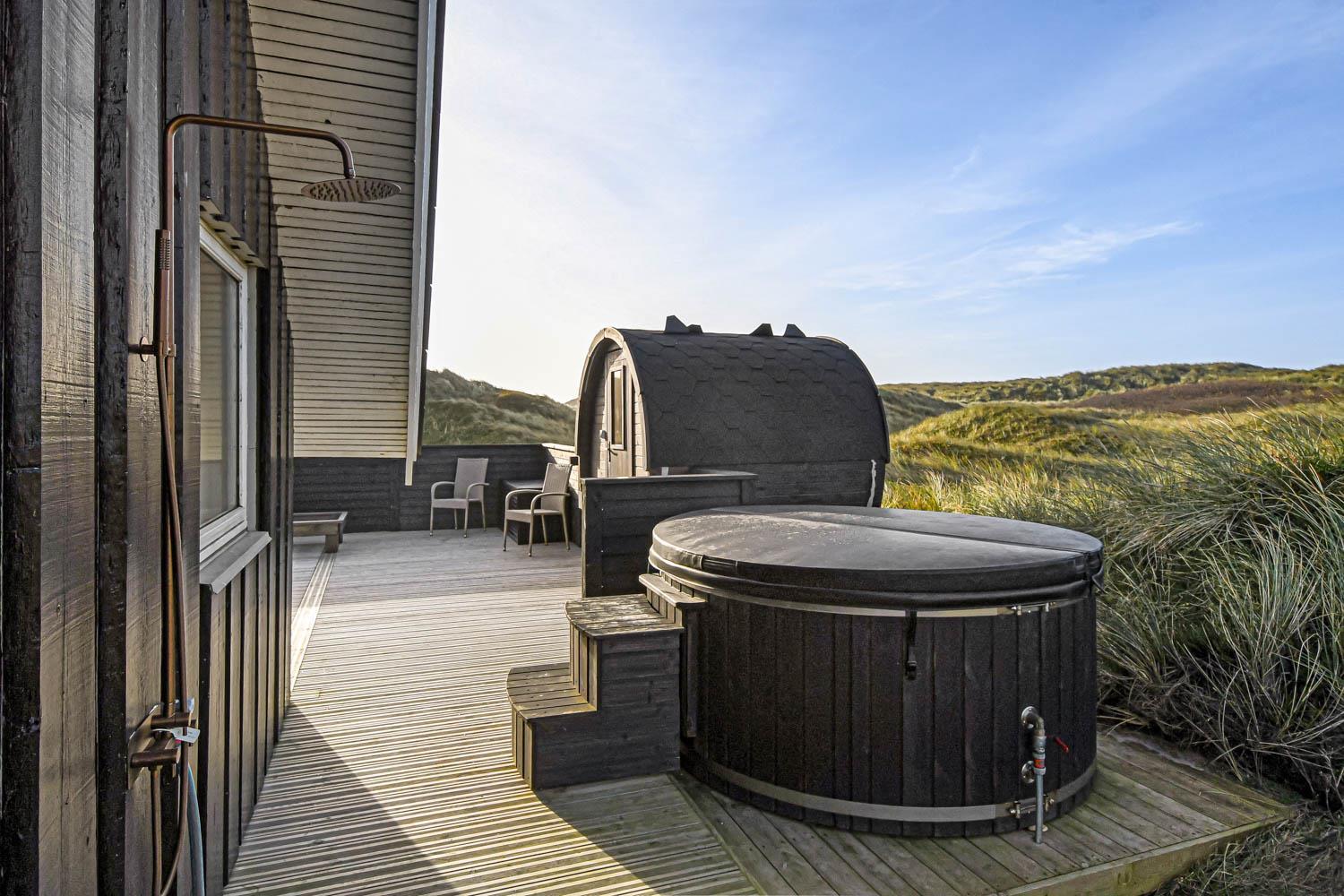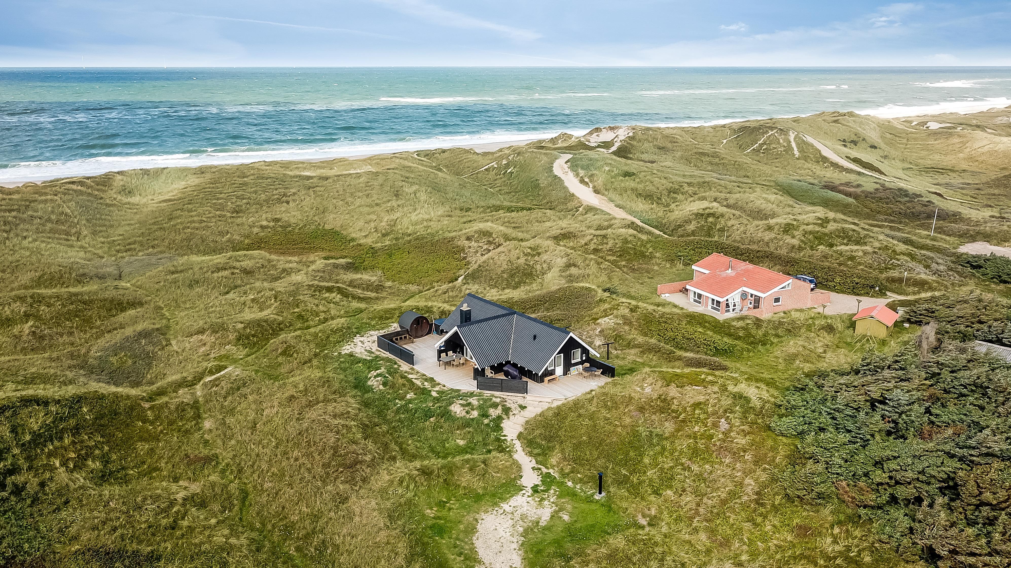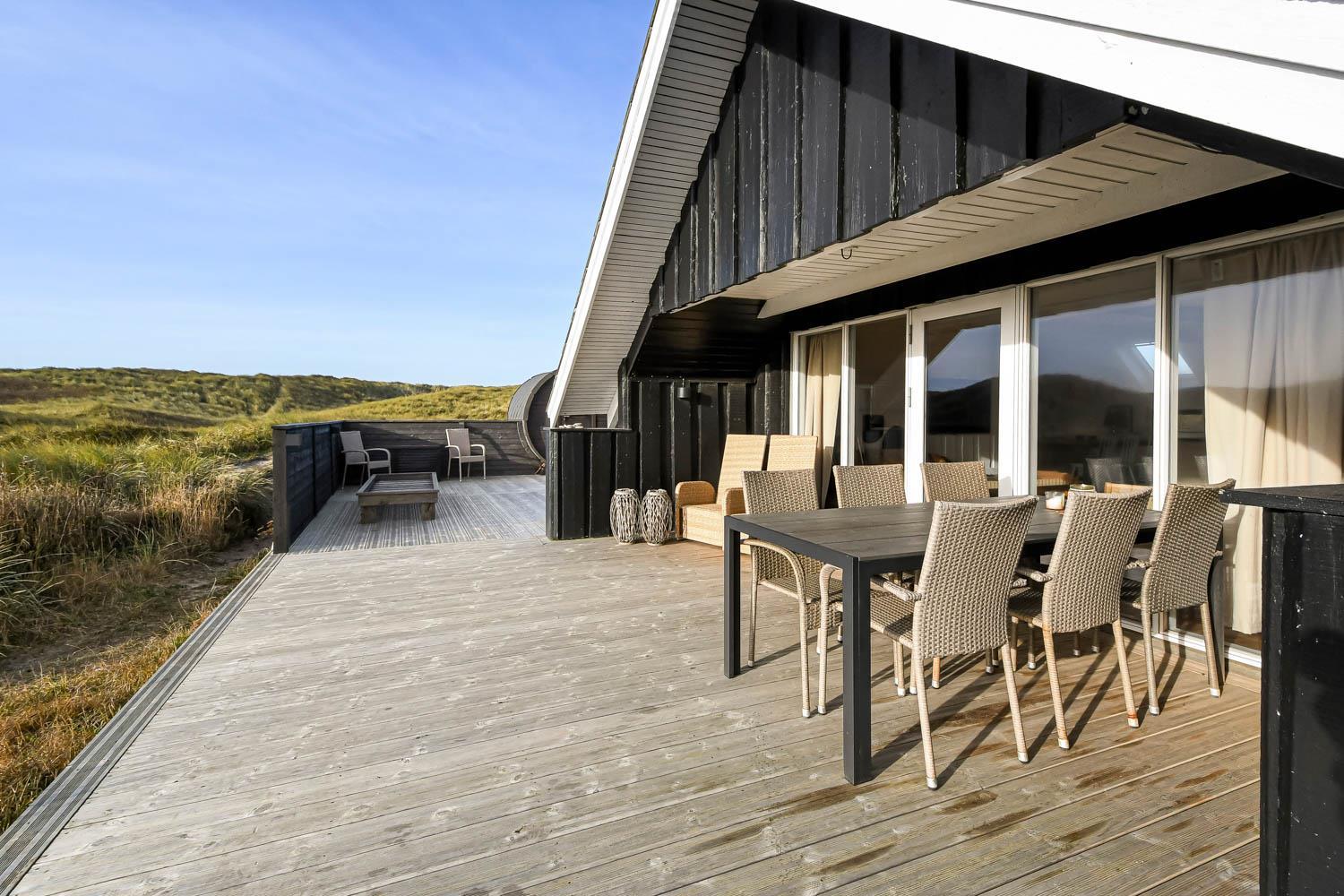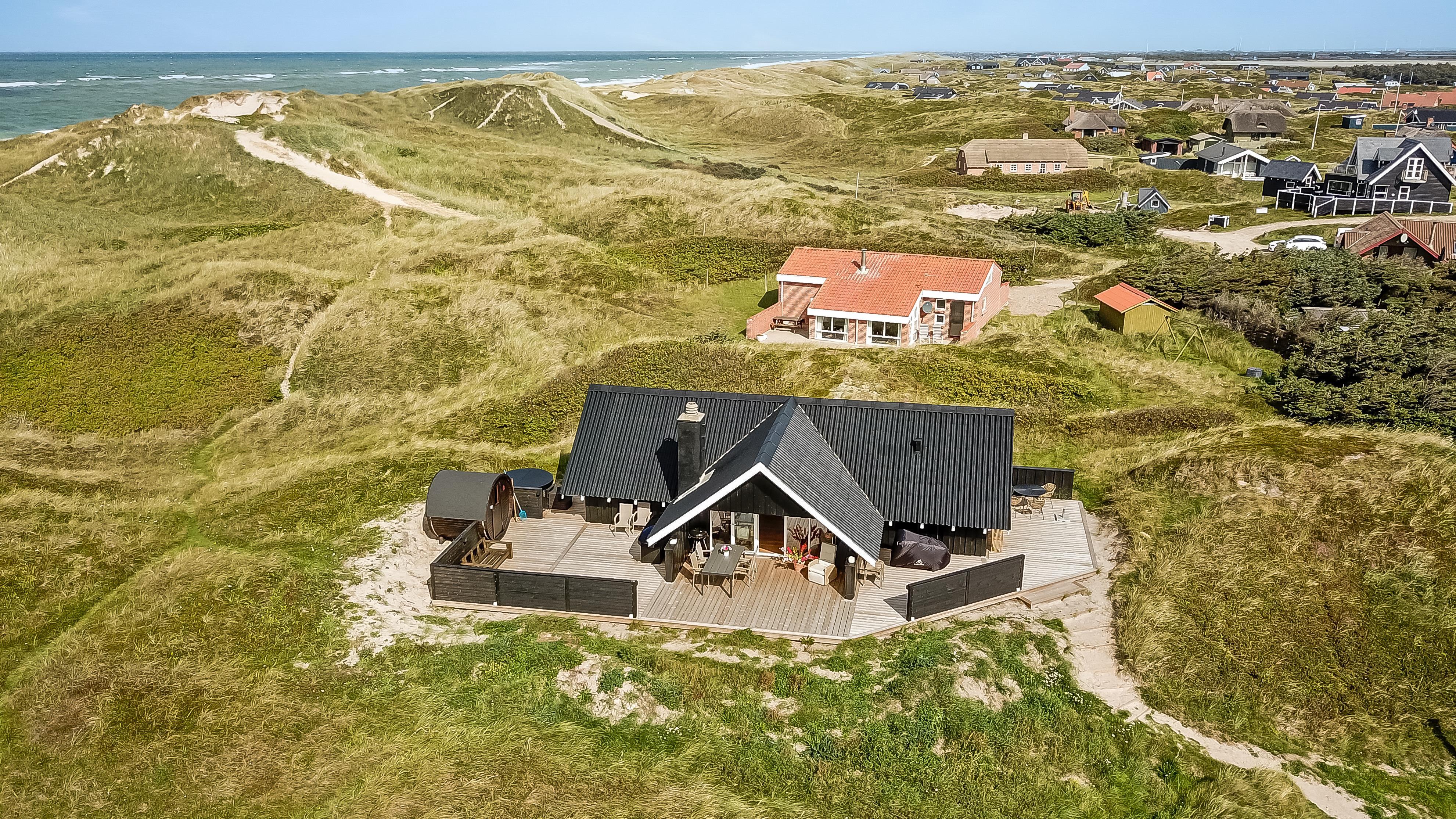 Fuldstændig unikt og fantastisk beliggende, nyrenoveret luksushus. Huset ligger som det sidste hus helt op til klitterne ved Vesterhavet med fantastisk udsigt til de høje klitter ved Vesterhavet. Moderne feriehus i træ, som er noget ganske særligt. Der er en stor terrasse omkring huset som bl.a. er med en udendørs spa og en udendørs sauna og udendørs bruser, gratis fibernet. Et hus med plads til max. 7 personer som kan nyde denne luksus. En rolig stund, en plads i solen er blot noget af det huset tilbyder.