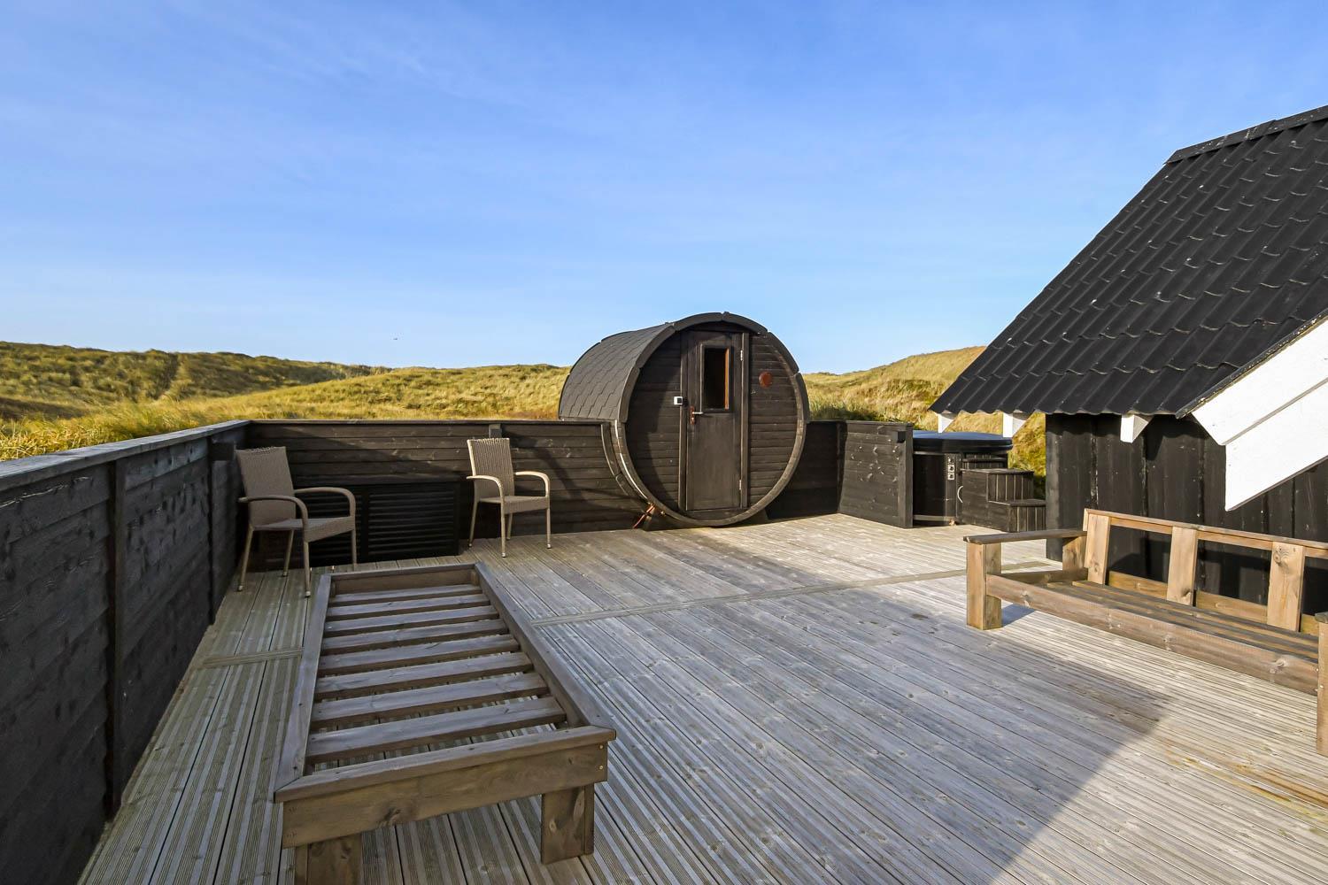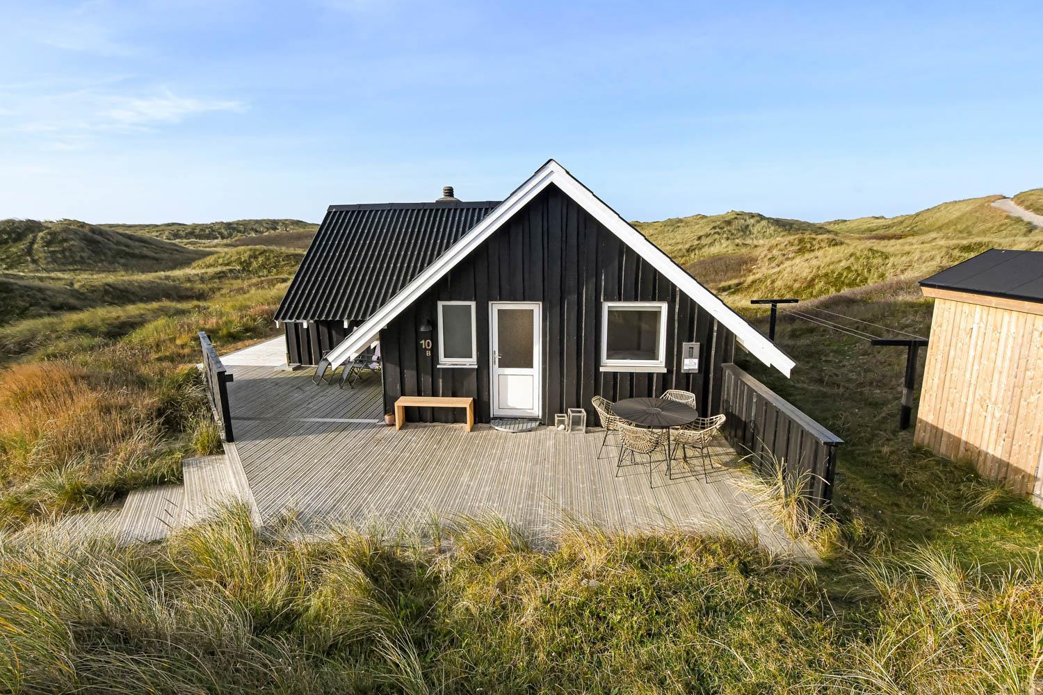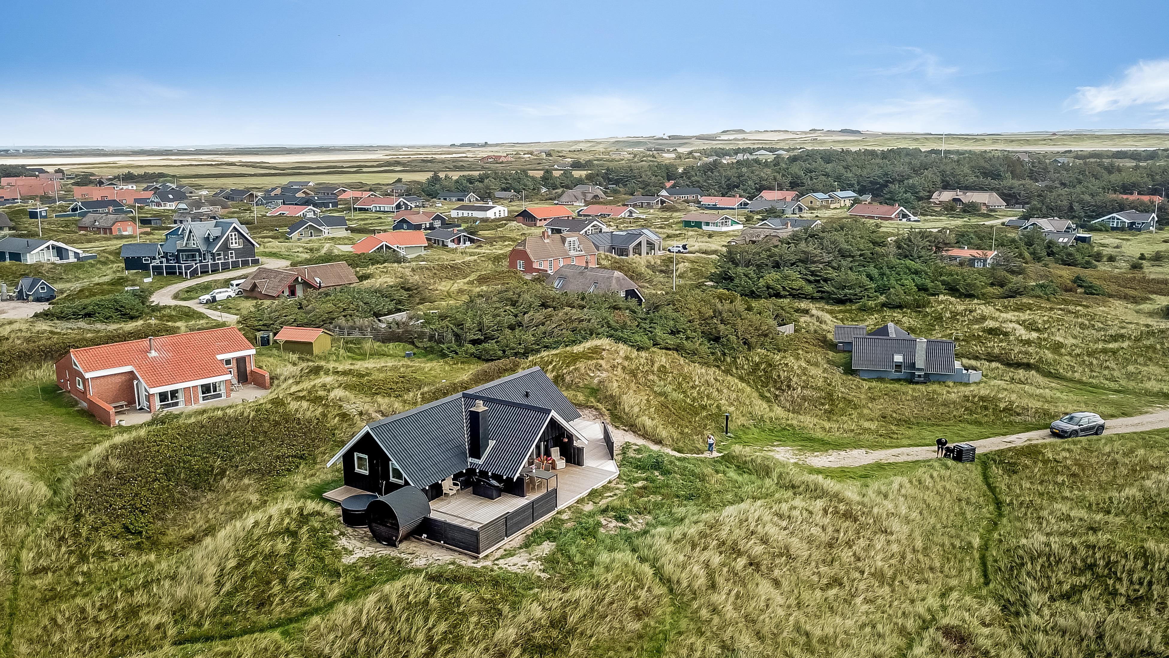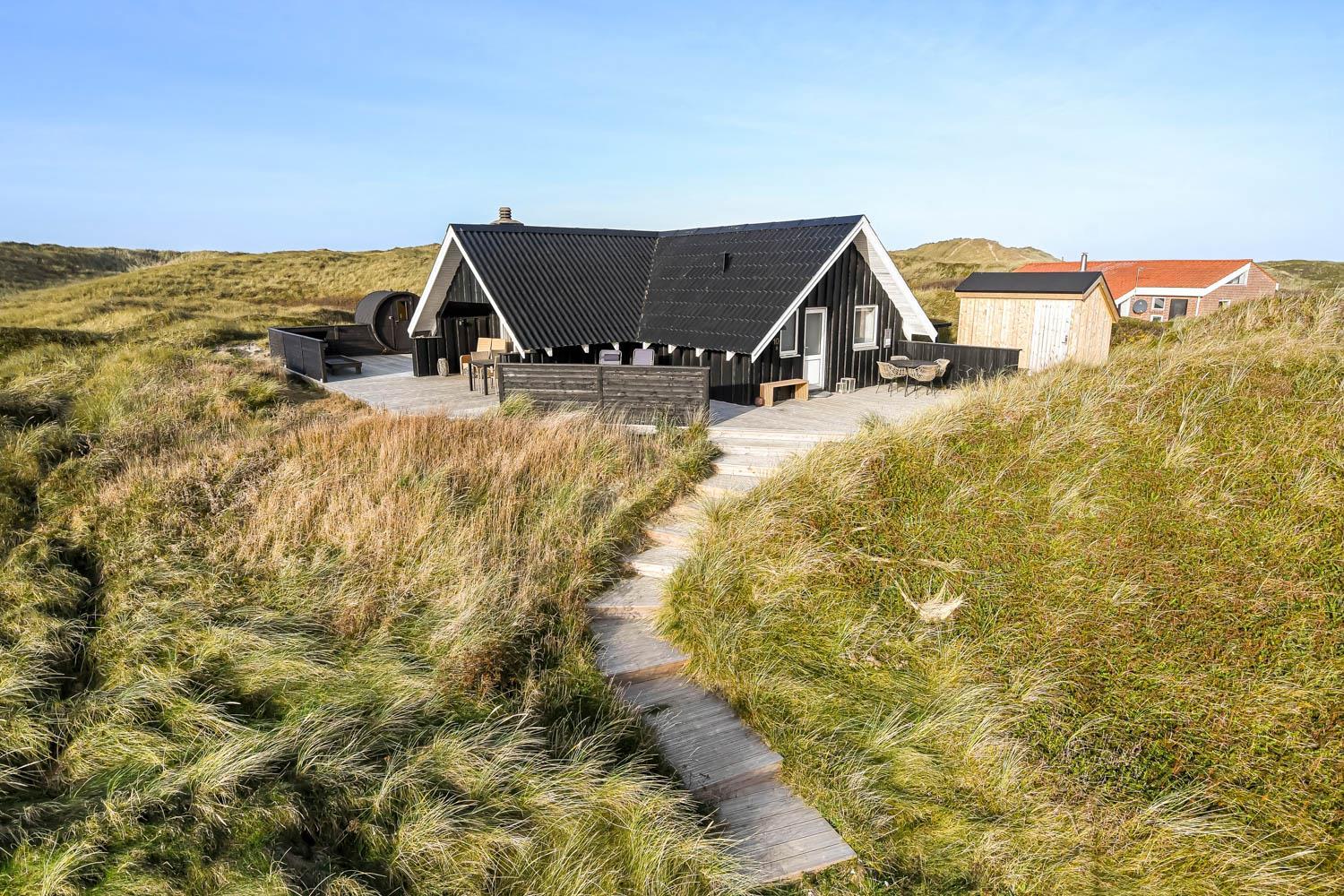 Fuldstændig unikt og fantastisk beliggende, nyrenoveret luksushus. Huset ligger som det sidste hus helt op til klitterne ved Vesterhavet med fantastisk udsigt til de høje klitter ved Vesterhavet. Moderne feriehus i træ, som er noget ganske særligt. Der er en stor terrasse omkring huset som bl.a. er med en udendørs spa og en udendørs sauna og udendørs bruser, gratis fibernet. Et hus med plads til max. 7 personer som kan nyde denne luksus. En rolig stund, en plads i solen er blot noget af det huset tilbyder.