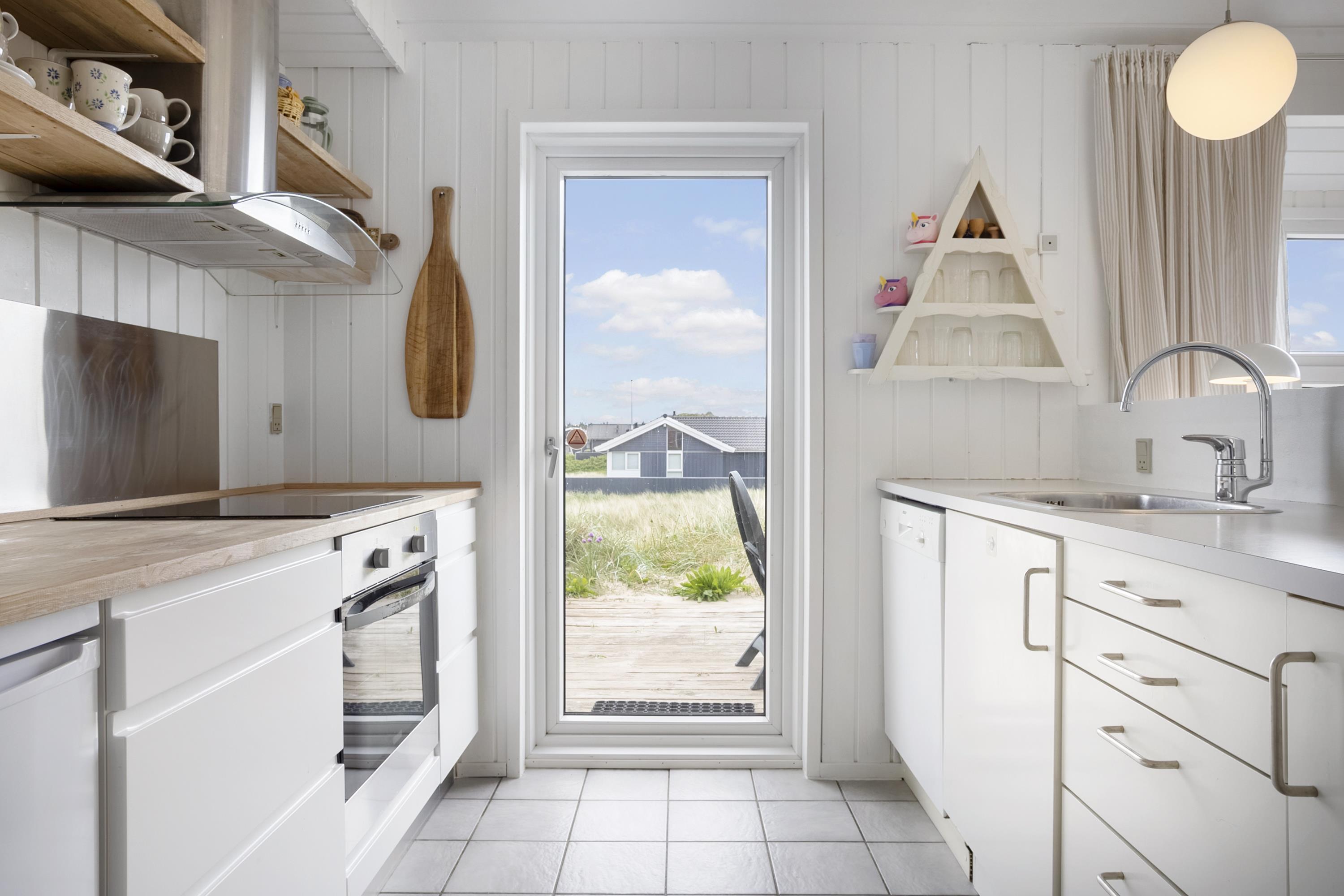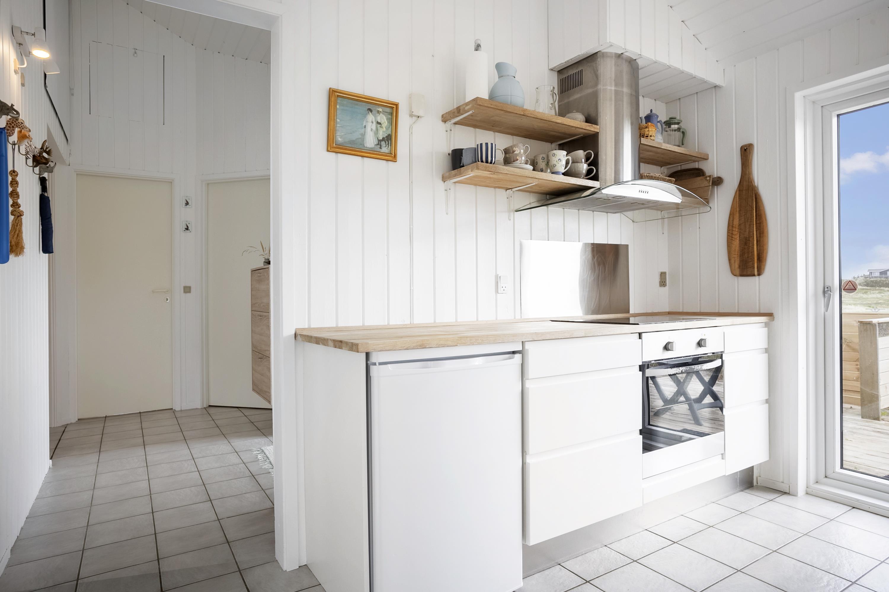Køkkenet ligger som et naturligt samlingspunkt. Det er moderne, funktionelt og udstyret med alt, hvad I kunne ønske jer – lige fra induktionskogeplade til indbygningsovn, mikroovn, køleskab med 73 l fryser og endda en vinkøler med plads til 18 flasker, hvor aftenens flasker står klar. Her kan I sammen tilberede feriens måltider, mens lyset strømmer ind, og snakken går på tværs af køkken og stue.