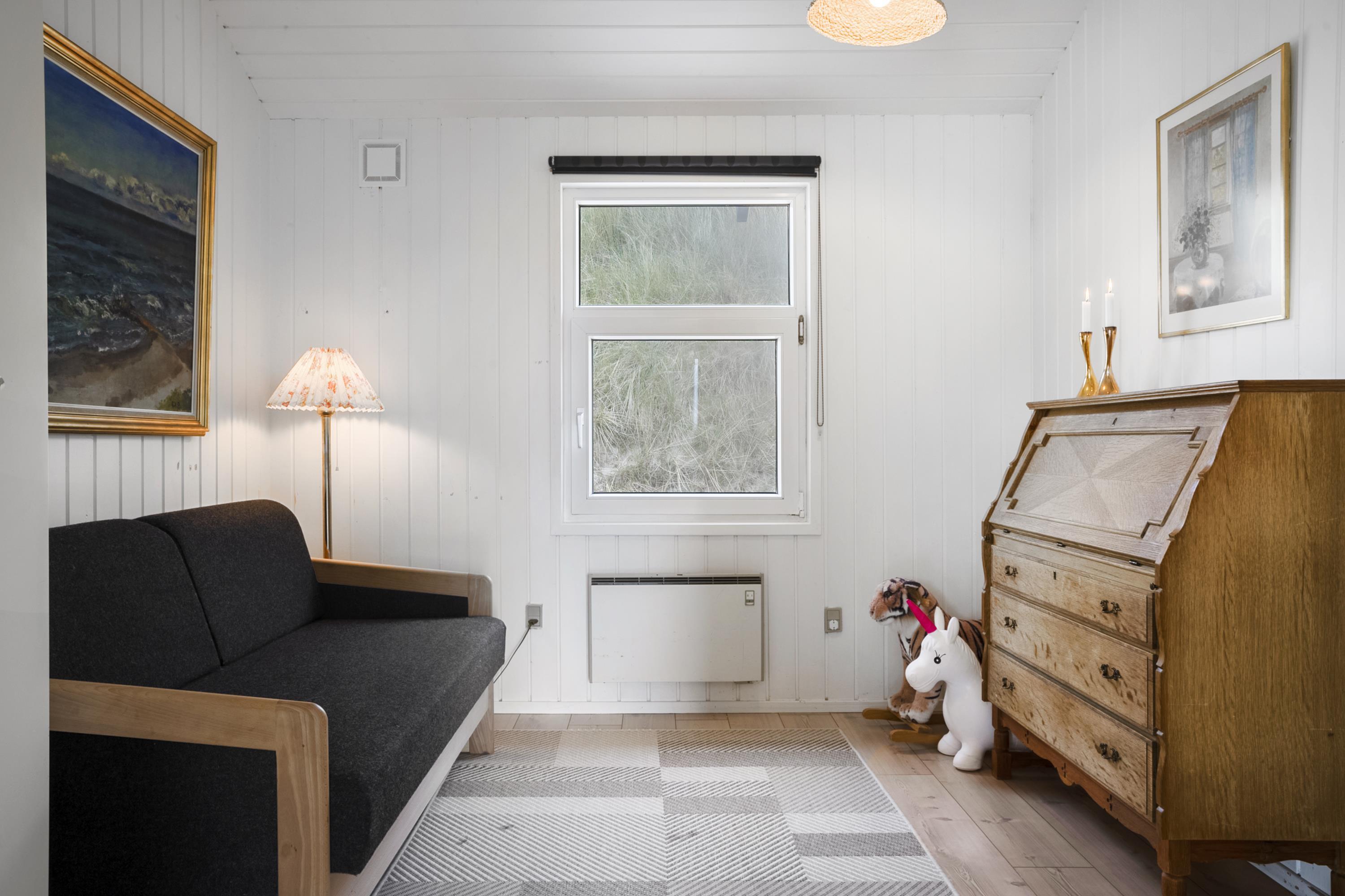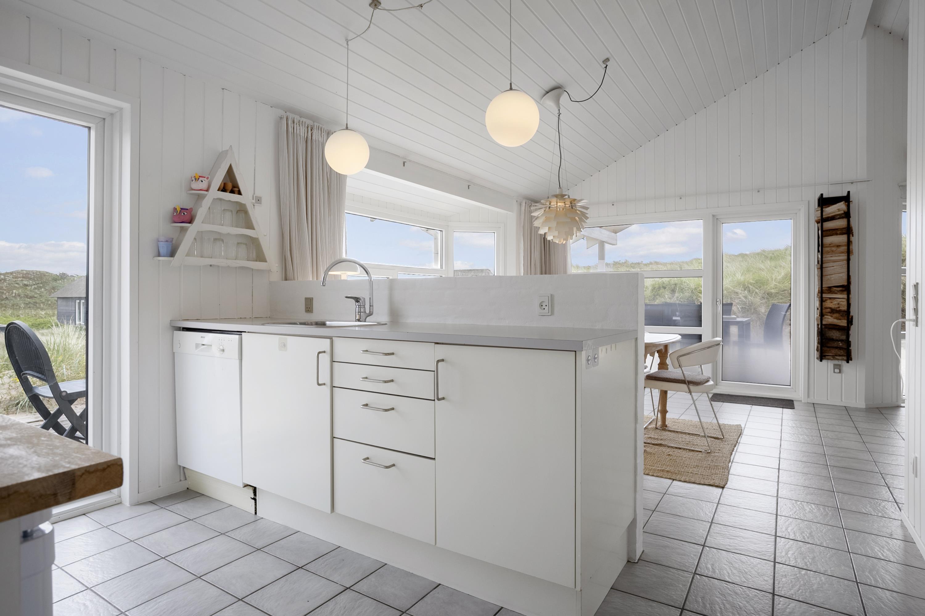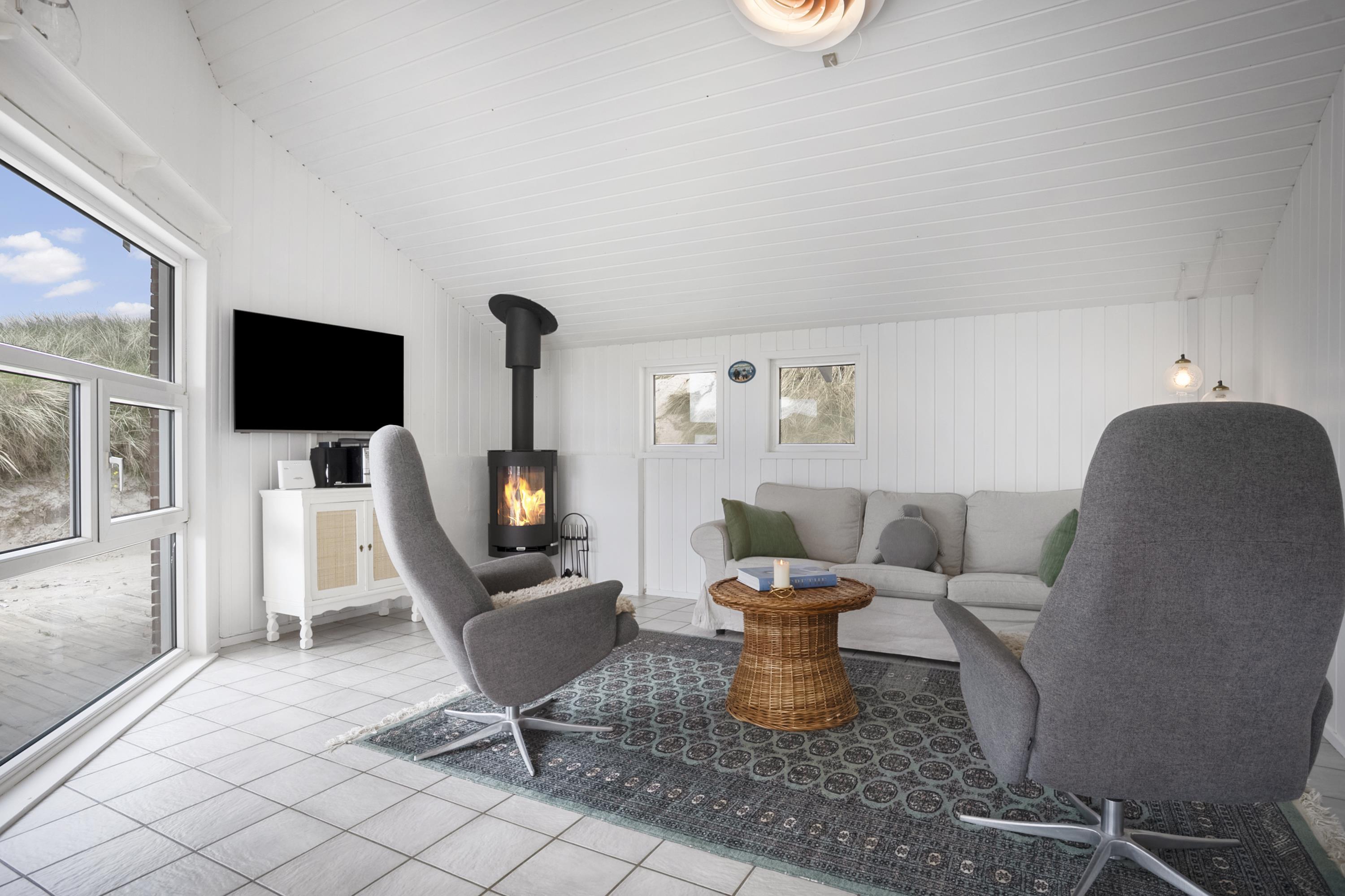 Opholdsstuen er husets hjerte. Store vinduespartier trækker naturen ind, så I næsten føler, I sidder midt i klitterne. På de varme dage åbner rummet sig mod terrassen, og på de kølige aftener kan I tænde brændeovnen, læne jer tilbage i de komfortable møbler og lade flammernes knitren skabe en helt særlig stemning. Om I vil samles om en film, spiller kort ved spisebordet eller blot sidde i stilhed og lytte til havets fjerne brusen – stuen indbyder til nærvær og hygge.