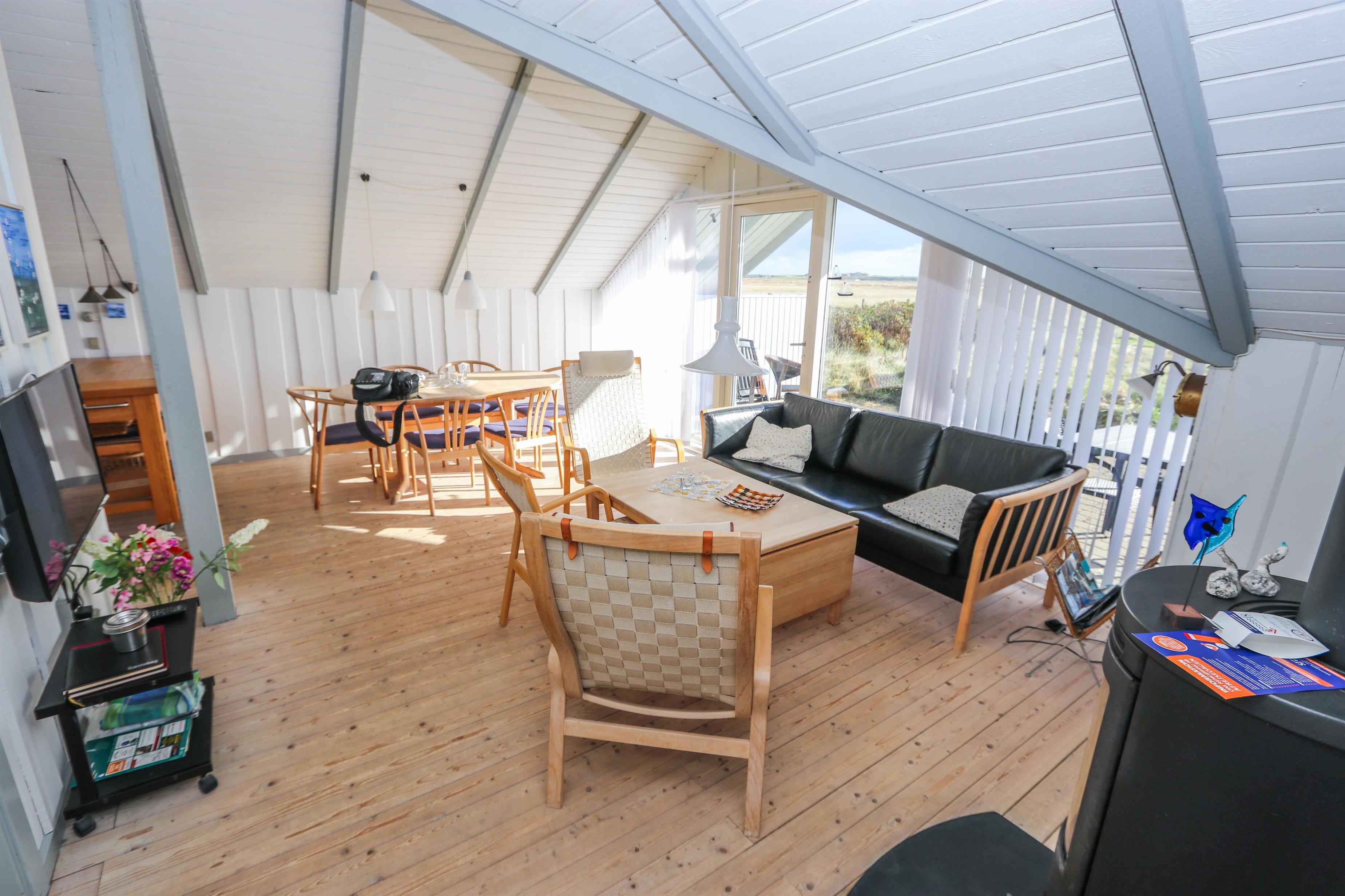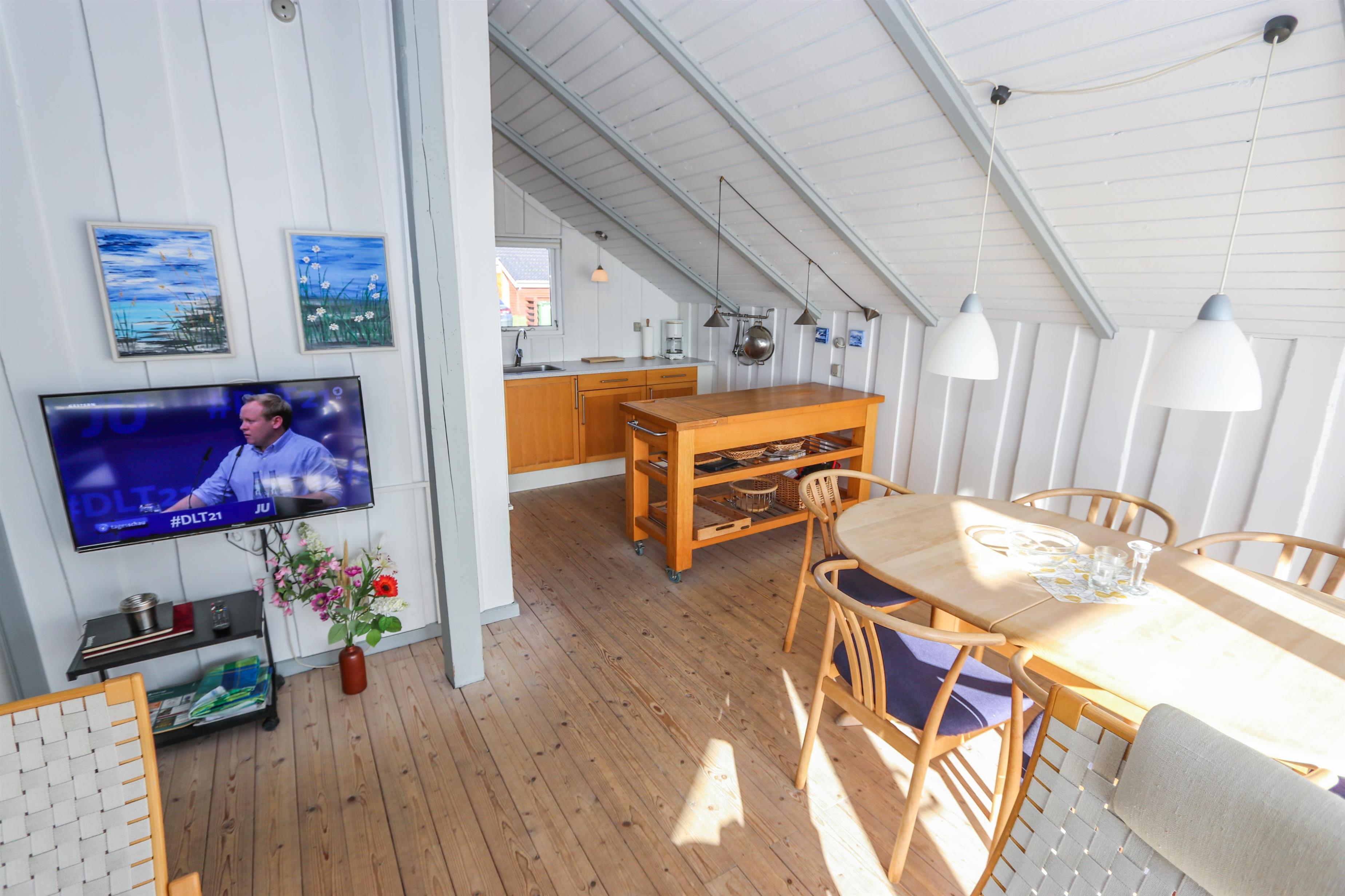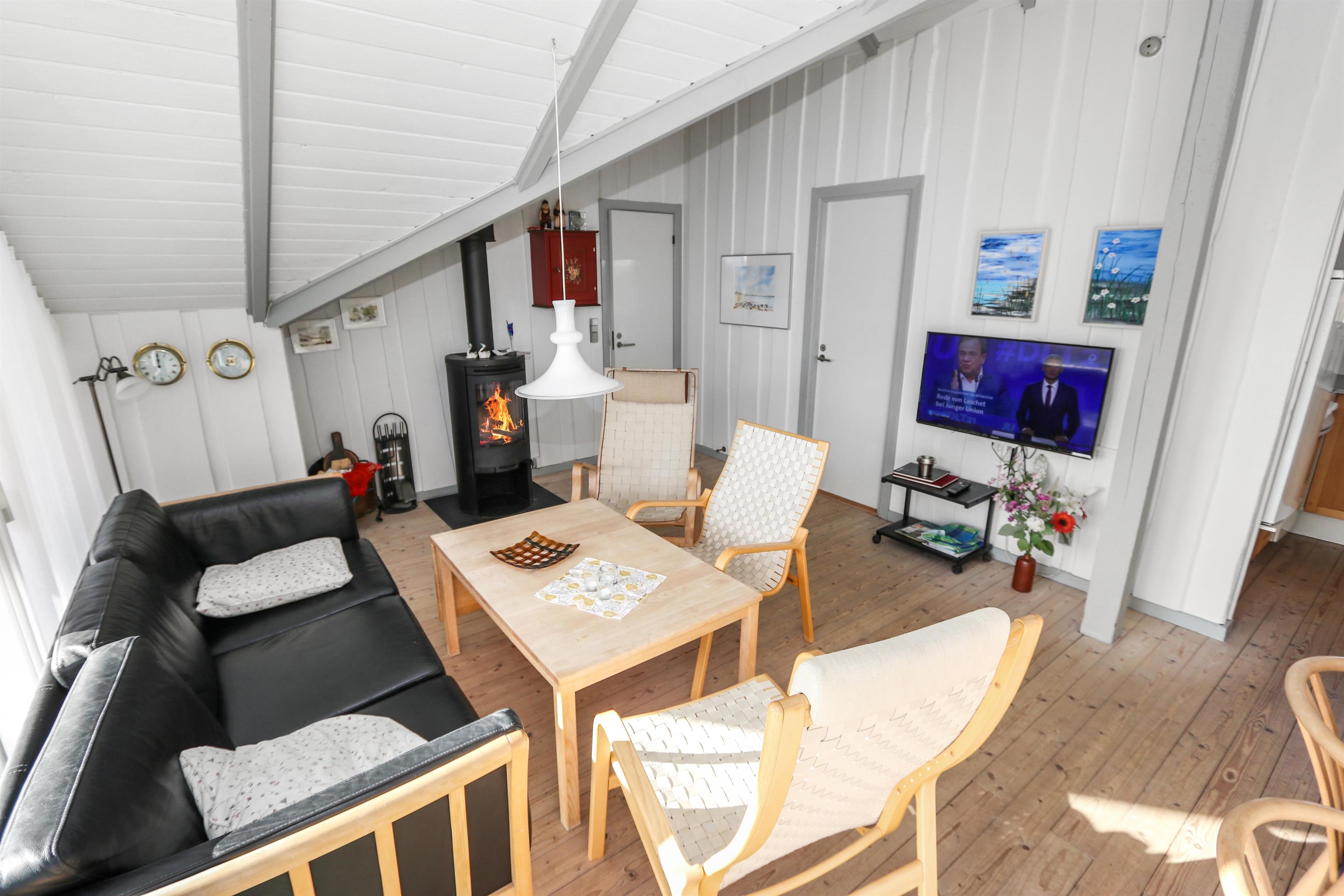 Stuen indbyder til hyggelige stunder med TV (danske og tyske kanaler) og en dejlig brændeovn, som spreder varme og feriestemning på køligere dage. Spiseafdelingen ligger i åben forbindelse med det veludstyrede køkken, som blandt andet byder på glaskeramisk komfur, mikroovn og fryser.