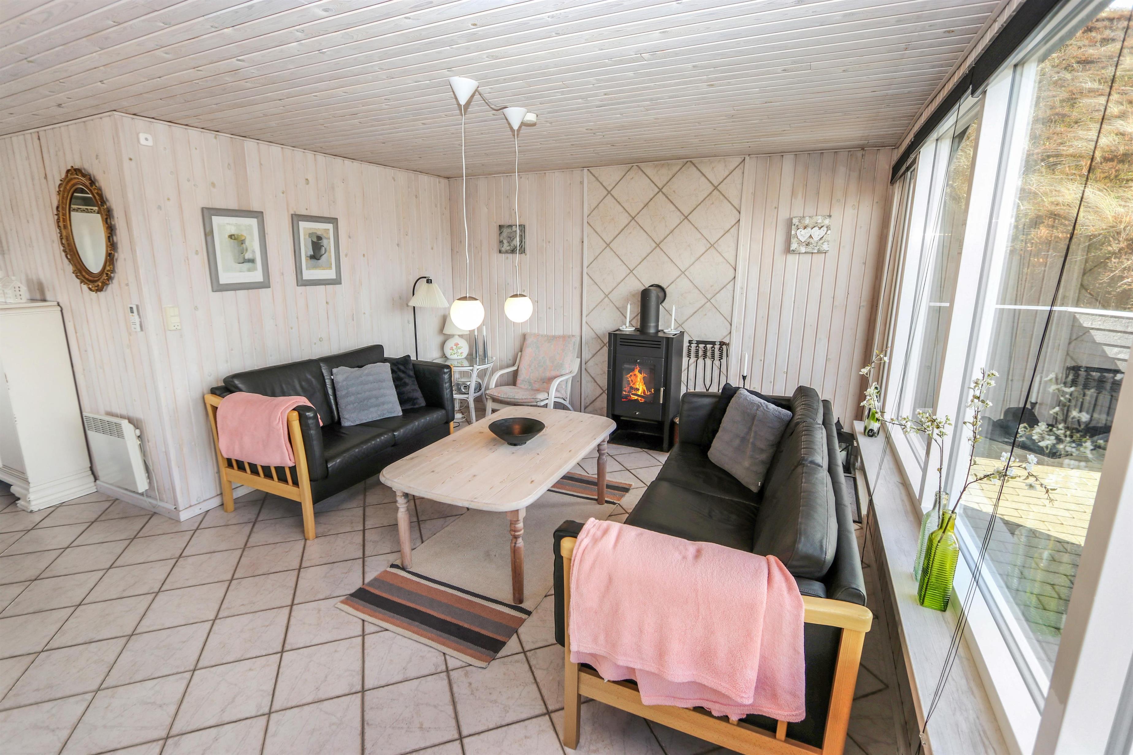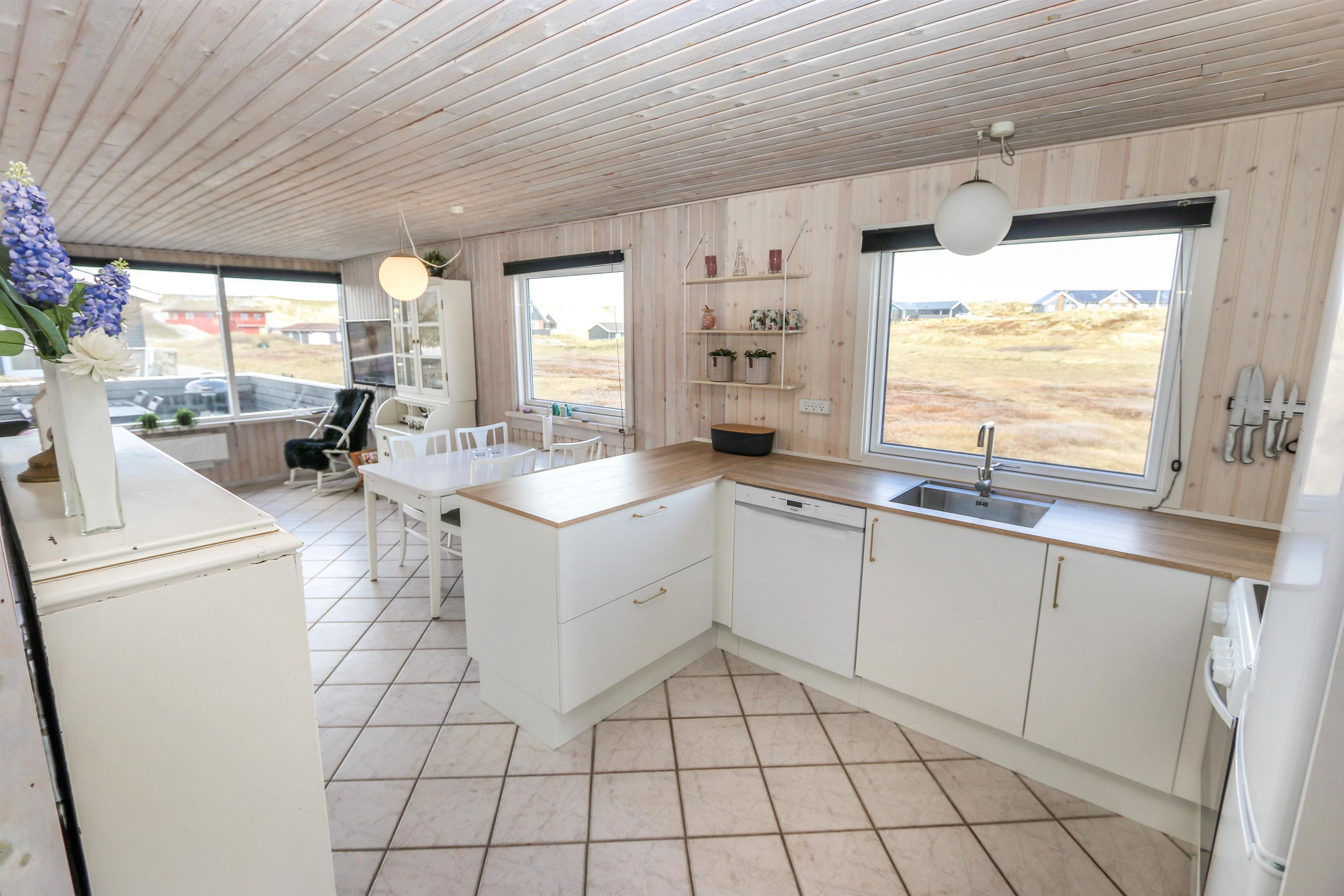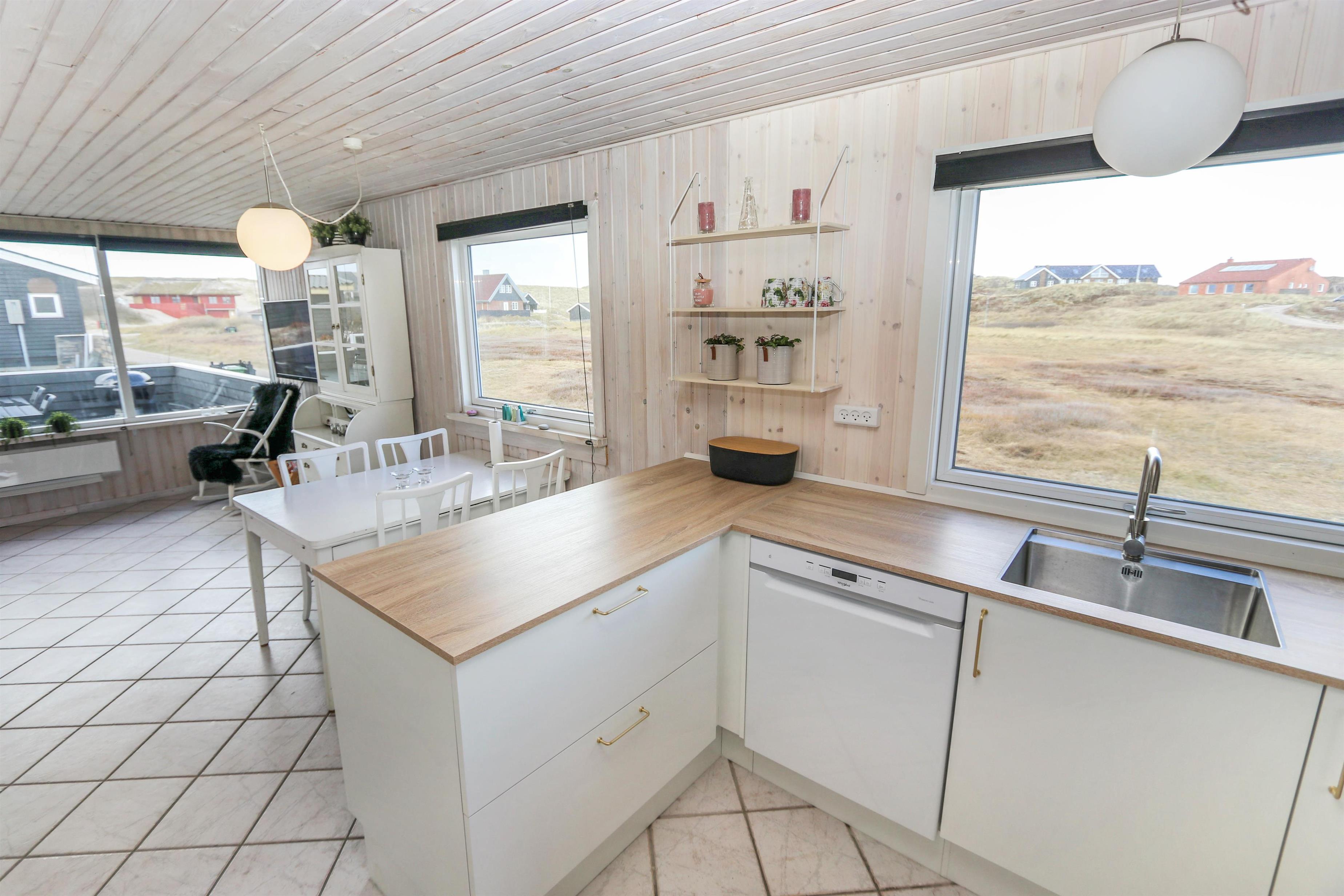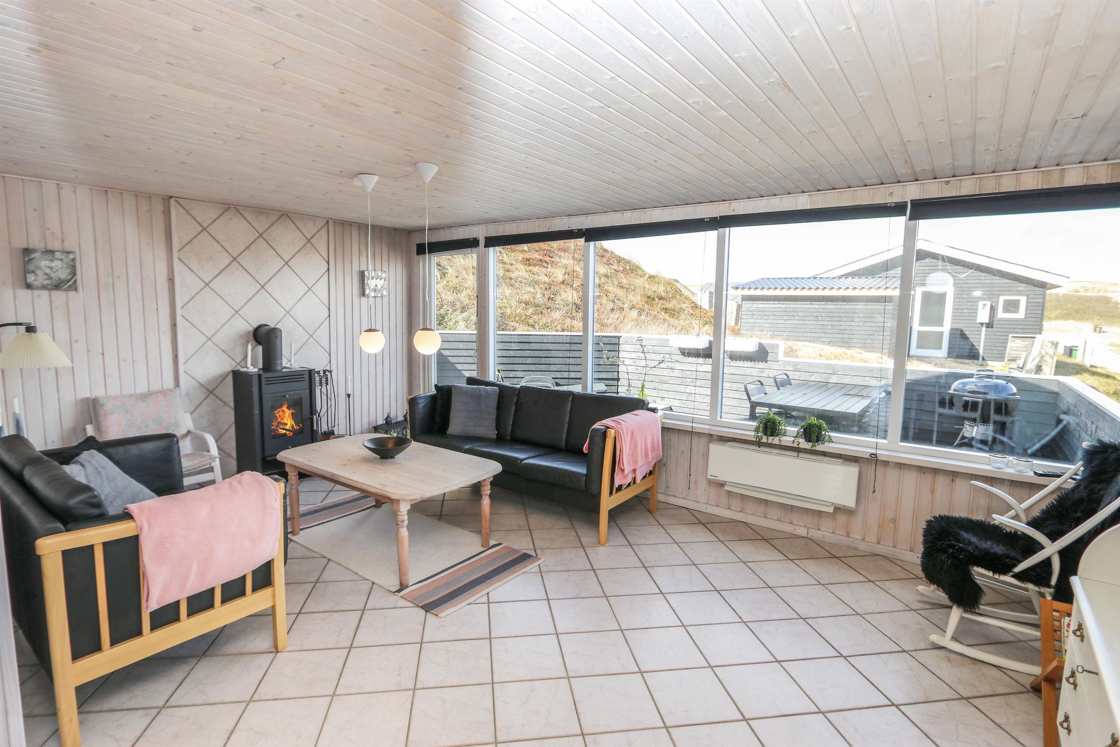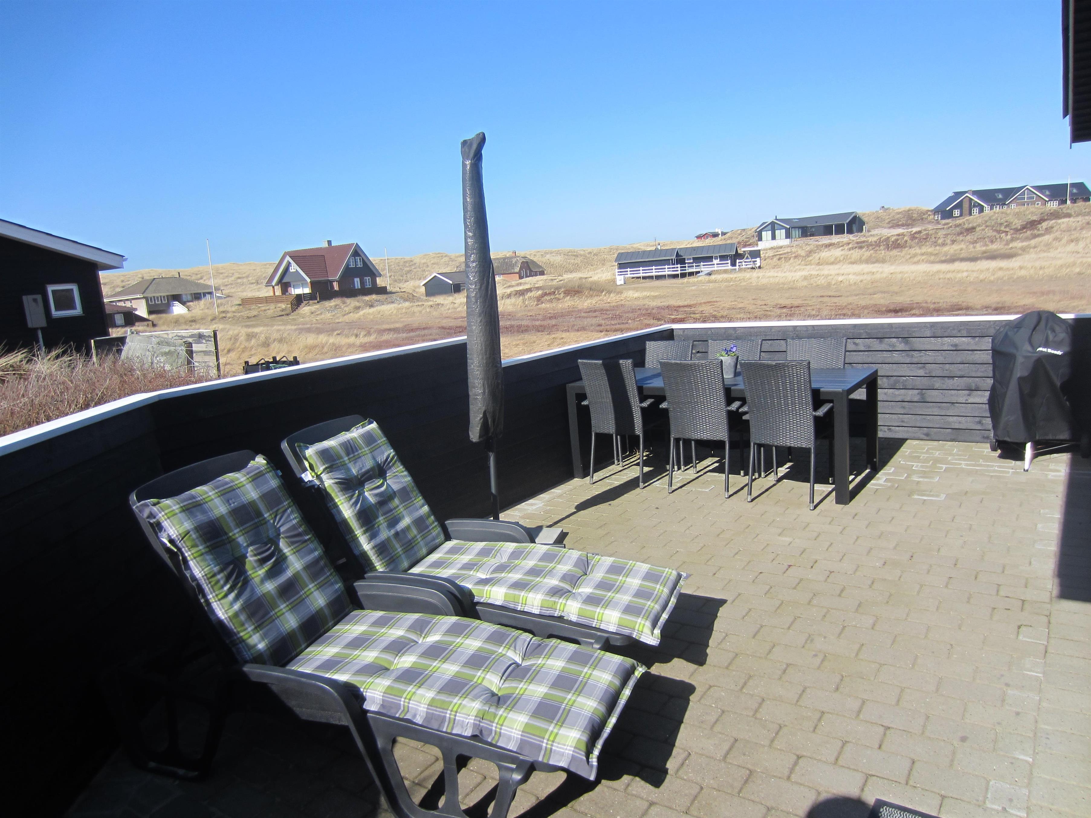 Udgang til dejlig indhegnet terrasse og udsigt til klitterne samt dejlig terrasse langs med huset hen til lille morgenterasse. Huset ligger i rolige omgivelser tæt ved Vesterhavet på en en dejlig grund som nås via trappeopgang.