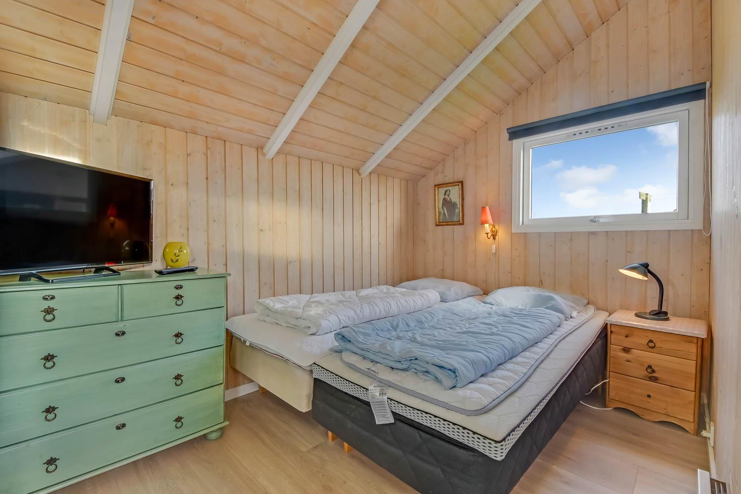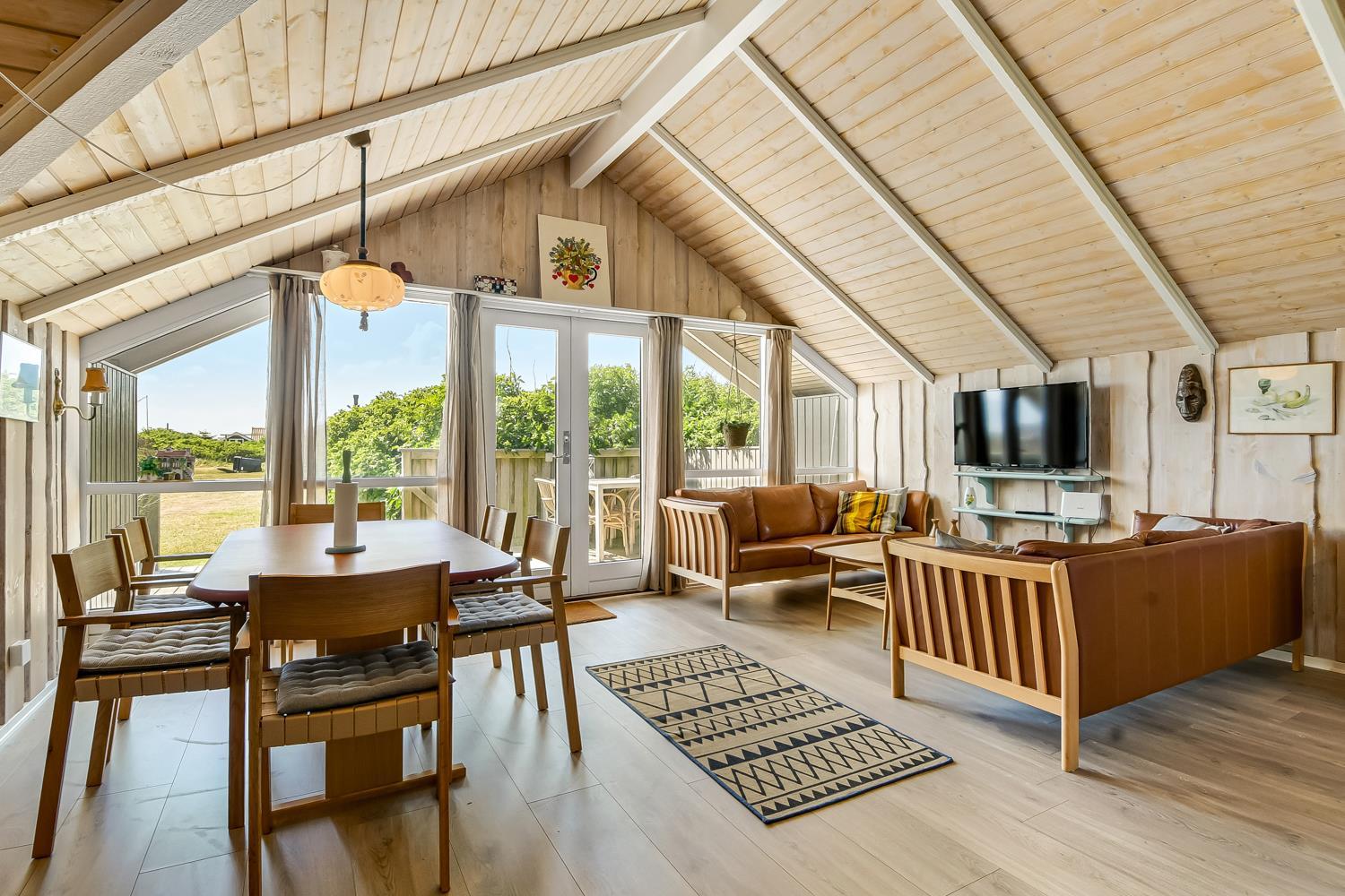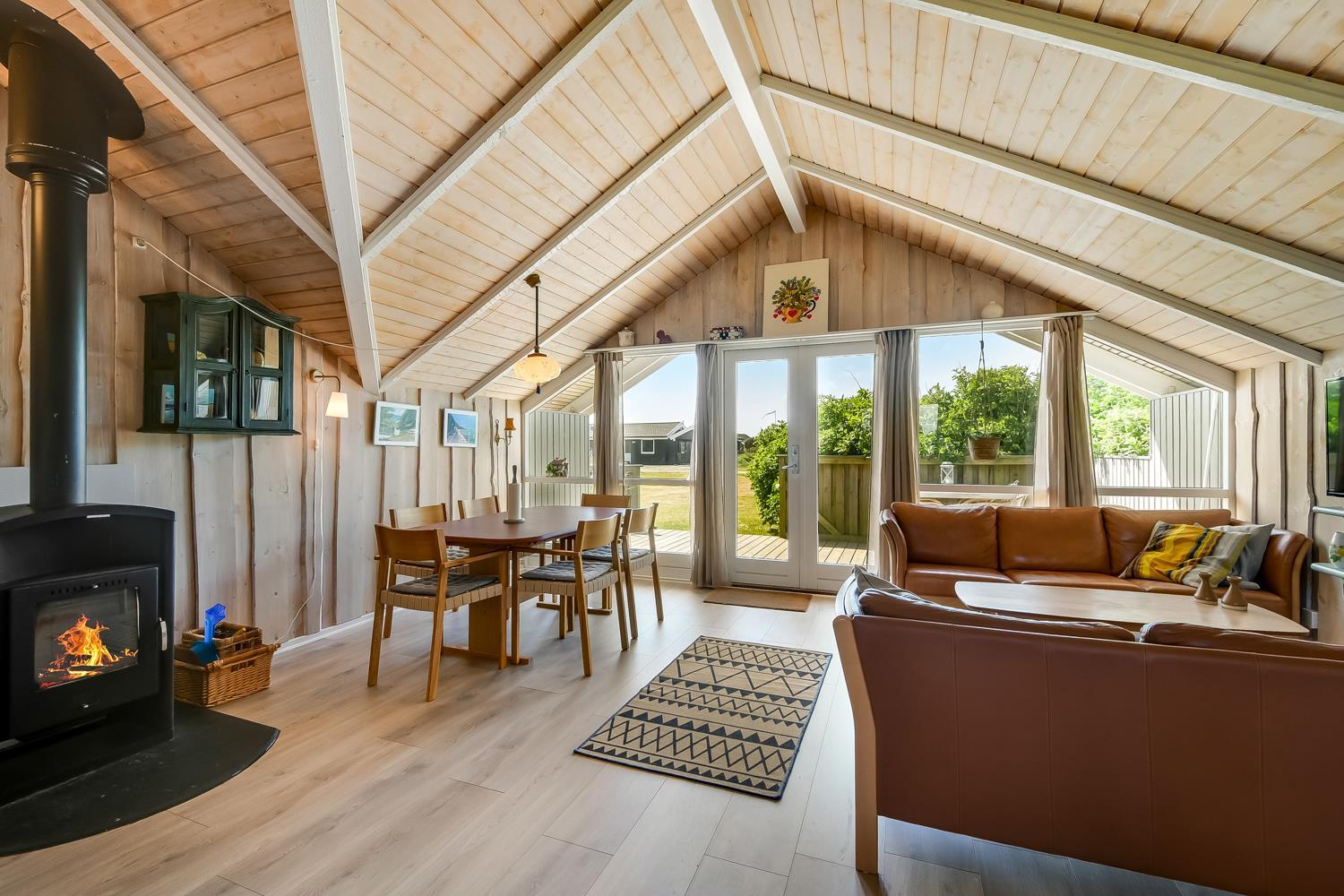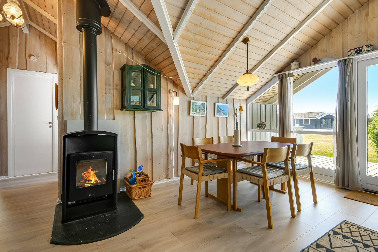Pænt og hyggeligt indrettet feriehus til 5 personer på 71 m2. Kombineret køkken og opholdsstue med laminatgulv. Stuen en med polster og lædermøbler, en dejlig brændeovn som sammen med varmepumpen sørger for en behagelig varme samt en billigere forbrugsafregning. TV med danske og tyske kanaler, DVD og CD samt radio. Køkkenet er godt udstyret og indeholder en glas keramisk komfur, emhætte, køle-/fryseskab, opvaskemaskine og linoleumsgulv. Huset har 3 soverum: 1DS + 1DS + 1 sovesofa alle soverum er med laminatgulv. Badeværelse med toilet, håndvask, bruser samt flisegulv. Der er vaskemaskine og tørretumbler. Til de mindste gæster er der en barneseng. 1 husdyr er tilladt. Rygning er ikke tilladt.