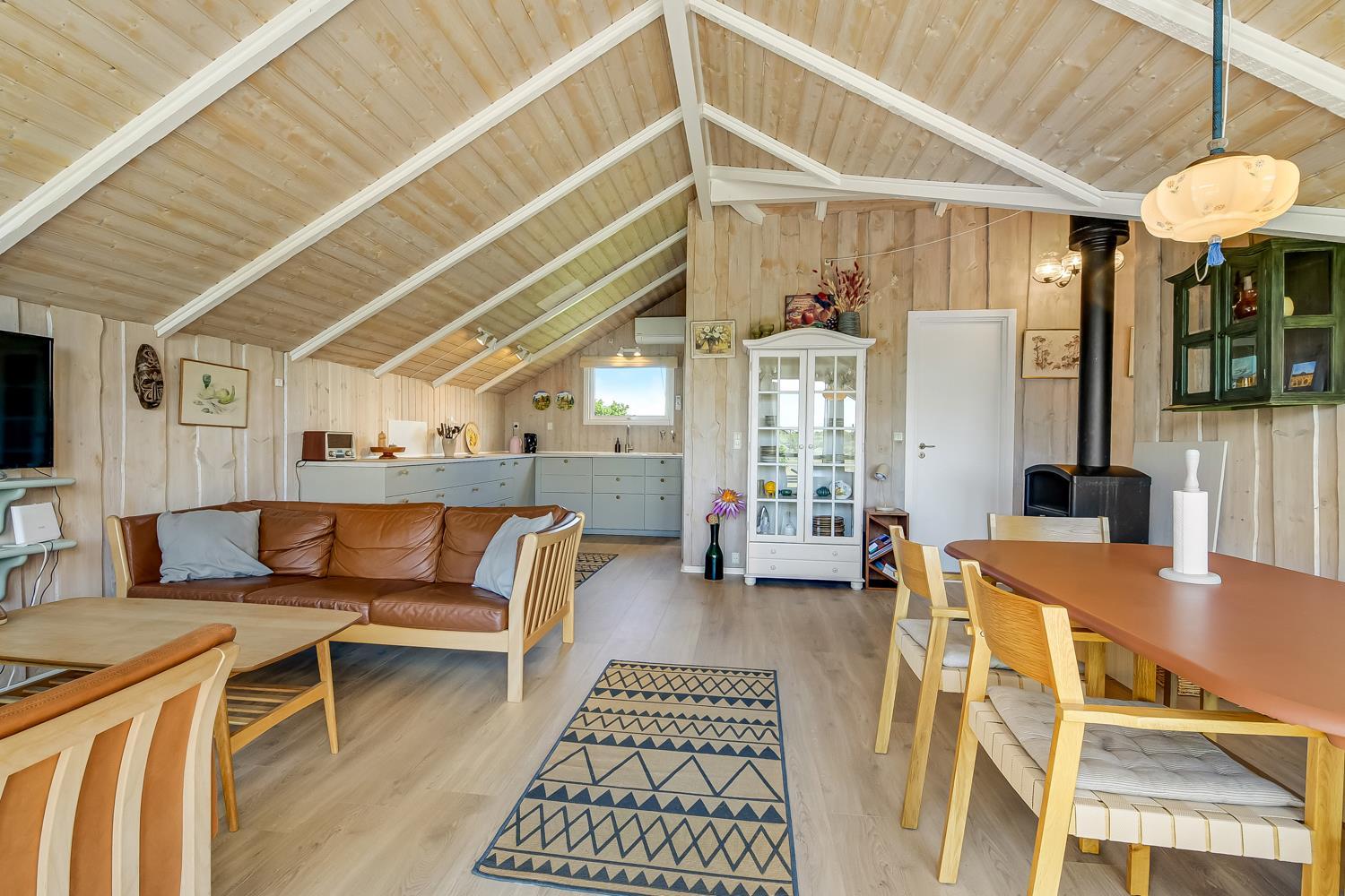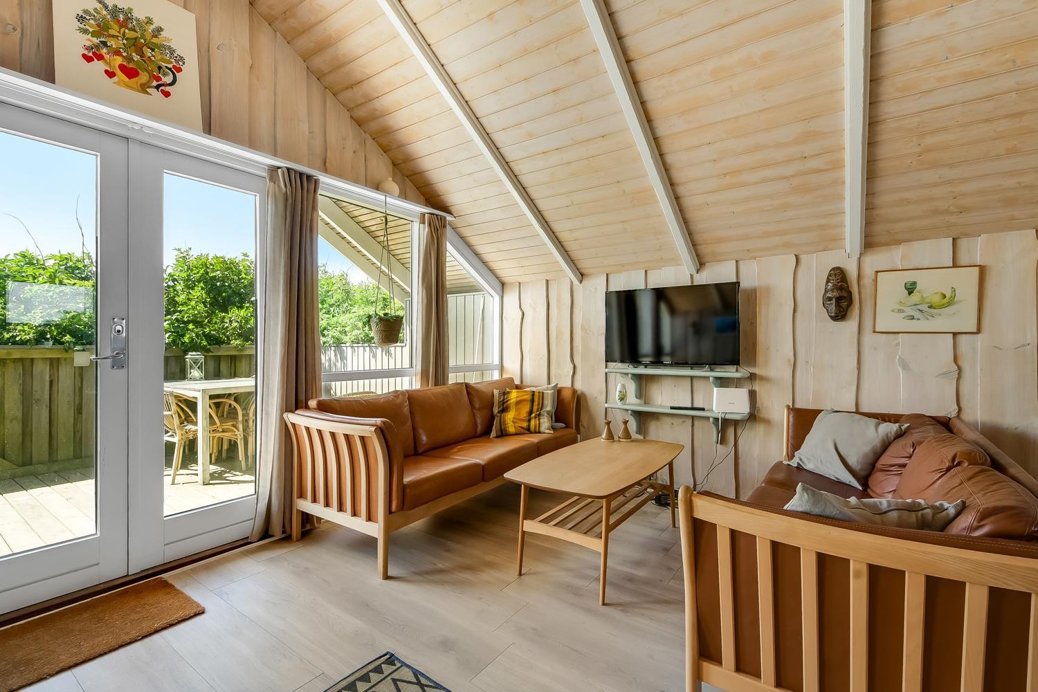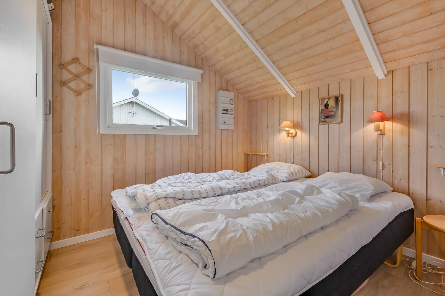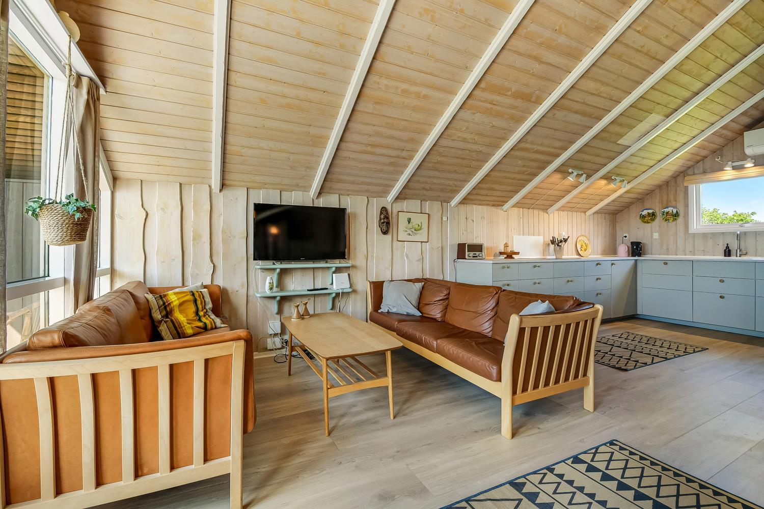 Pænt og hyggeligt indrettet feriehus til 5 personer på 71 m2. Kombineret køkken og opholdsstue med laminatgulv. Stuen en med polster og lædermøbler, en dejlig brændeovn som sammen med varmepumpen sørger for en behagelig varme samt en billigere forbrugsafregning. TV med danske og tyske kanaler, DVD og CD samt radio. Køkkenet er godt udstyret og indeholder en glas keramisk komfur, emhætte, køle-/fryseskab, opvaskemaskine og linoleumsgulv. Huset har 3 soverum: 1DS + 1DS + 1 sovesofa alle soverum er med laminatgulv. Badeværelse med toilet, håndvask, bruser samt flisegulv. Der er vaskemaskine og tørretumbler. Til de mindste gæster er der en barneseng. 1 husdyr er tilladt. Rygning er ikke tilladt.