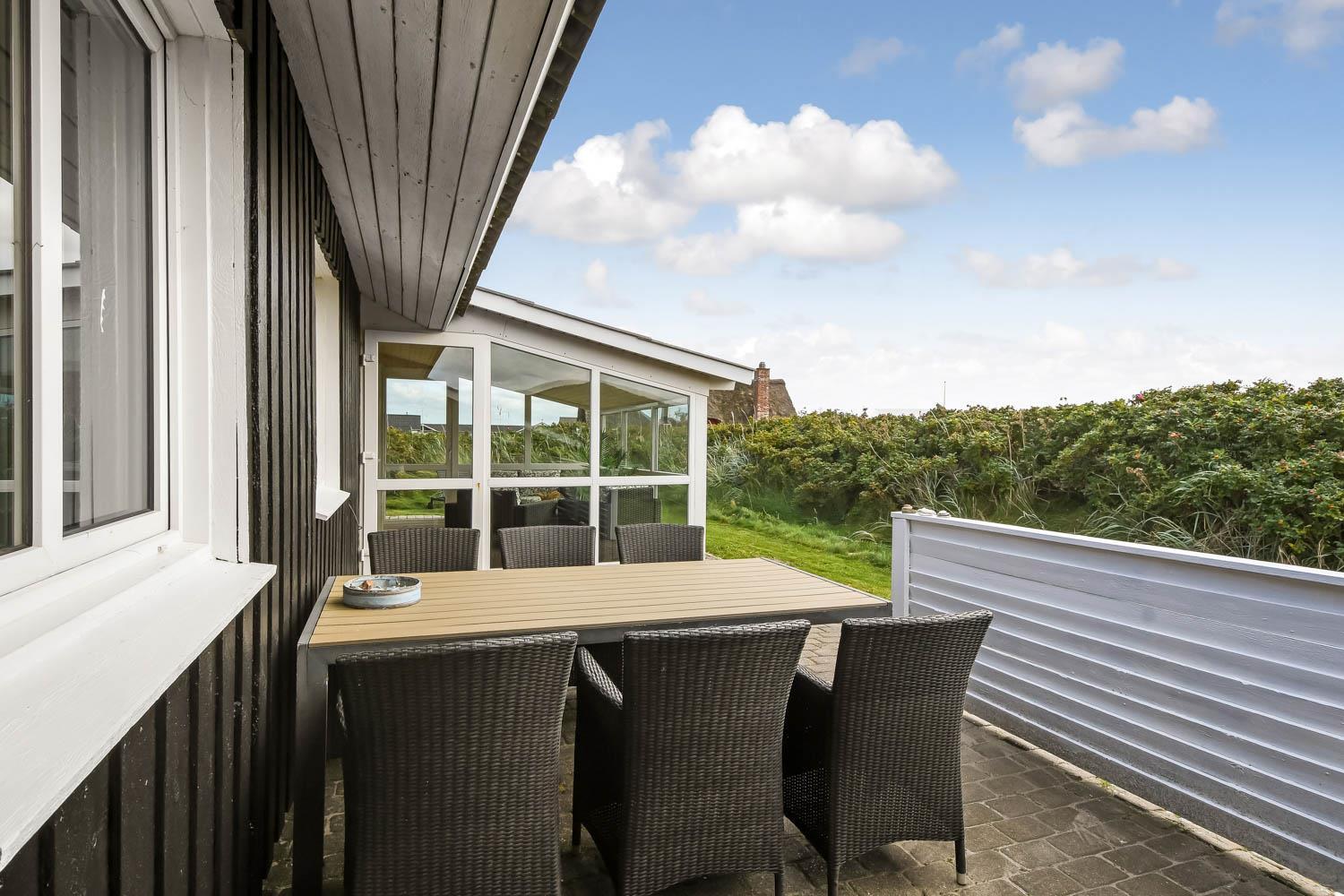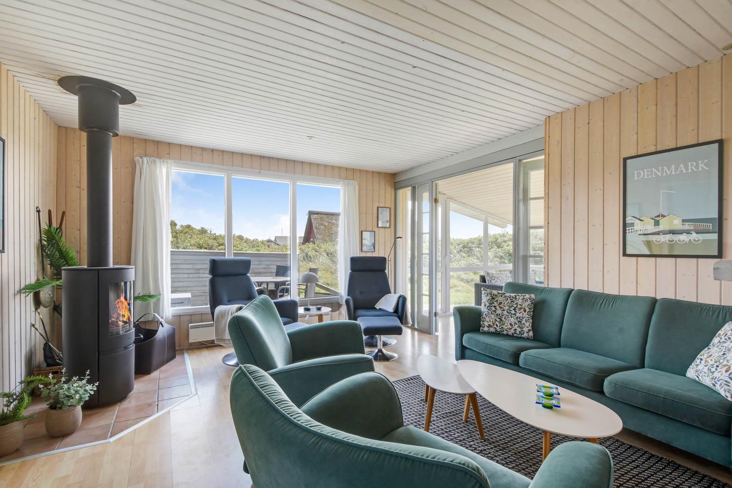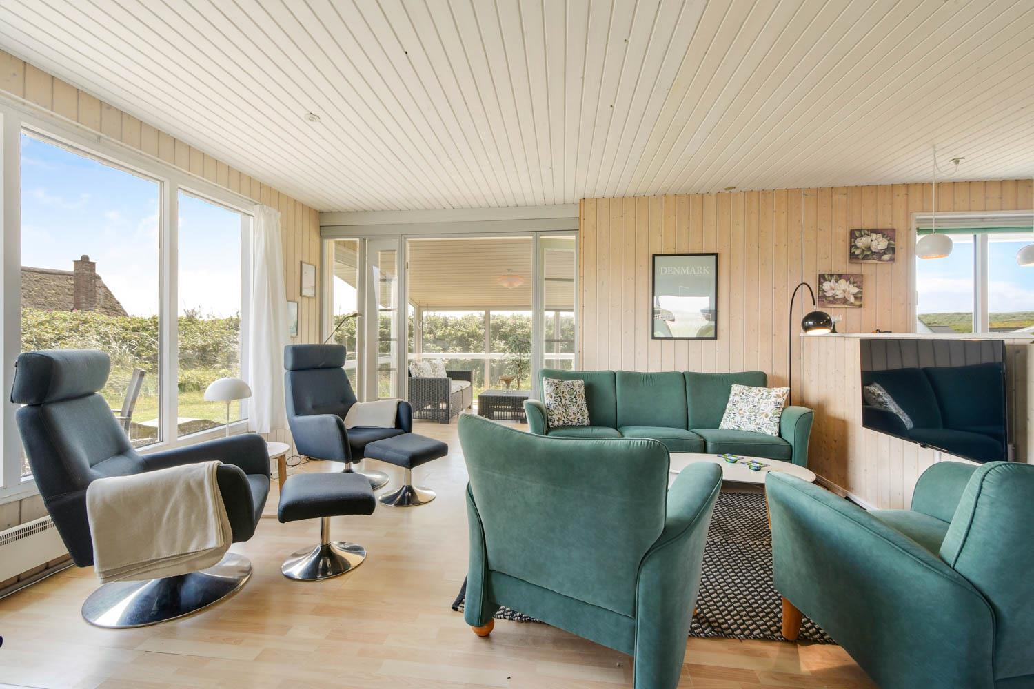 Udestuen er indrettet med Loungesæt. Derfra er der en fantastisk panorama udsigt til første klitrække.