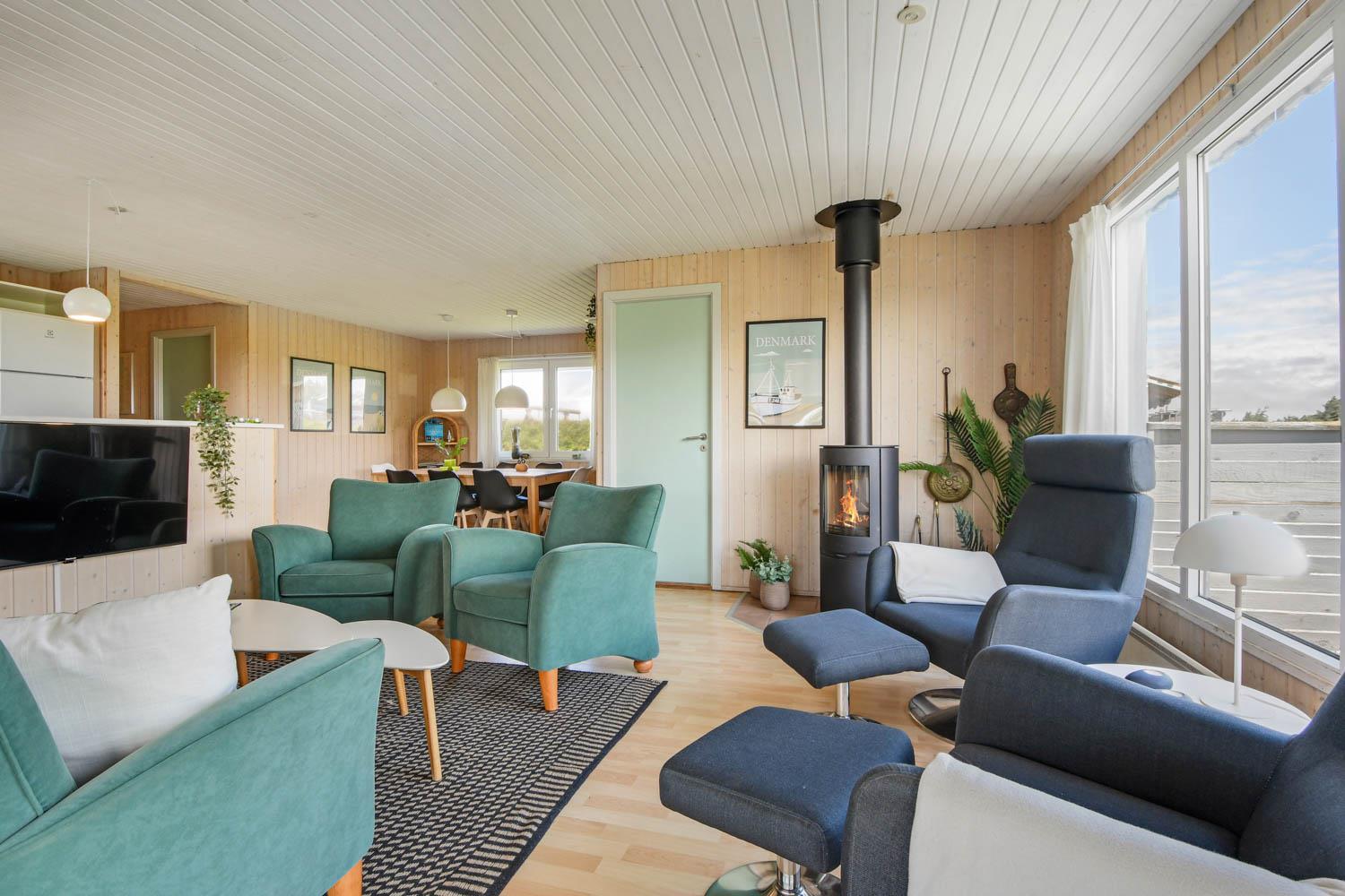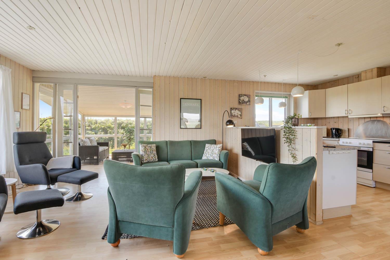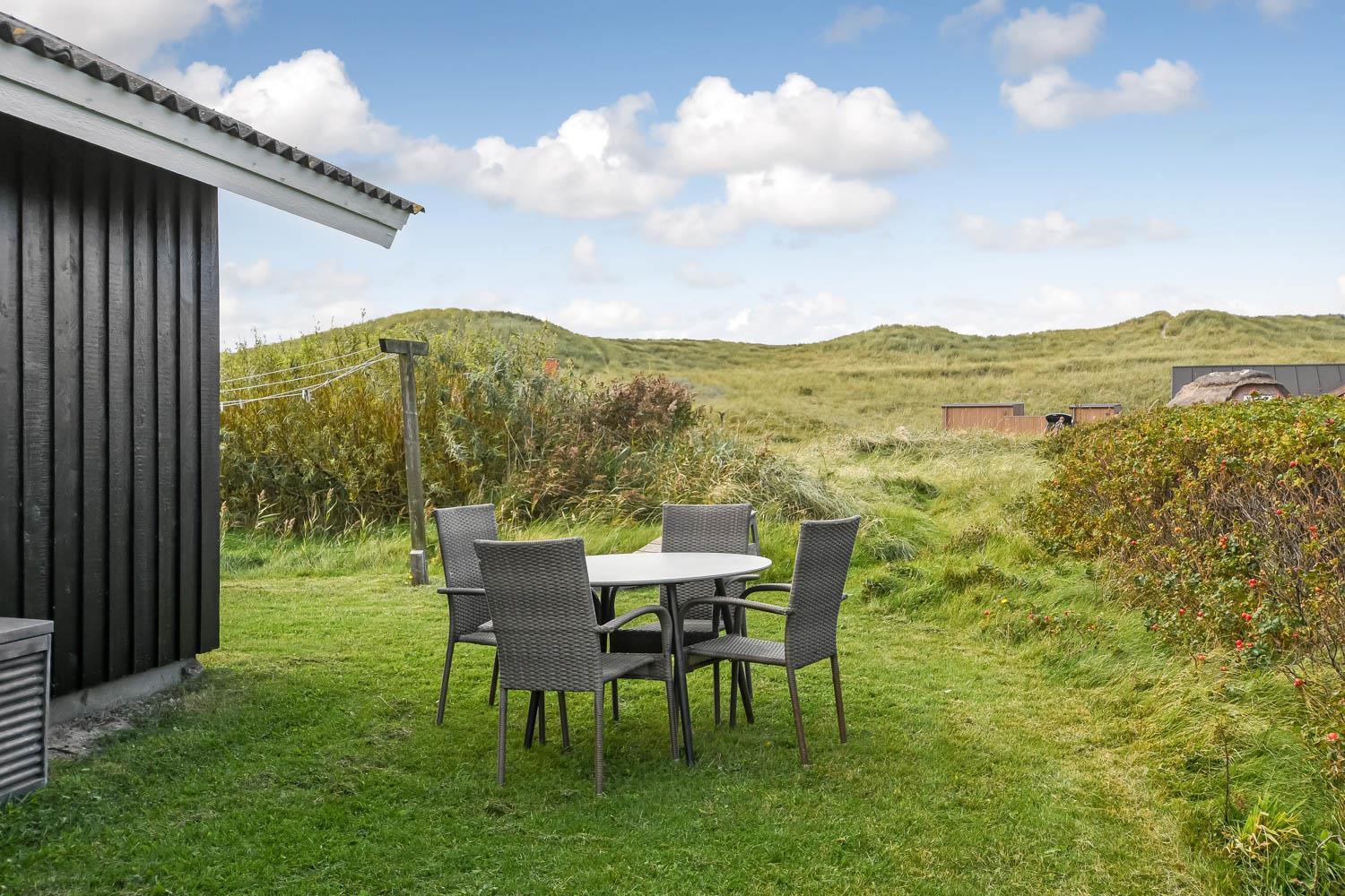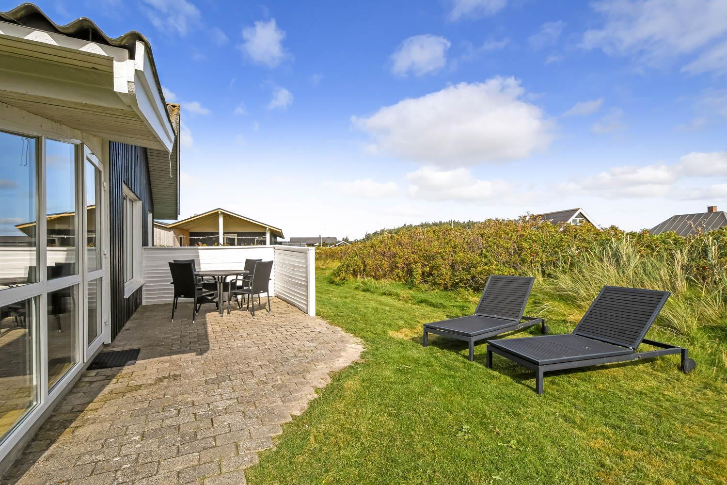 Udestuen er indrettet med Loungesæt. Derfra er der en fantastisk panorama udsigt til første klitrække.