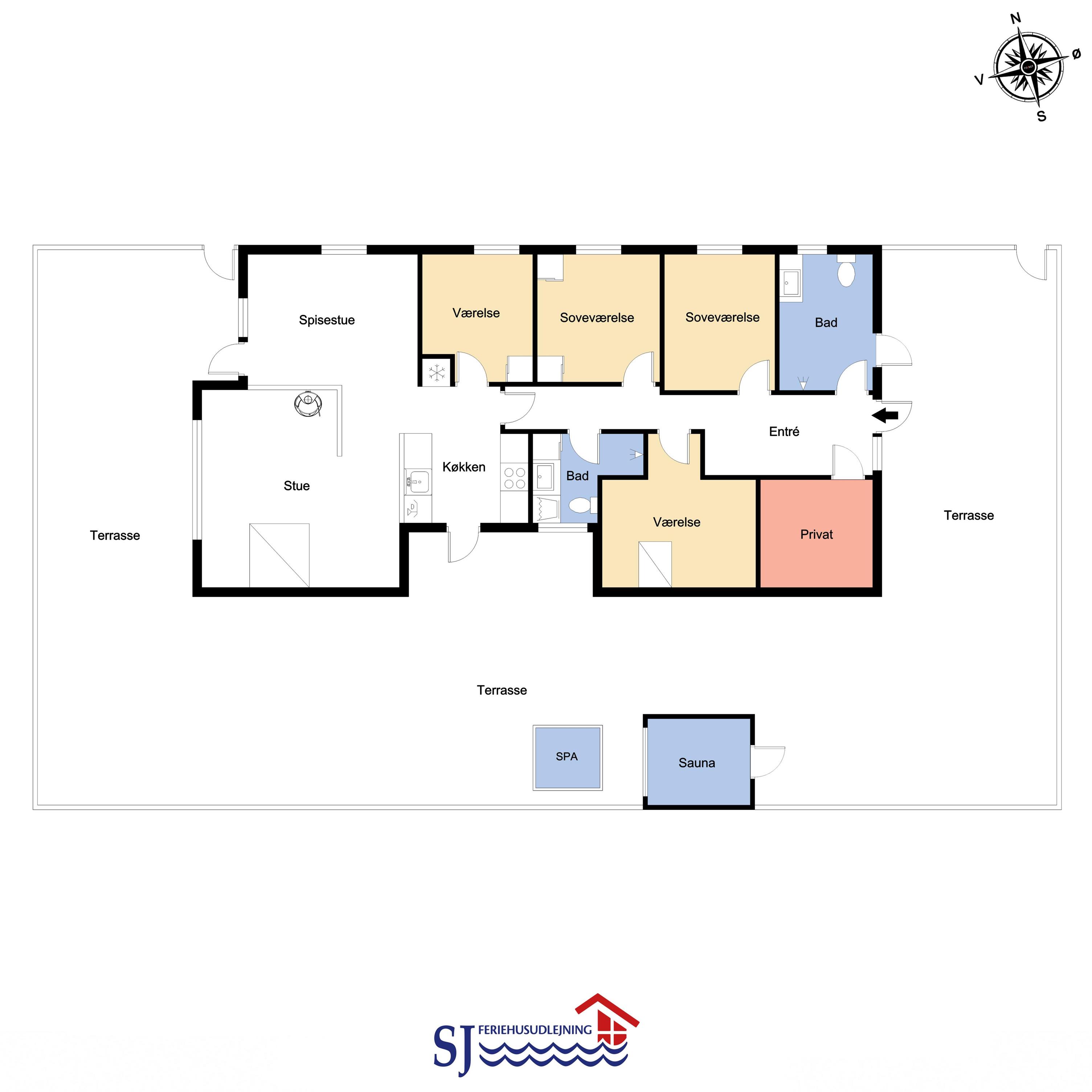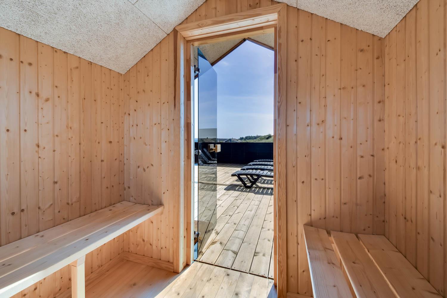 Der er masser af plads på den 1350 m2 store klitgrund, og på det pragtfulde terrasseanlæg er der masser af muligheder for en plads i solen eller måske i skyggen. Også her er udsigten unik og der er tænkt på det meste. Grill, havemøbler og solvogne. En tur i den udendørs spa eller i den udendørs sauna gør oplevelsen unik og specielt på de mørke aftener med den klare stjernehimmel. En unik oplevelse som er ren terapi for sjæl og krop. Huset ligger på en af de bedste grunde i Velby Klit for enden af en grusvej. Fra grunden kan man via en sti igennem klitterrænet nemt gå direkte over klitten til Vesterhavet som blot ligger 75 m væk fra huset. Således er der ikke langt til strandfornøjelser såsom badning, drageflyvning, lystfiskeri eller vandreture i den friske luft, hvor man til tider kan blive blæst helt igennem. Vesterhavet vandkant ligger blot 75 m fra huset. Herudover ligger huset tæt på en af Vestjyllands smukkeste cykel-/vandre ruter der bl.a. byder på mulighed for at se både sø og hav på samme tid samt tæt på indkøb og restaurant. Nærmeste sæsonåbne købmand ligger kun 400 meter ved Vejlby Torv som også byder på en cafe / spisested. Vi anbefaler også gerne et besøg i havnebyen Thyborøn 15 km nord for sommerhuset eller den gamle købstad Lemvig 13 km mod øst. Dette hus tilbyder unik beliggenhed og udsigt og er velegnet til parret eller familien, der vil bo tæt på havet på en dejlig klitgrund og som ønsker en helt speciel oplevelse de aldrig glemmer.