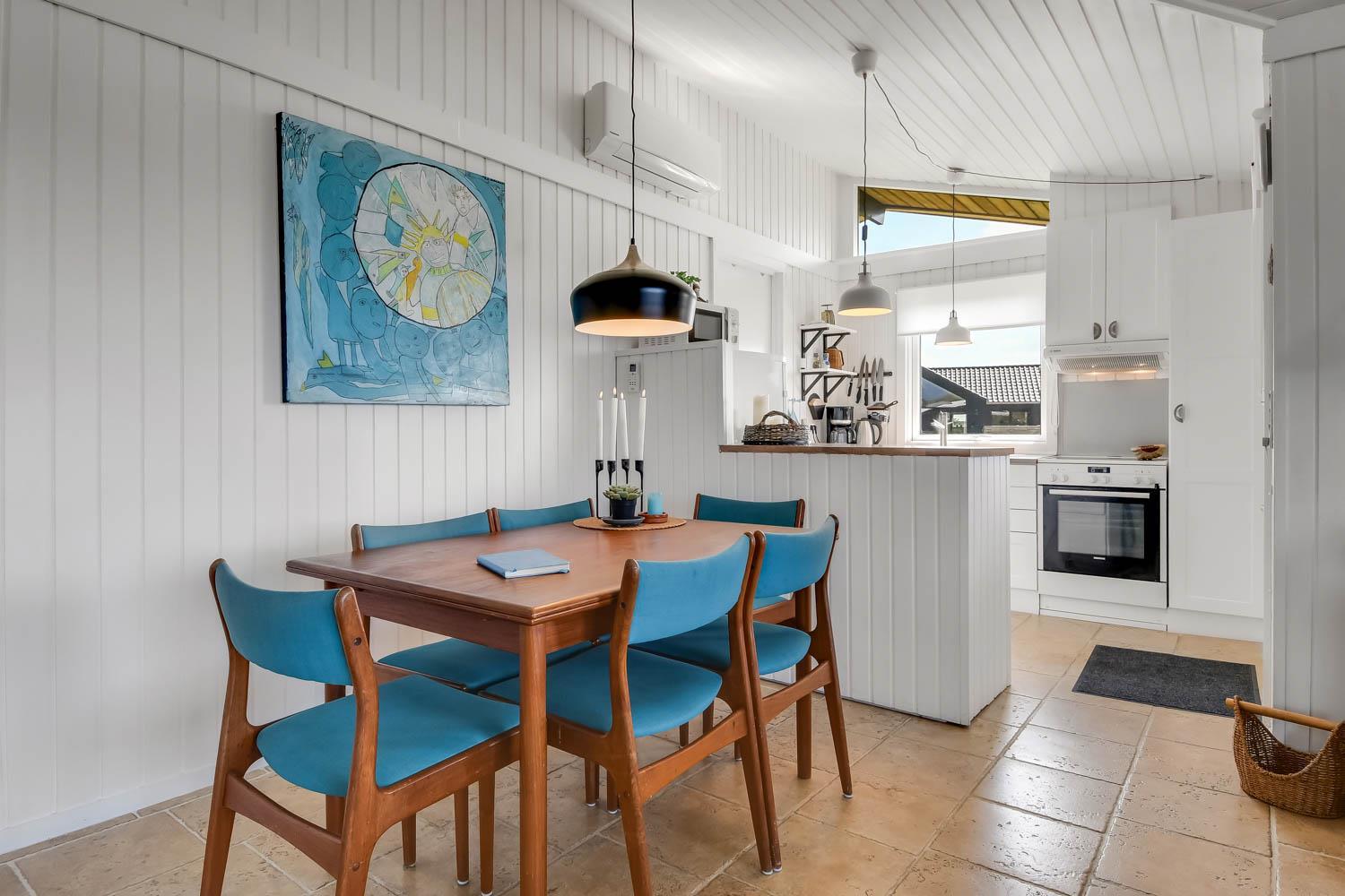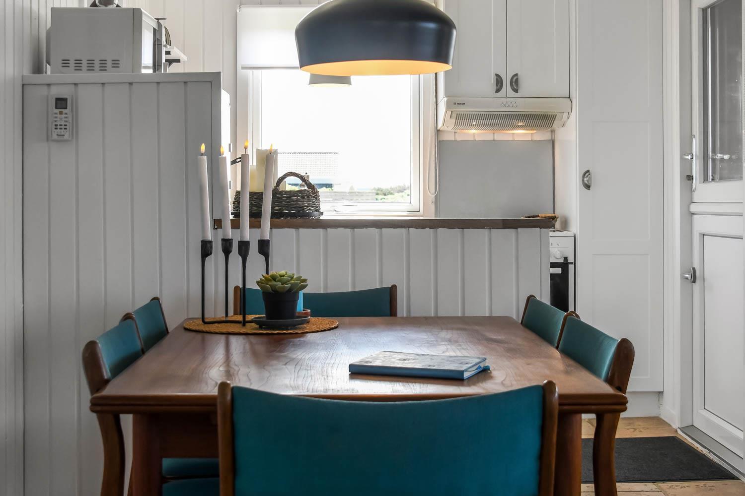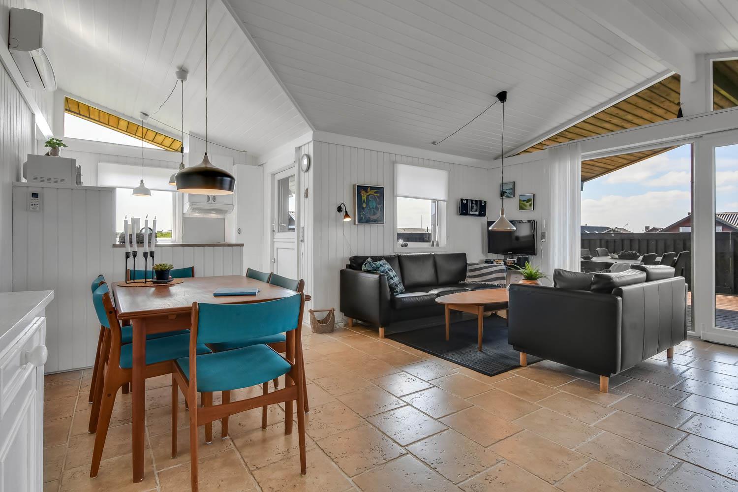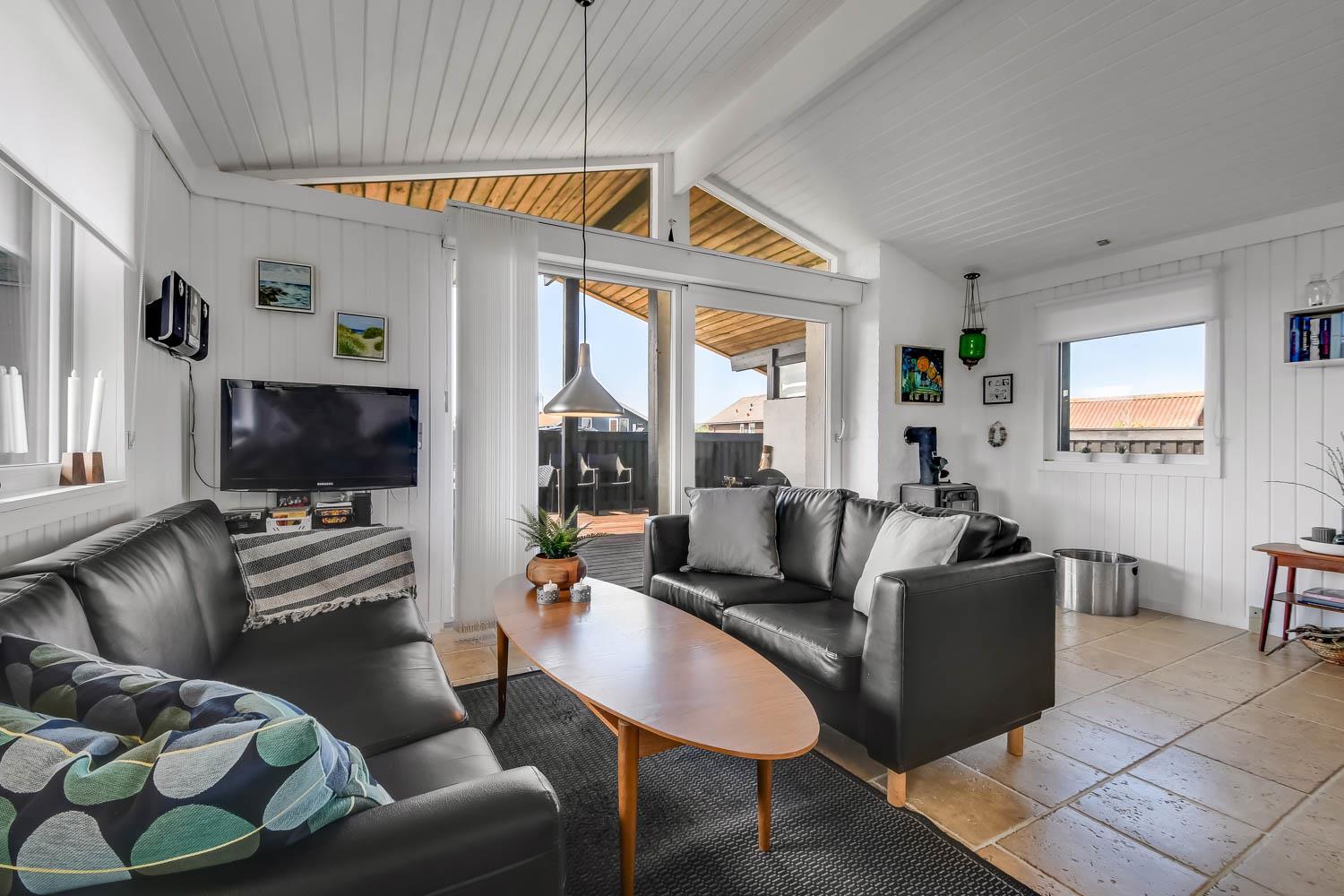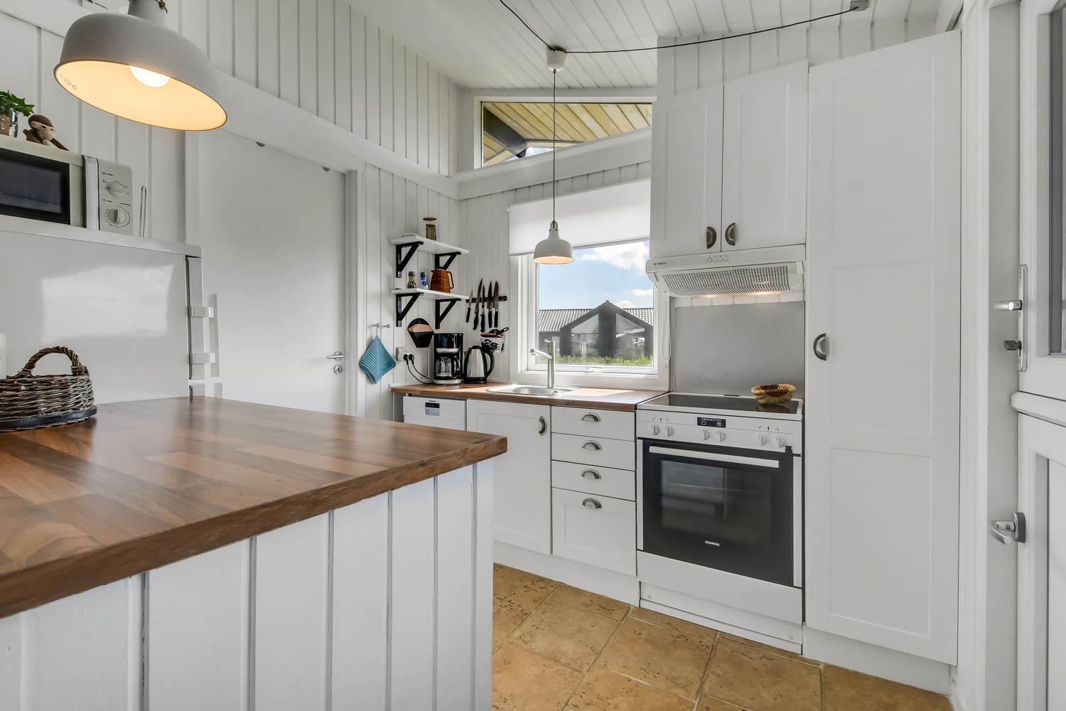 Huset er meget velholdt og dejligt indrettet og indeholder en stue som er kombineret med køkkenet. Køkkenet er godt udstyret og indeholder glaskeramisk komfur, køle-/fryseskab, opvaskemaskine og mikroovn, der er klinkegulv i køkkenet. Stor åben stue med stort vinduesparti som sørger for et godt lysindfald i hele rummet. Stuen er indrettet med lædermøbler, spisebord med stole og TV med danske og tyske programmer, CD-afspiller, gulv i stuen er klinker. Desuden er der en dejlig brændeovn og en varmepumpe som giver en behagelig og hyggelig varme, og er medvirkende til en billiger forbrugsregning. Der er 3 gode soverum i huset: 1DS + 1DS + 2S, der er gulvtæppe i soverummene. Badeværelse med toilet, håndvask og bruserbabybadekar og puslebord. Der er 1 barnestol til de mindste gæster. 1 husdyr er tilladt. Ikkeryger hus.
