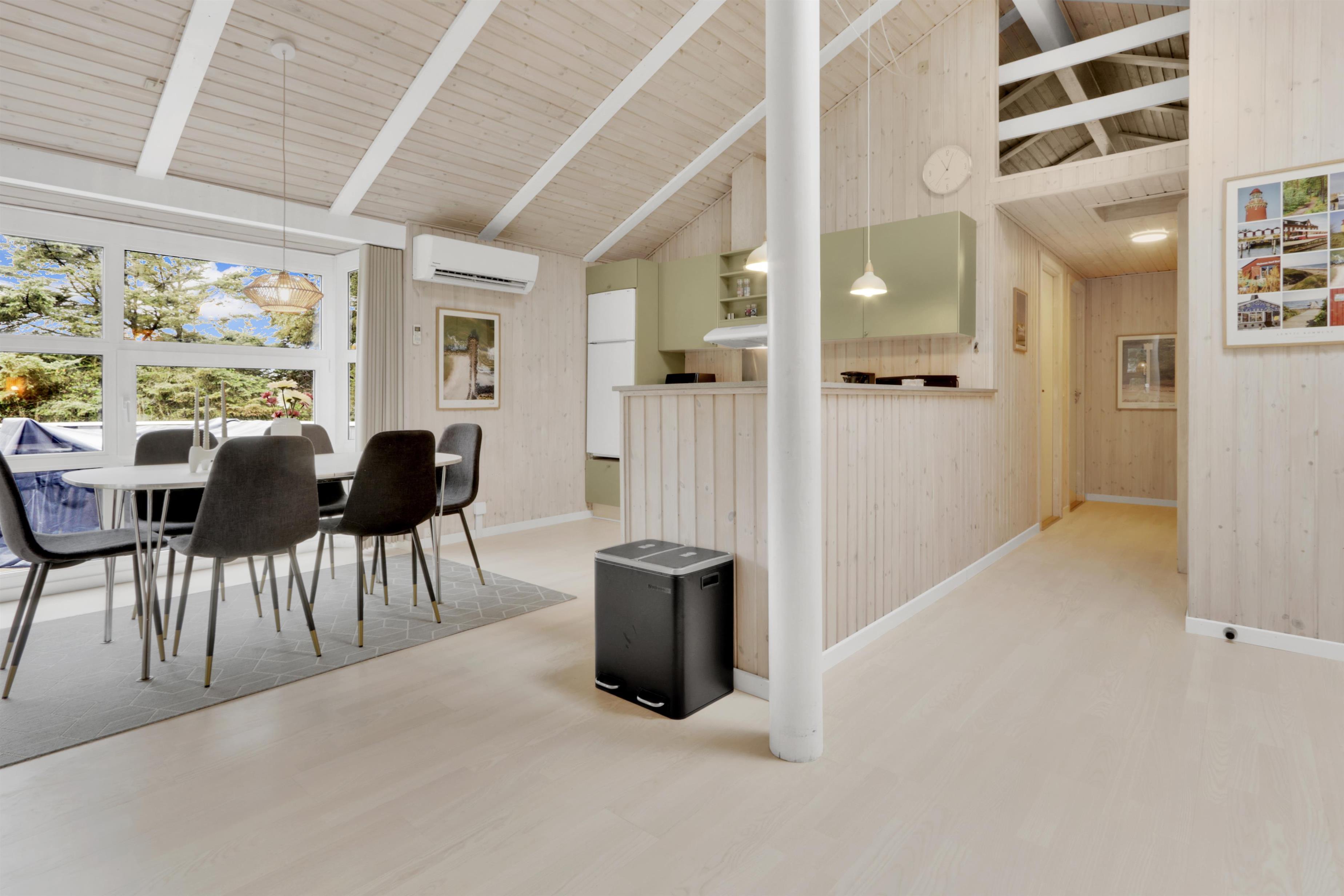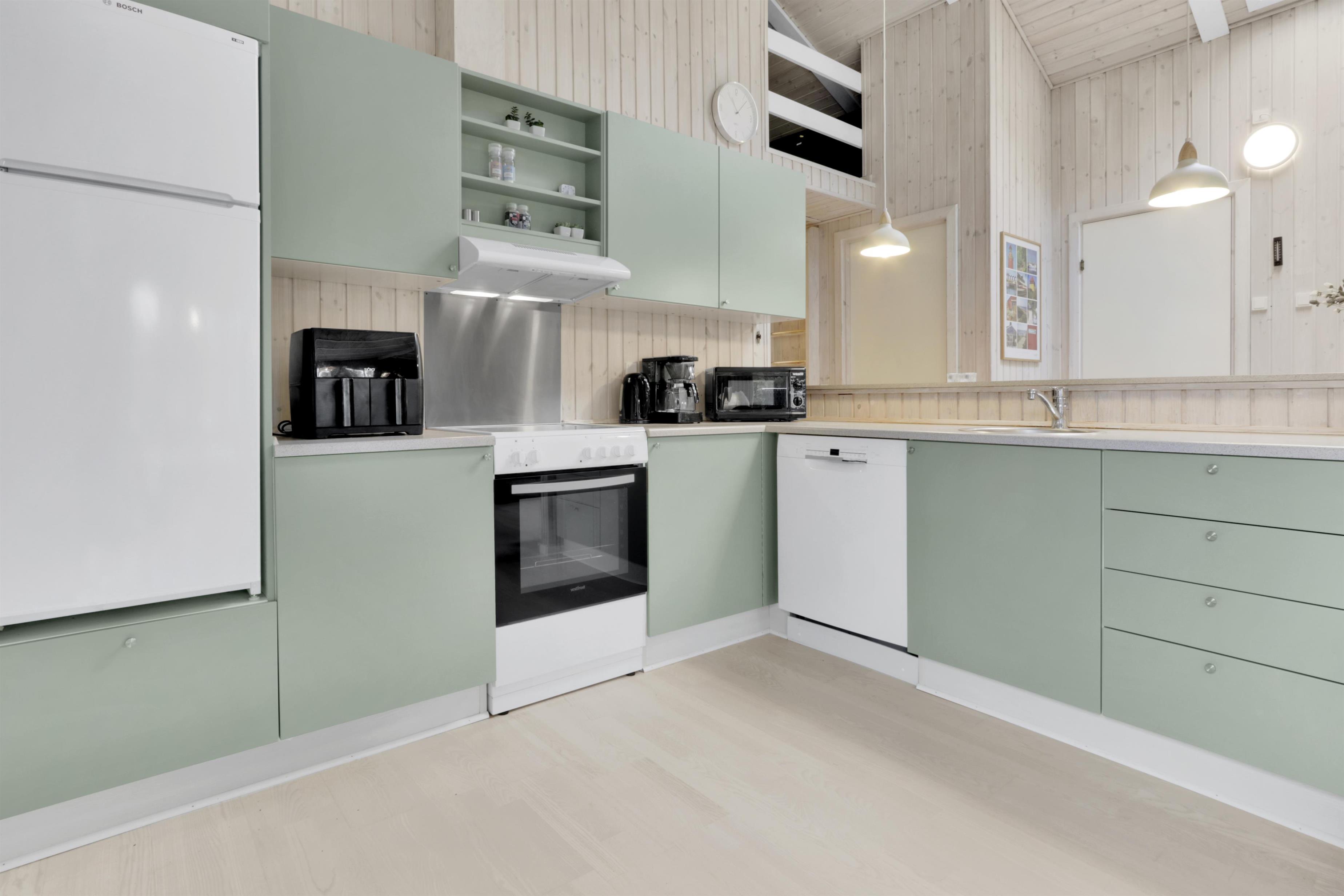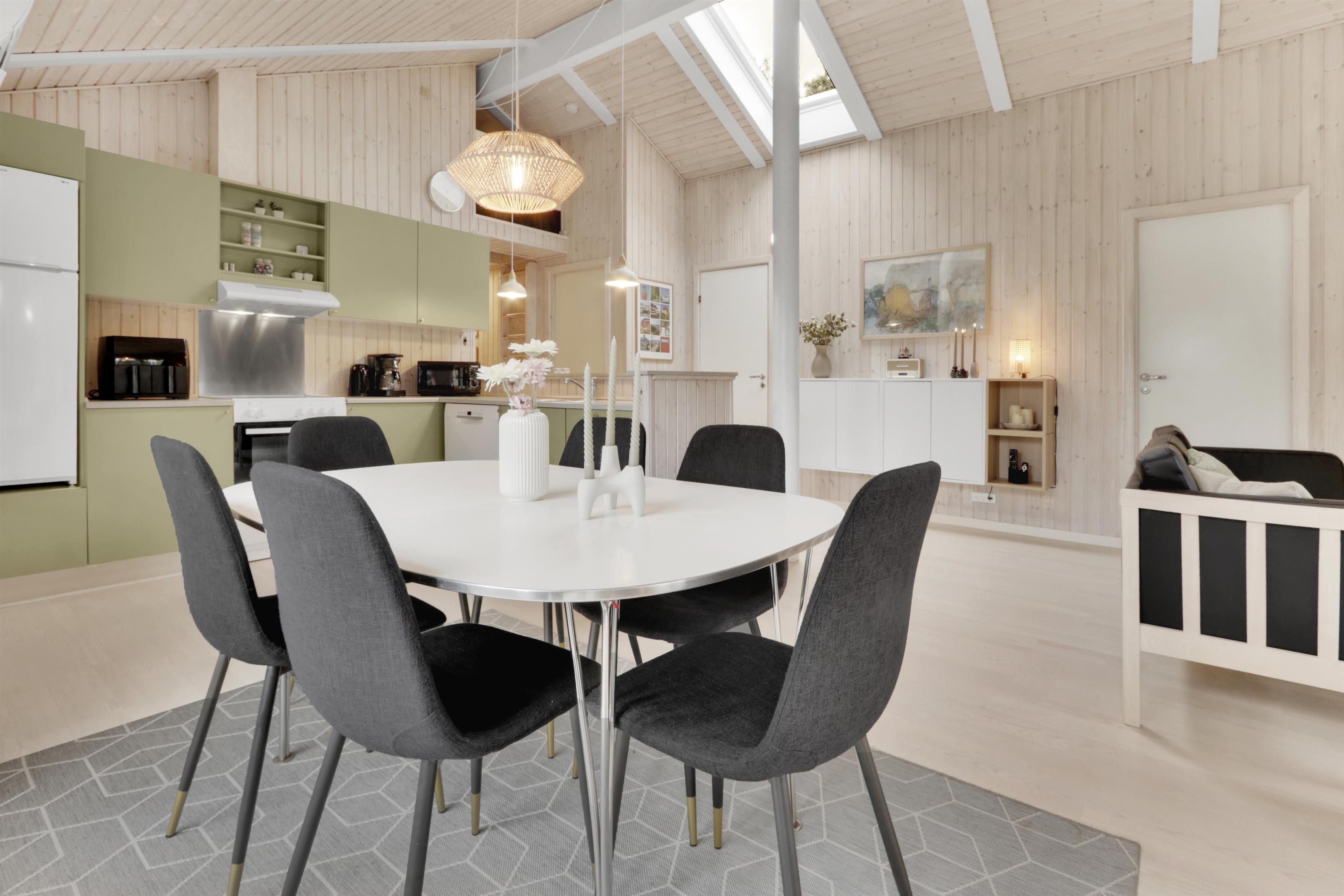 Køkkenet er fuldt udstyret med alt, hvad I behøver for at lave lækre måltider: opvaskemaskine, mikroovn, airfryer, komfur med ovn, køle-/fryseskab og meget mere. Spisepladsen ligger i forlængelse af køkkenet, så I kan nyde maden sammen i hyggelige omgivelser.