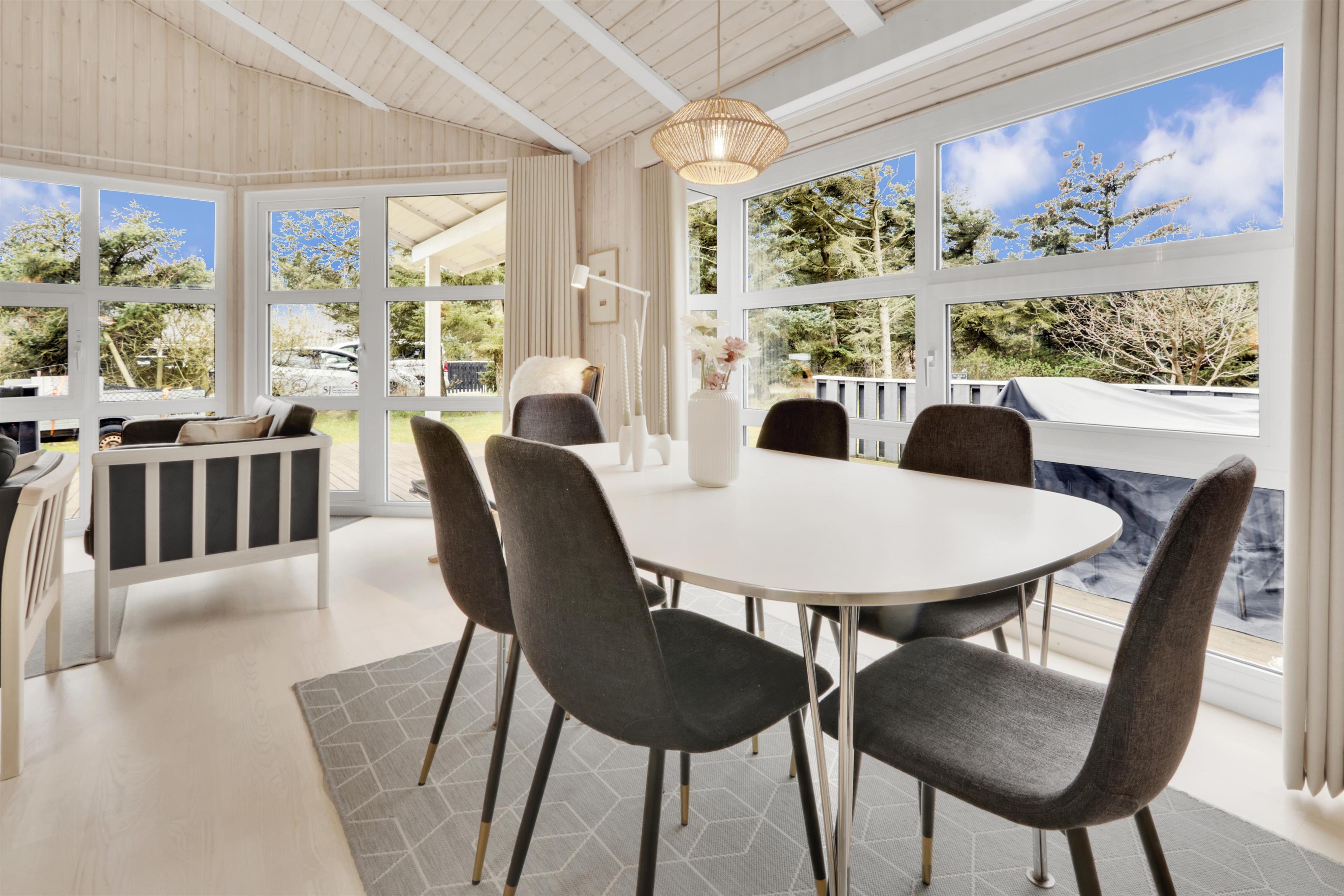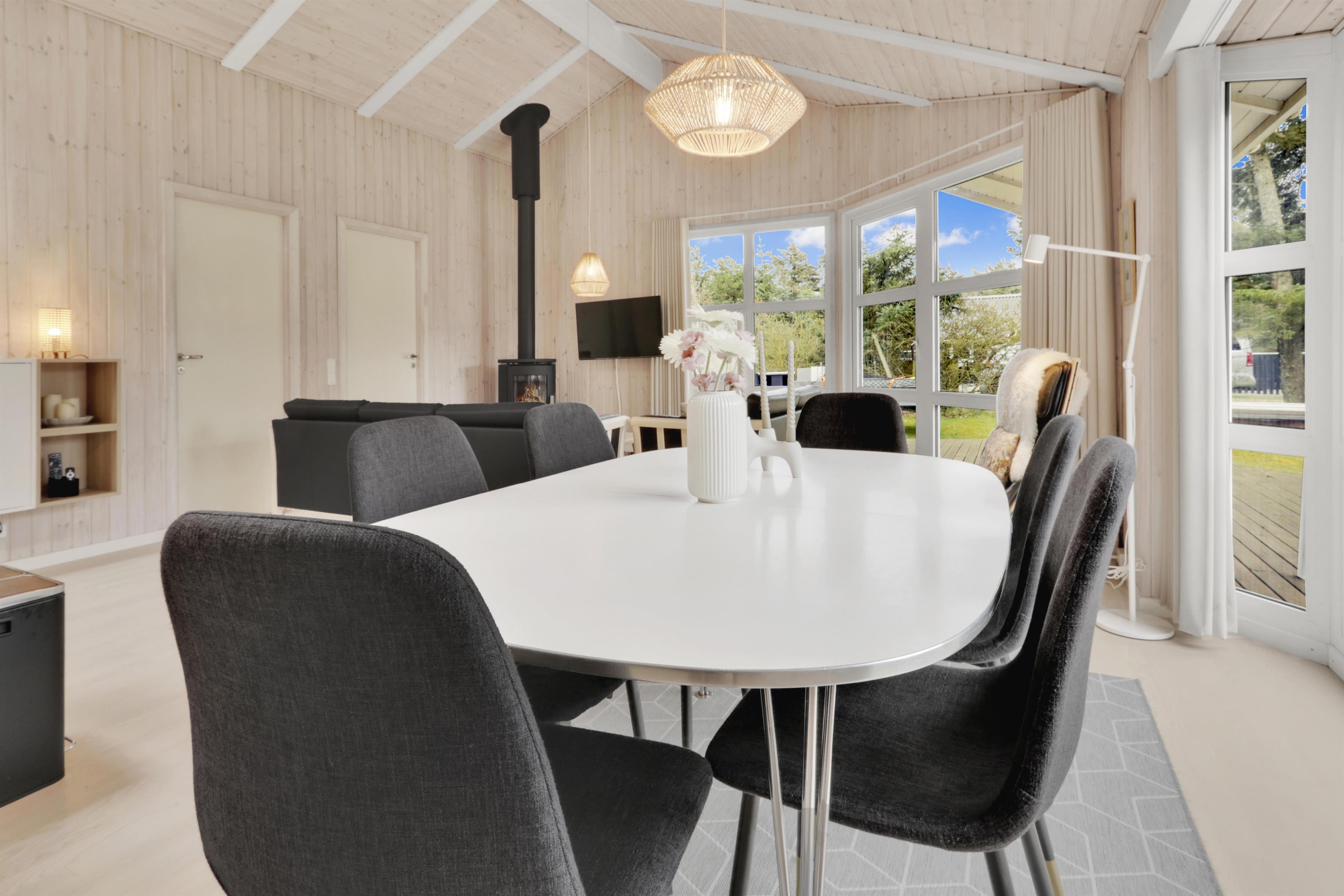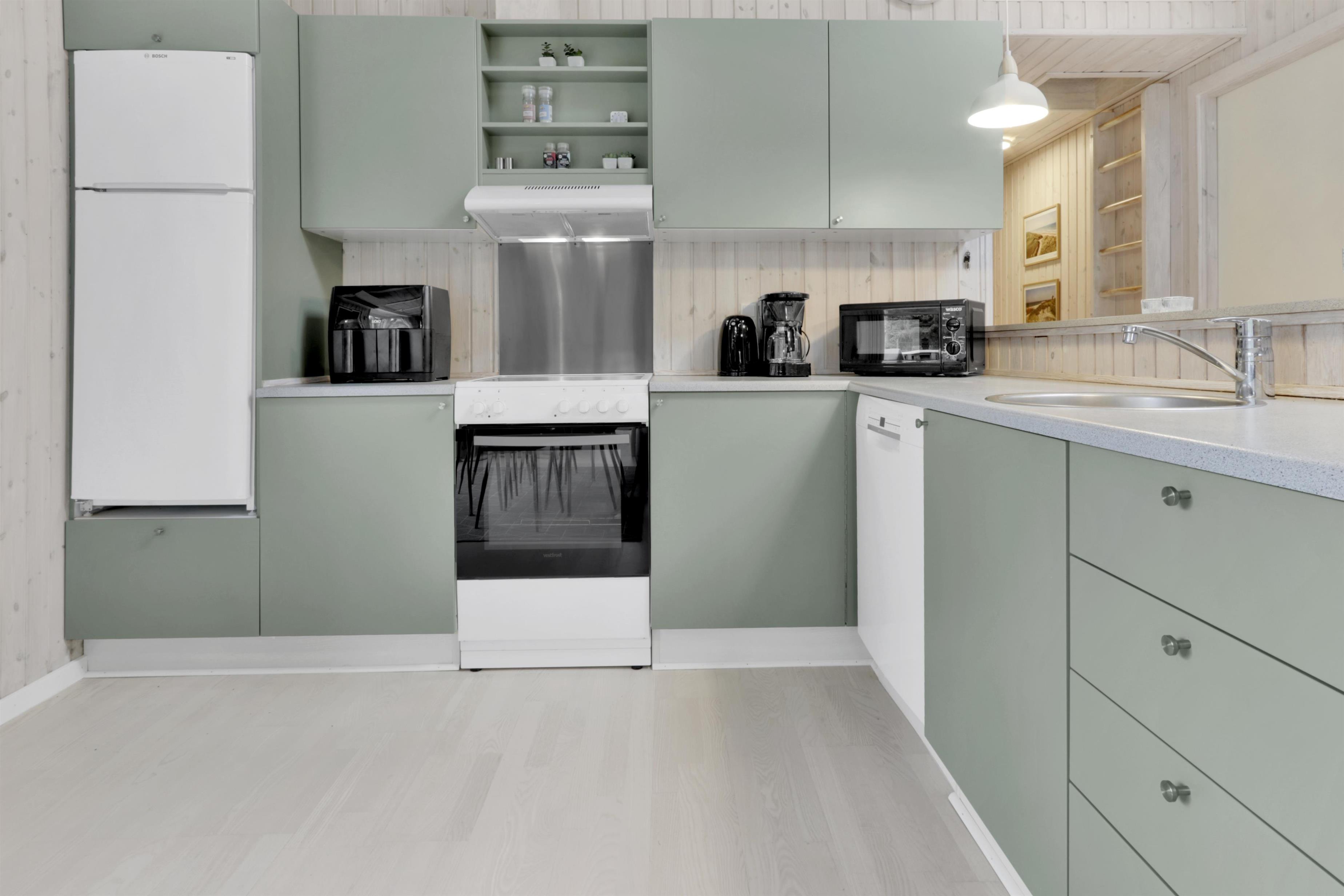 Køkkenet er fuldt udstyret med alt, hvad I behøver for at lave lækre måltider: opvaskemaskine, mikroovn, airfryer, komfur med ovn, køle-/fryseskab og meget mere. Spisepladsen ligger i forlængelse af køkkenet, så I kan nyde maden sammen i hyggelige omgivelser.
