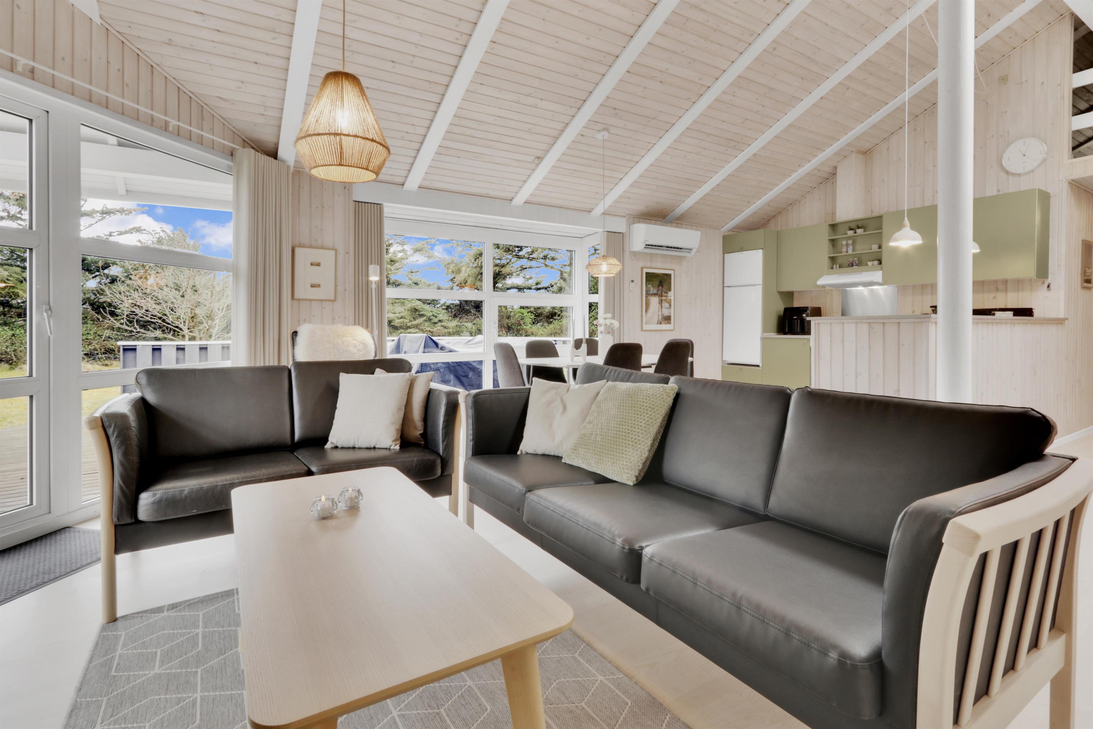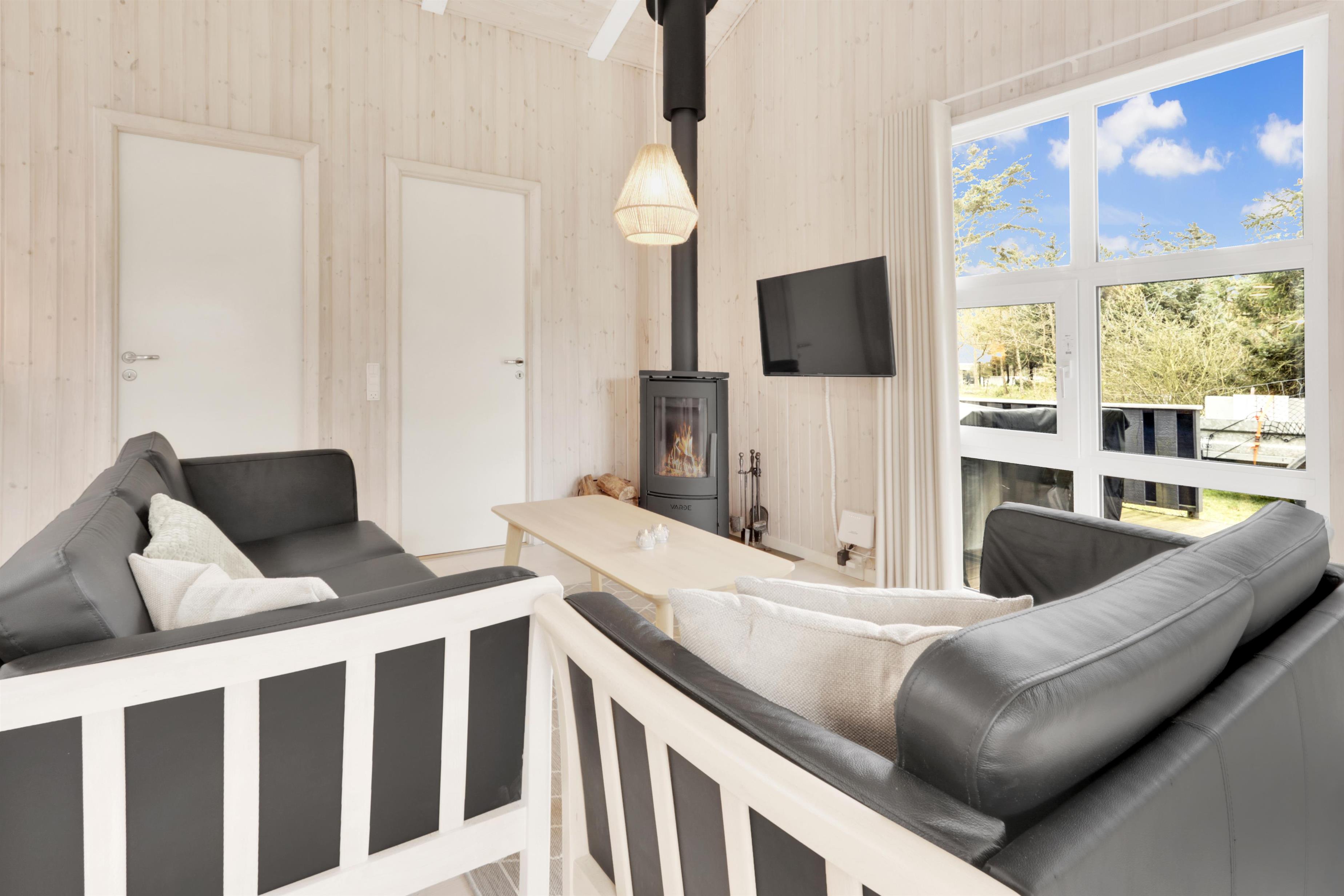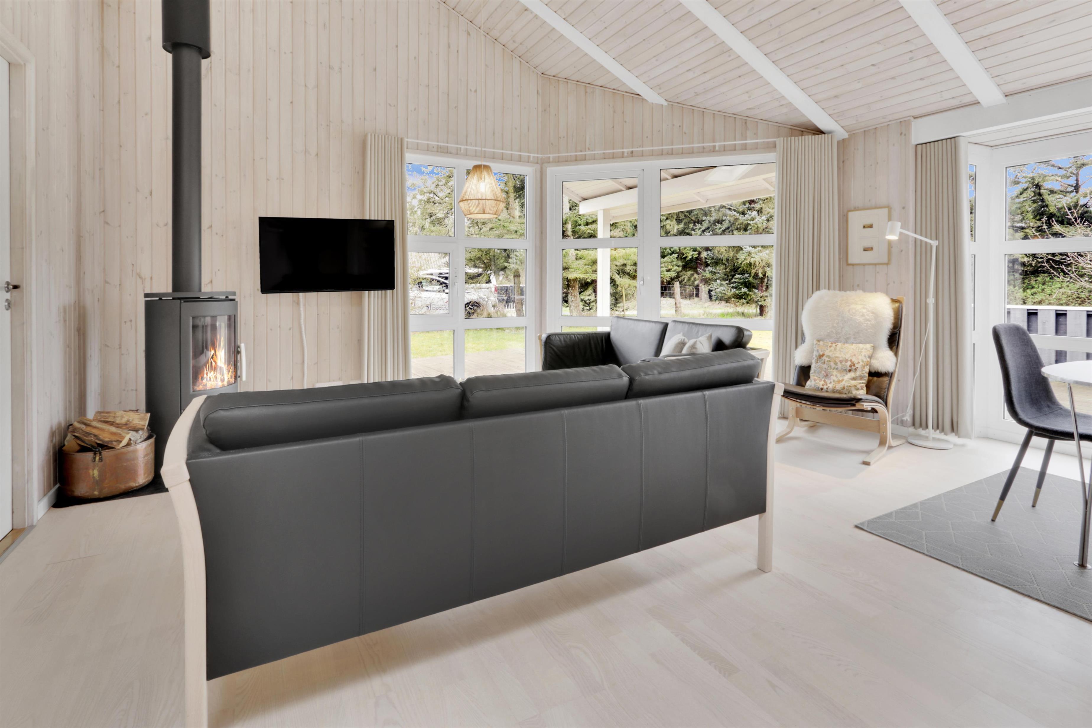 Den lyse og venlige opholdsstue indbyder til afslapning med komfortable lædermøbler, en knitrende brændeovn og et TV med danske og tyske kanaler. En effektiv varmepumpe sikrer et behageligt indeklima året rundt.